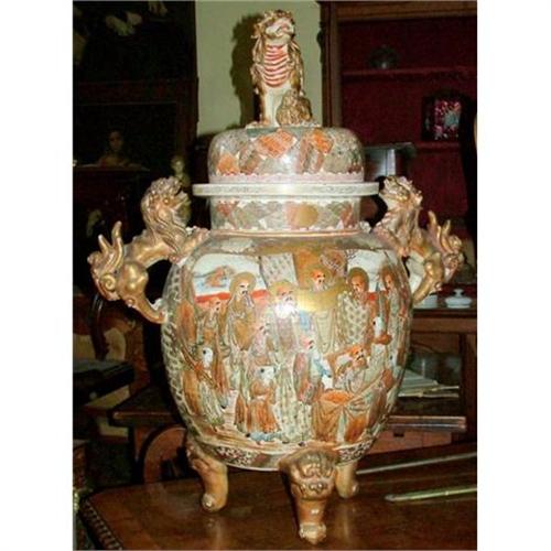 Exceptional Meiji Satsuma tripod jar & cover, very important size of 40"h (with cover on). And 31 inches wide, ovoid form , Inset dome cover, shishi knop and prominent handles repeating this motif , desirable Thousand Faces design, The surface is richly painted with figures accented by high relief moriage work. It is free of cracks, important chips or repairs, gilding in good conditions, it has no signature or mark, on it , during the Meiji, Japanese craftmen , did not believe they were making a part of History , or believe there pieces would be collectibles.
