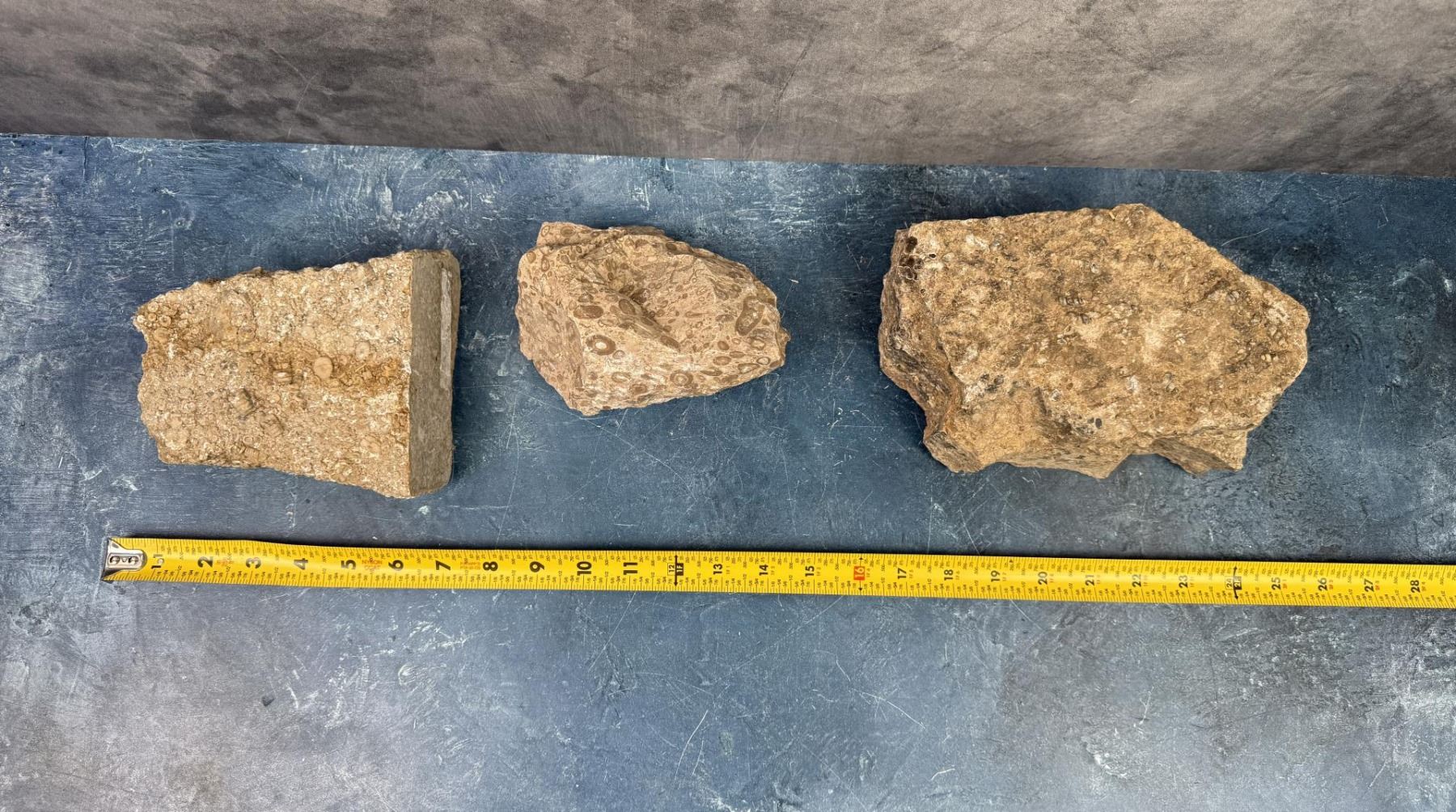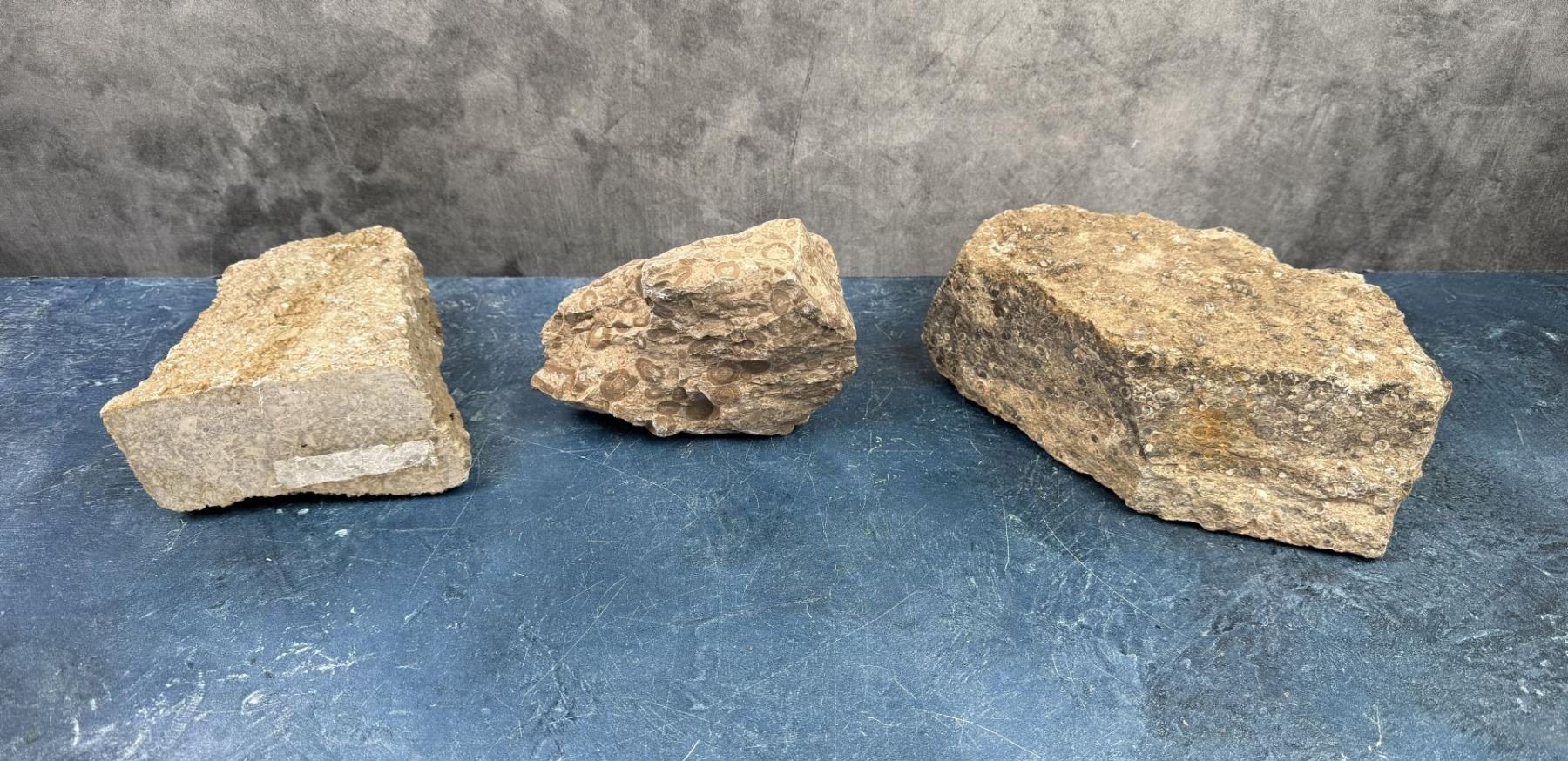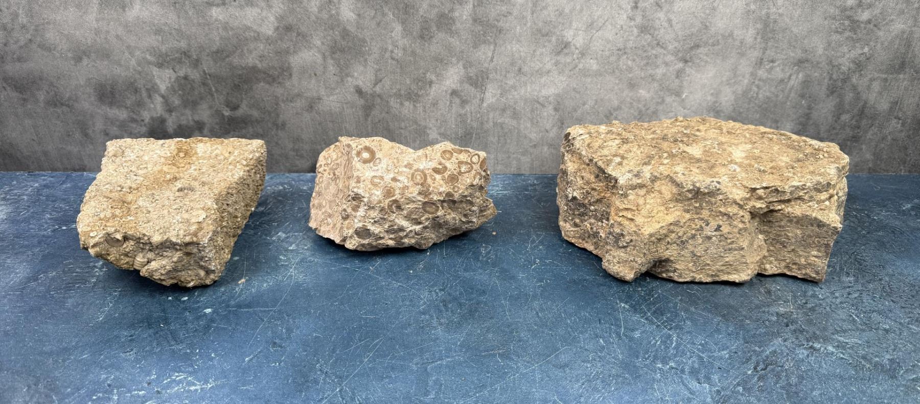 Three large pieces of fossilized sea floor debris. 16.8 lbs total weight. Provenance: From the estate of Moosehead Gallery rock shop in Hamilton, Montana.