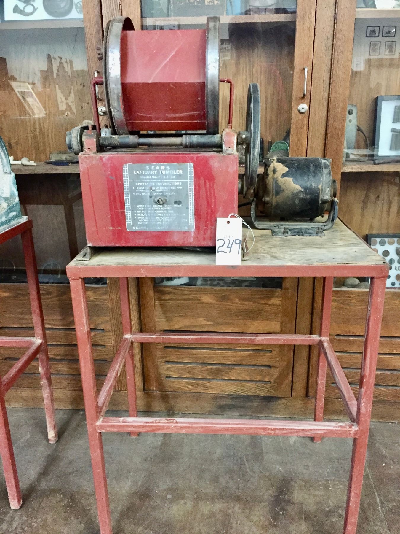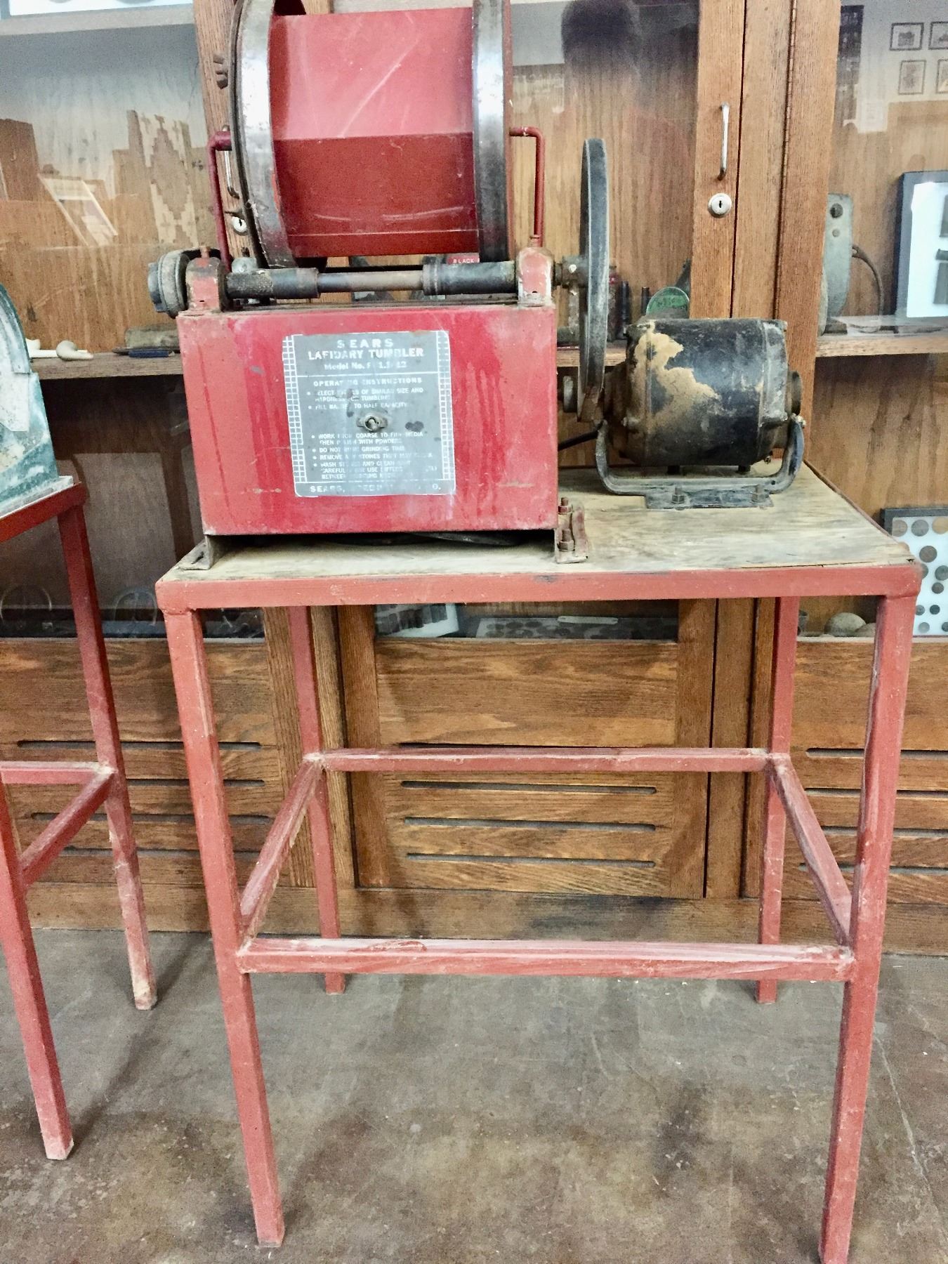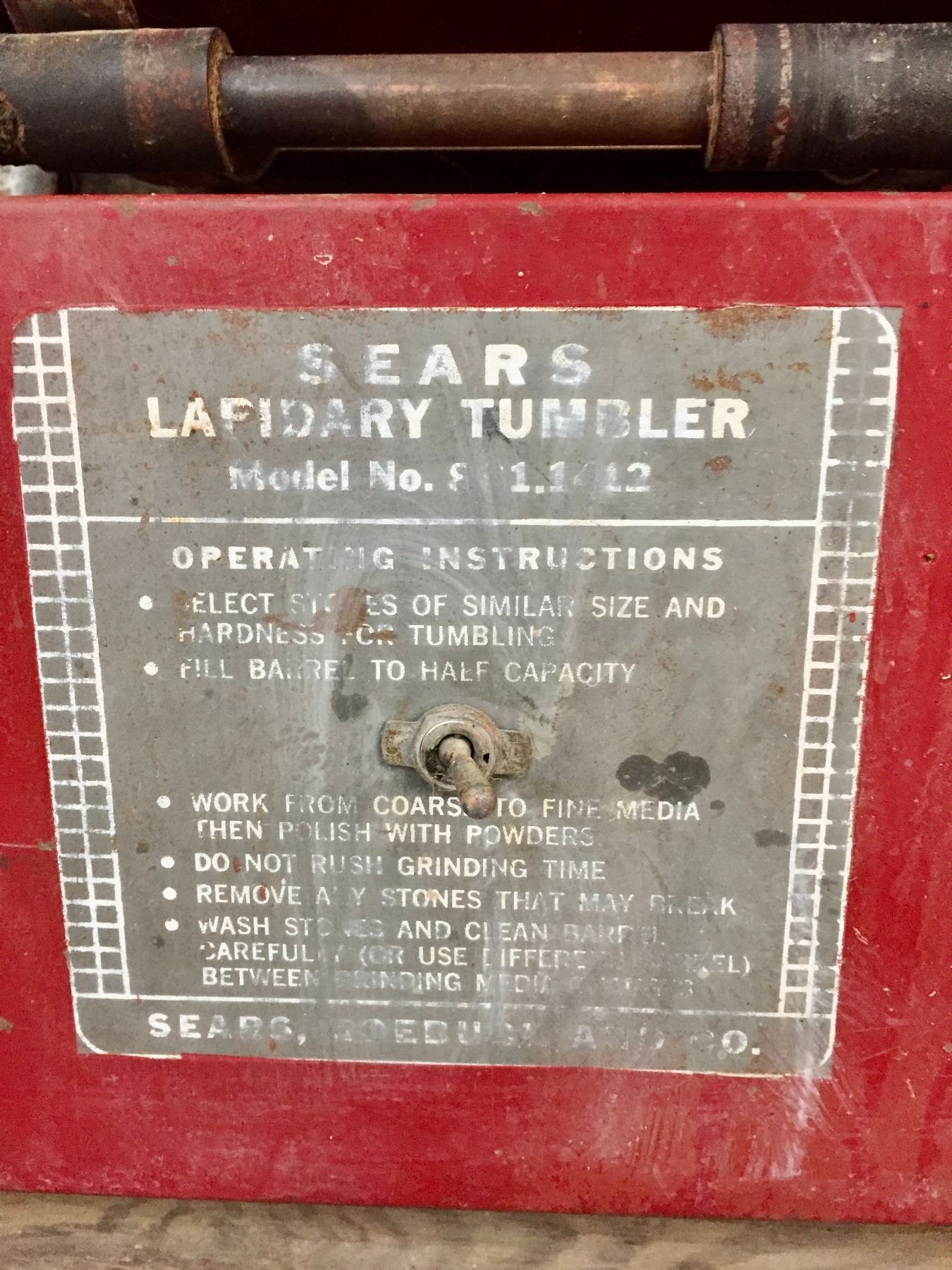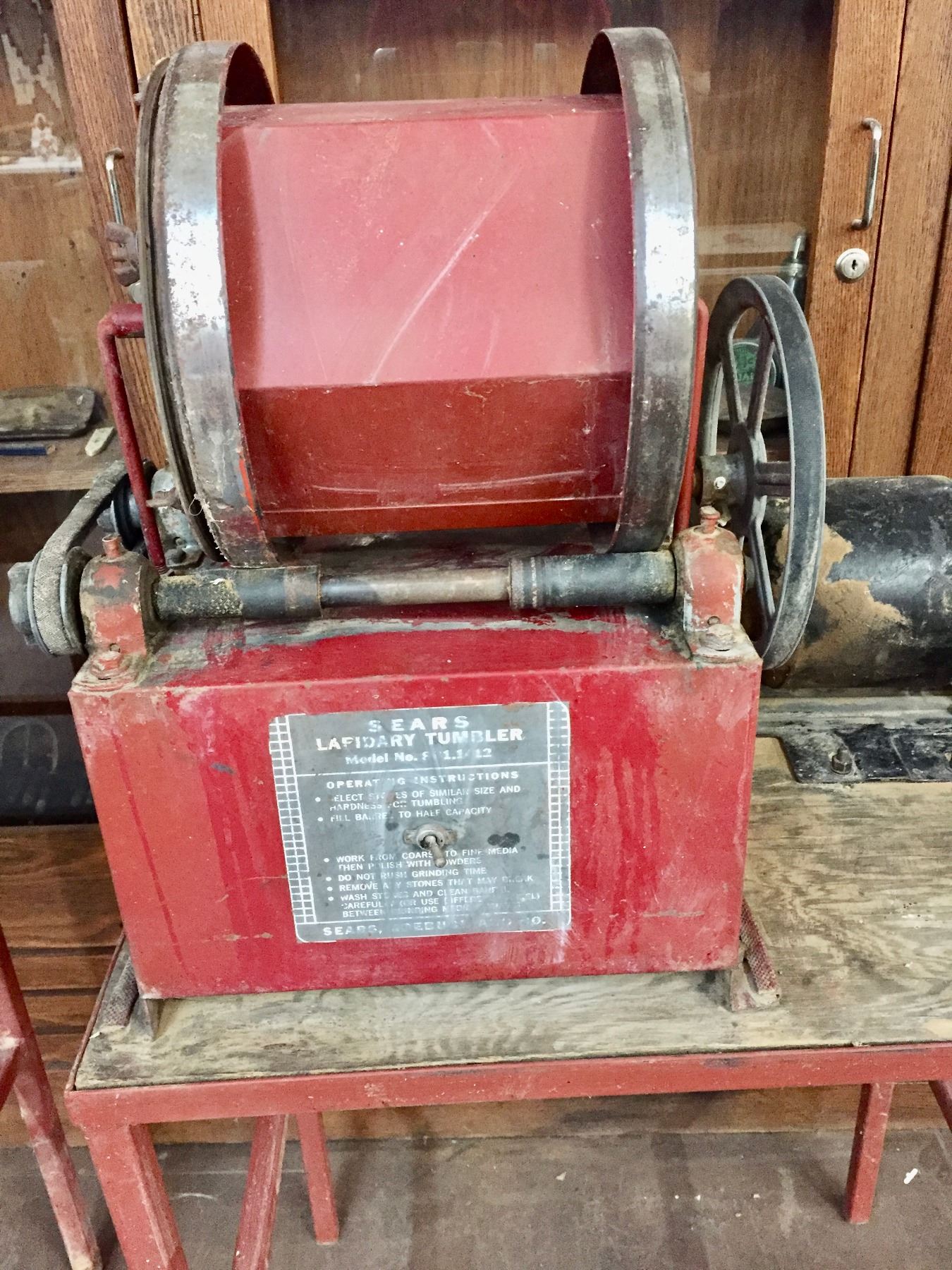 Description: Offered for sale in this lot is a large, Sears brand Lapidary Tumbler with stand. This is a pretty large one and it seems to work fine when plugged in.                                                                                                          Maker: Sears.                                                                                                                  Approx. Age: ???                                                                                                            Size: 26”w x 18-1/2” Deep x 51” tall (with stand).                                                                                                                                                                                                                                 Condition: Pretty good for its age, some wear expected.                                                                                                                Please look closely at the pictures - they are an important part of our description.                                Shipping: There will be no shipping this lot. Local pickup only or arrange your own shipping.