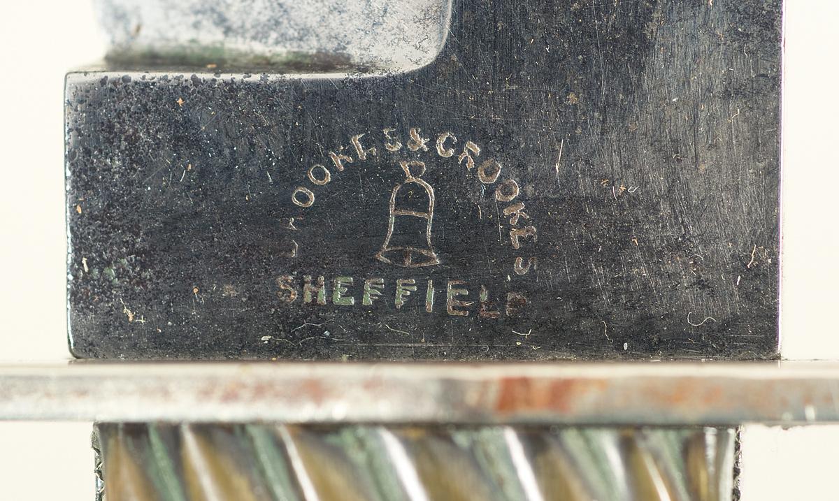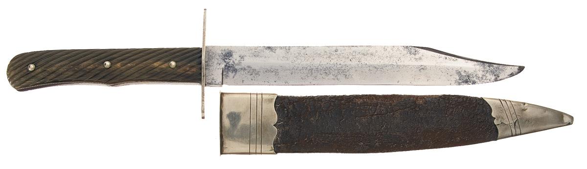 Operating out of Sheffield's Atlantic Works starting in 1864, records showing the firm of Brookes & Crookes active in the late 1910's. Blade is 8 3/4 inches long, with a semi-sharp back clip and the left ricasso marked "BROOKES & CROOKES" in a semi-circle over a bell and "SHEFFIELD". Full length tang, nearly full width and thickness, with a silver dual quillion guard, textured border decoration, light finger groove and a pair of silver pinned ribbed horn grips. With a brown leather sheath, fitted with a silver stud, throat and tip.
