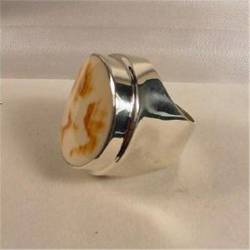 This wonderful ring has a huge 3cm diameter (1.1/4 inches) face of beautifully marked white/tan shell set in heavy sterling silver.