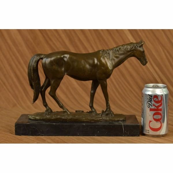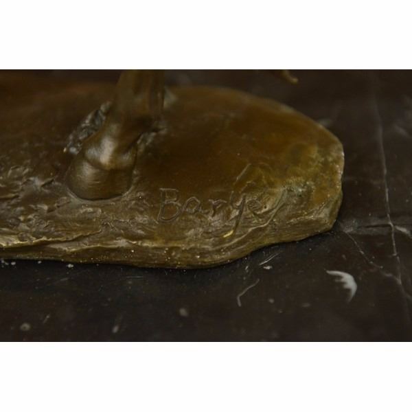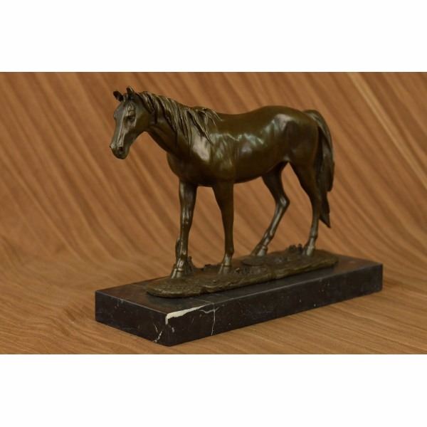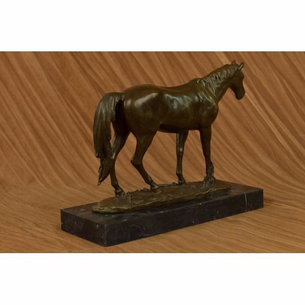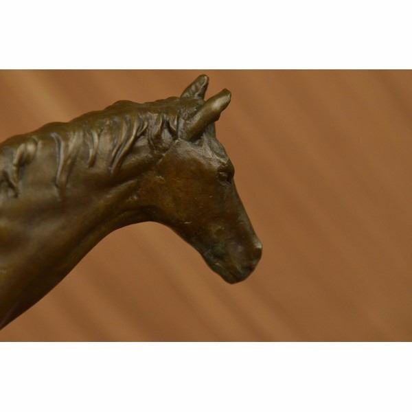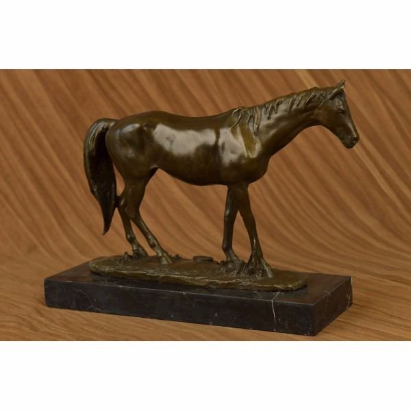 Horses are known and loved for their agility, graceful movement, strong bodies and sleek coat. They ignite a feeling of freedom and uncharted paths. This sculpture is perfect for any horse lover and collector. This horse has broken free of his reins, saddle and the restricting ranch he lived on. He trots freely in the open land. His eyes widened at the sight of soaring birds. 100% bronze and handmade, this brown patina sculpture was cast using the "Lost Wax Method" and mounted on a black marble base. It is signed by the artist Barye. Condition: This sculpture is in perfect condition. Bronze Dimensions with Marble Base:Height 9" x Width 14" Marble Dimensions: 12" X 5" . Height without base: 8" Weight : 12 LBS Inventory: 85X24915258