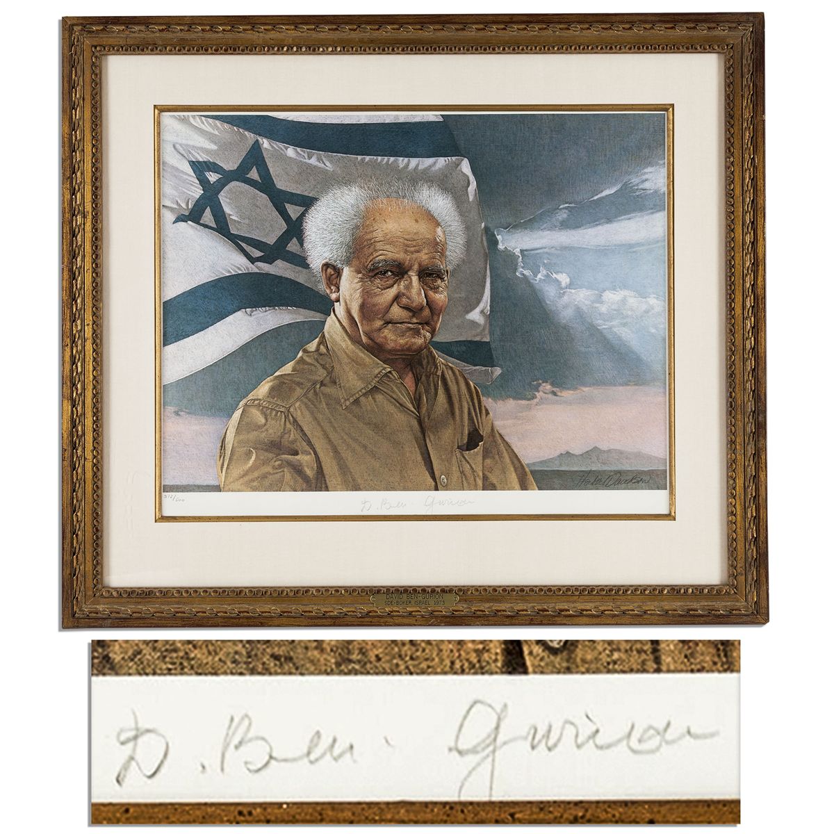 Limited edition color lithograph of David Ben-Gurion from 1973, the last year of his life. Signed, ''D Ben Gurion'' at the lower edge of the portrait, in which Israel's first prime minister stands in partial profile before the Israeli flag. Also signed by the artist Herbert Davidson at the lower right corner. Numbered ''372/500''. Lithograph measures 20'' x 16'', matted and framed to an overall size of 27.5'' x 23.75''. Litho has not been removed from the frame for examination but appears near fine. Frame is near fine save for some scratching to plexiglass.