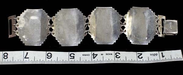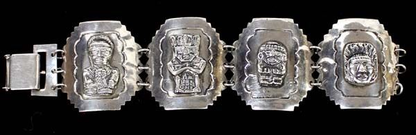 Large Silver Mayan Style Link Bracelet, measures 7''L end to end x 1.5''W, stamped 0900, total gram wt. of 74.3, FYI: ''900 silver is real silver with a relatively high purity. The number 900 refers to its level of purity, and it means that that your silver item is 90% silver and 10% alloy.''