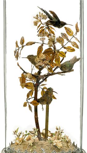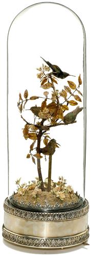 Large Singing Bird Automaton, c. 1900 With 4 humming birds, one with moving beak and tail, going-barrel movement and birdsong, under glass-dome on silver (800) base, 22 in. high. - Fully working condition - with excellent sound. - A terrific, rare collector's item!<Br>