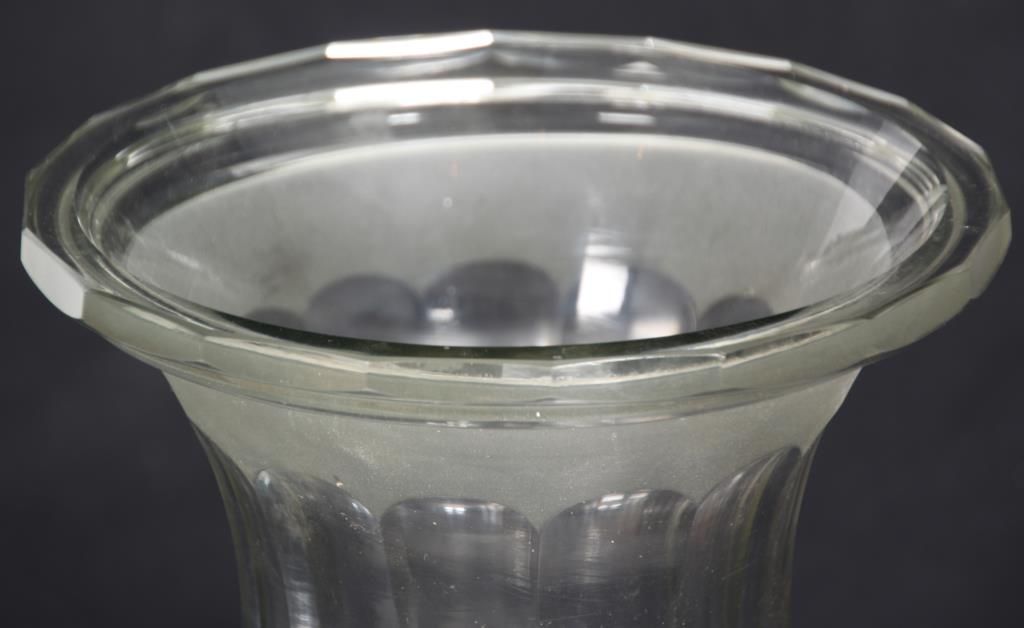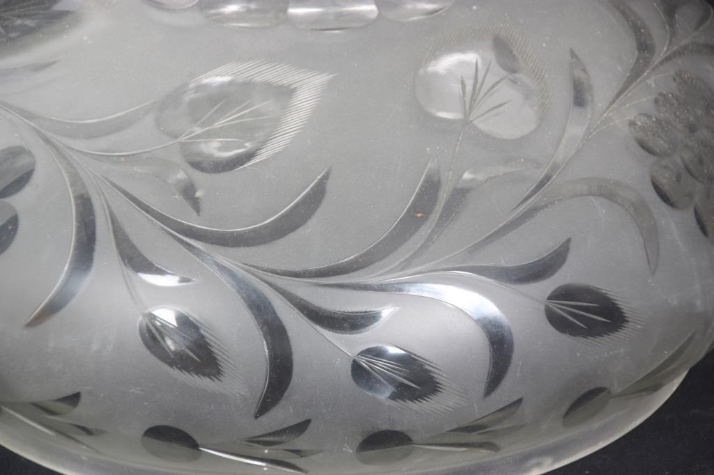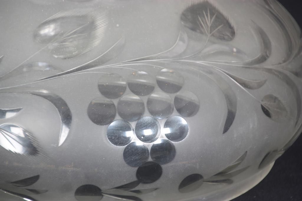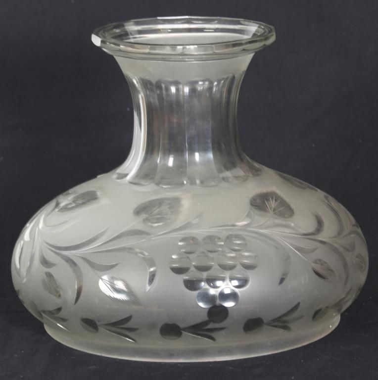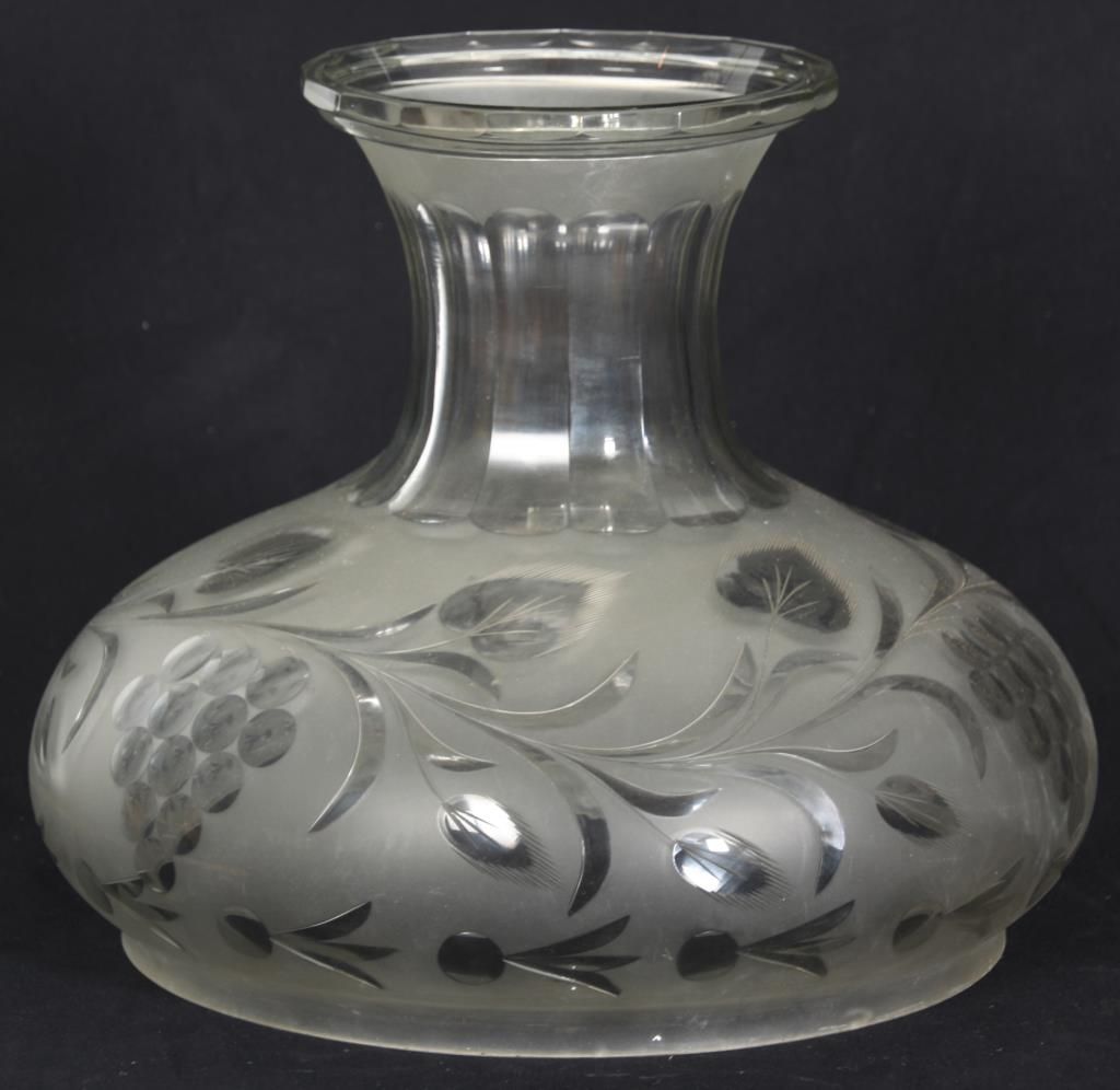 Large Sinumbra Lamp Glass Shade. Bell shaped frosted glass shade cut with a leaf and grape cluster design in the body and fluted design in the neck. In good condition with no breaks, chips or cracks. 10 in. dia. fitter x 10 in. high.