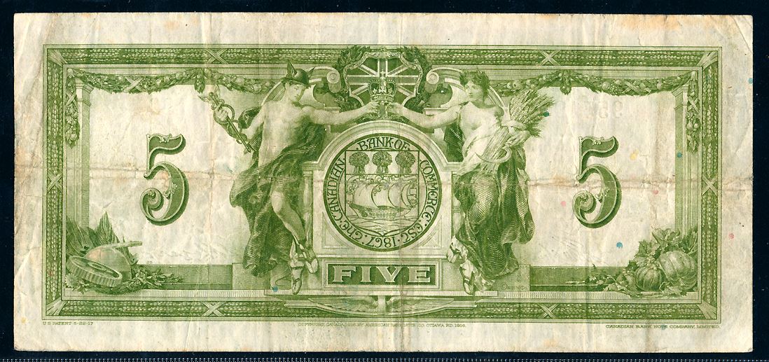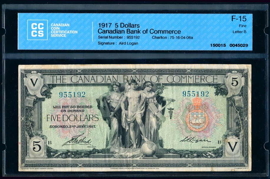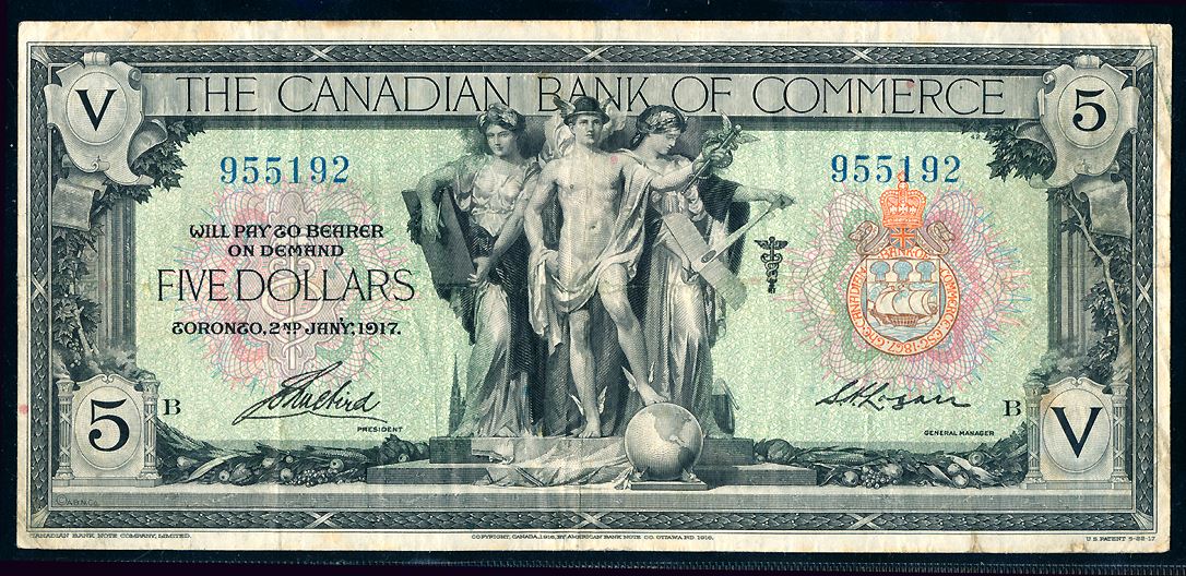 The Canadian Bank of Commerce, Five Dollars, 1917, green tint, CH#75-16-04-06a, graded by CCCS F-15. A bit of foxing along top border.