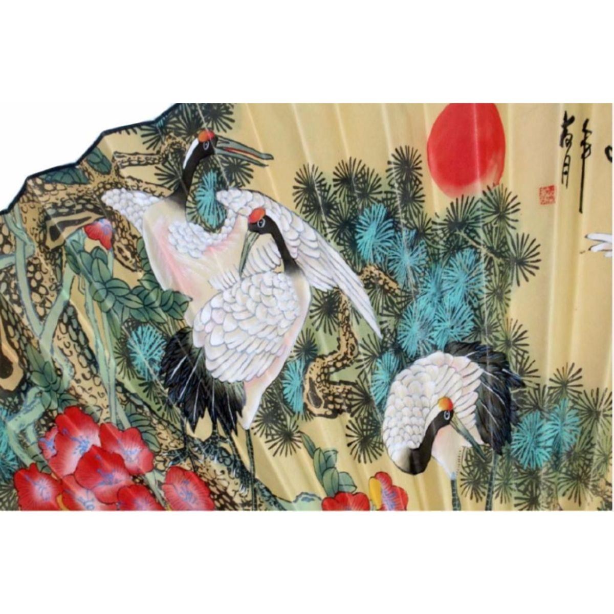 Large size ( 35" H x 50" W ) Chinese hand-painted wall decorative fan, depicting cranes in trees. Â