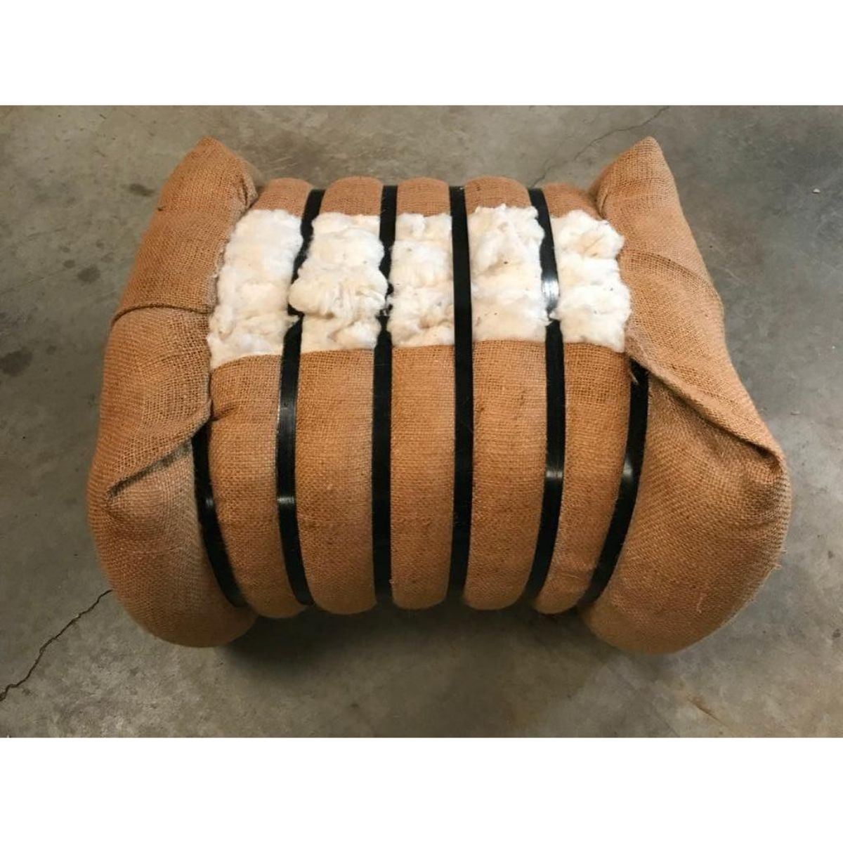 Large size, Cotton Bale display piece, primitive style footstool. Block of raw cotton covered in burlap & bound by metal straps. 18" H X 17" W X 12" thick.