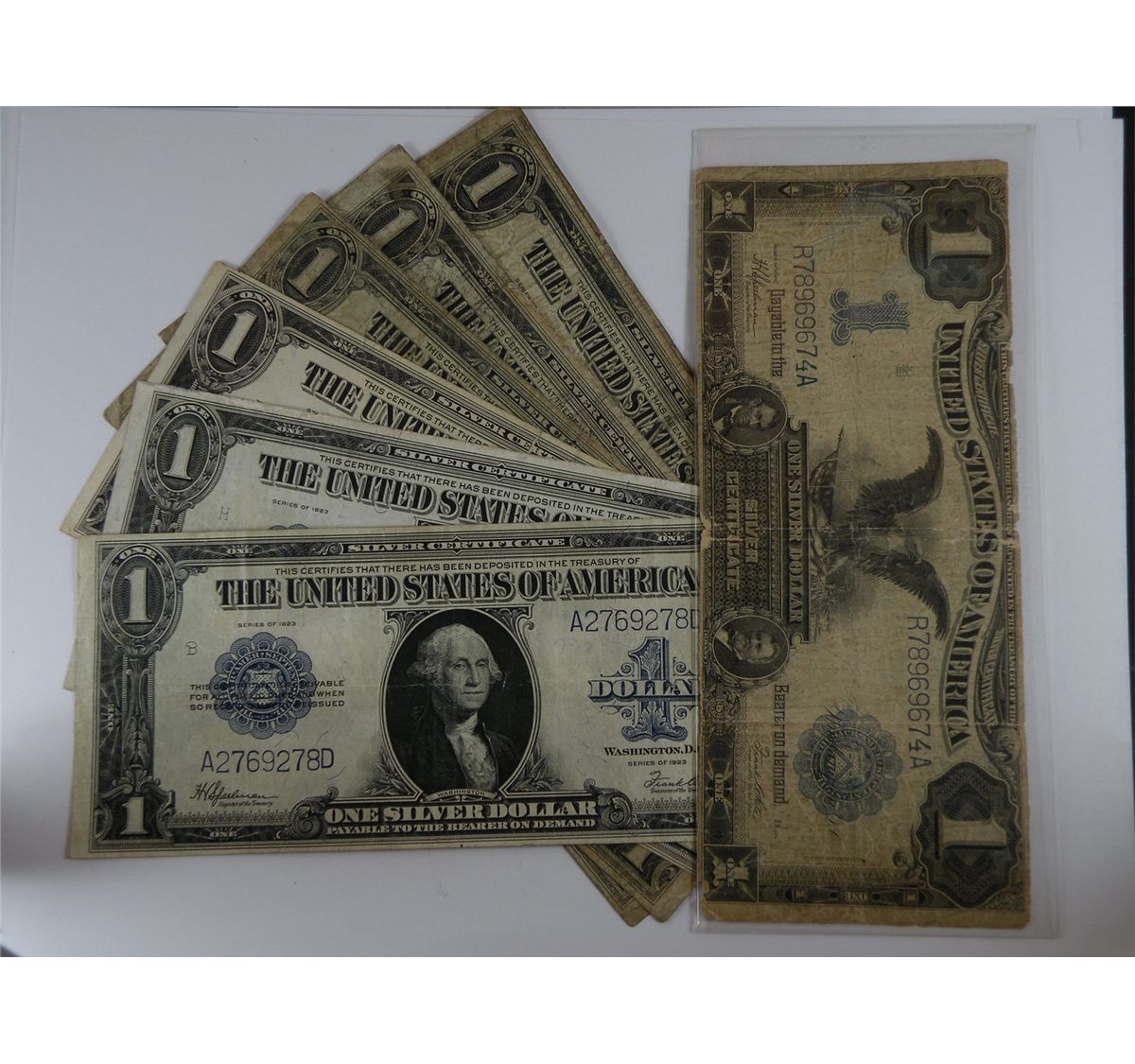 Large Size Currency Dealer Stock group containing : $1 1899 Silver Certificate and $1 1923 Silver Certificate (7). A total of 8 notes ranging in grade from Good to Very Fine. Est.$135