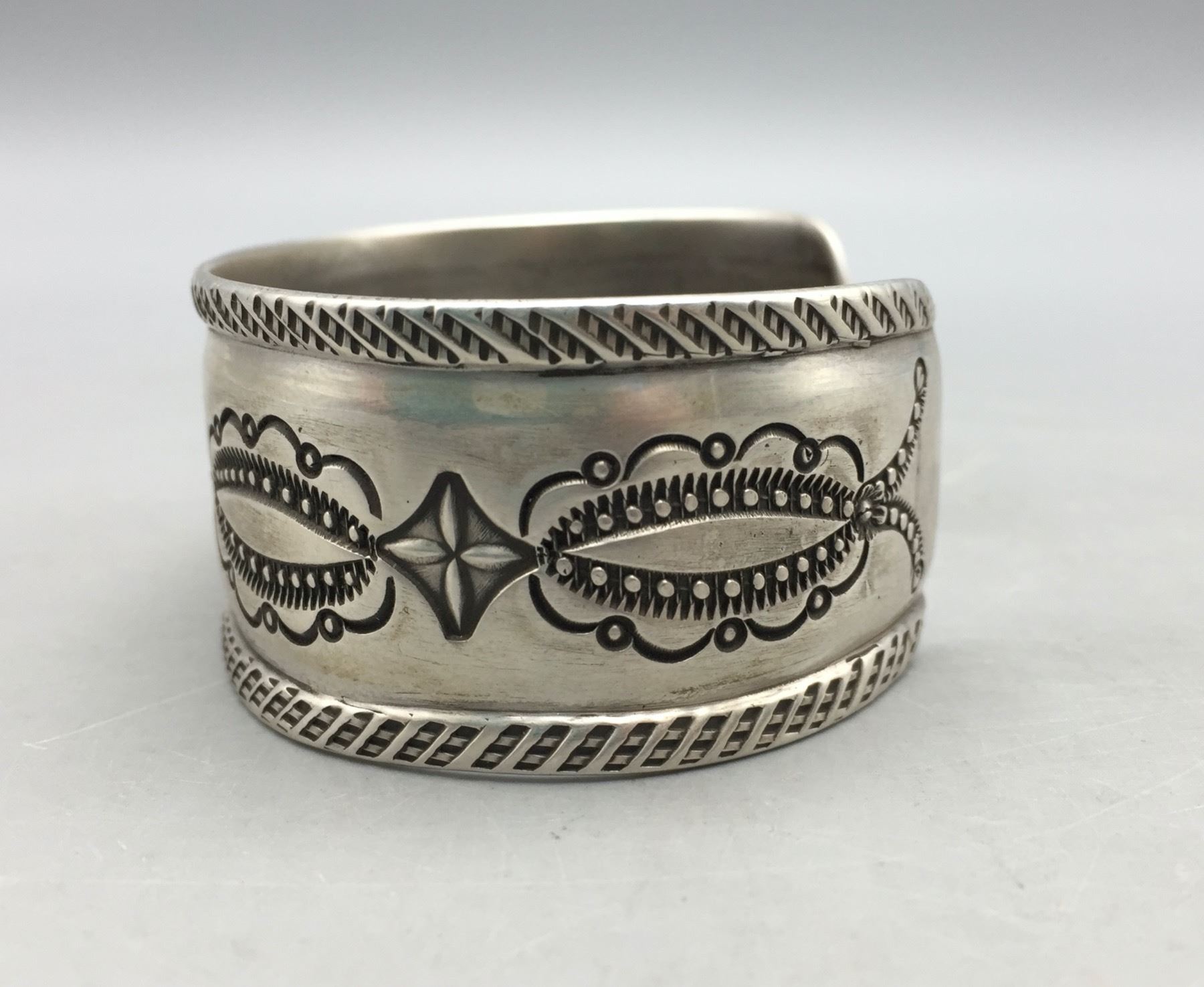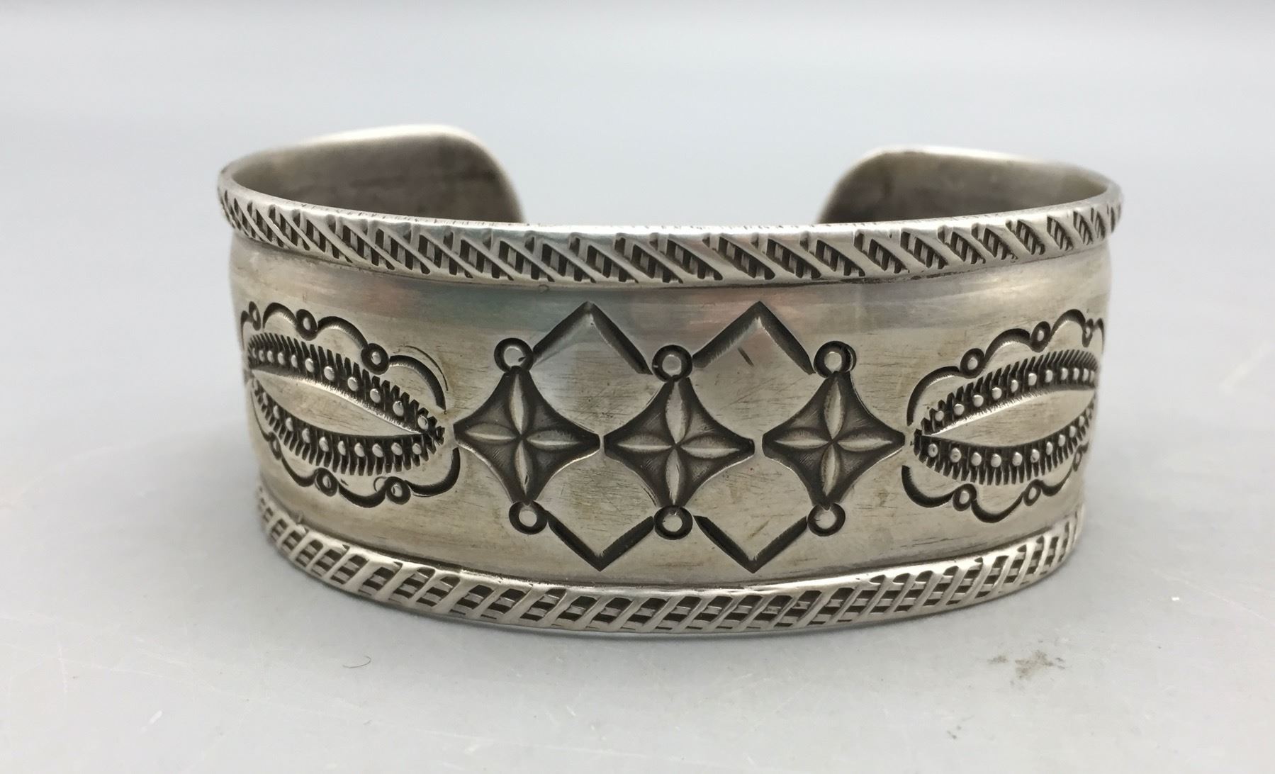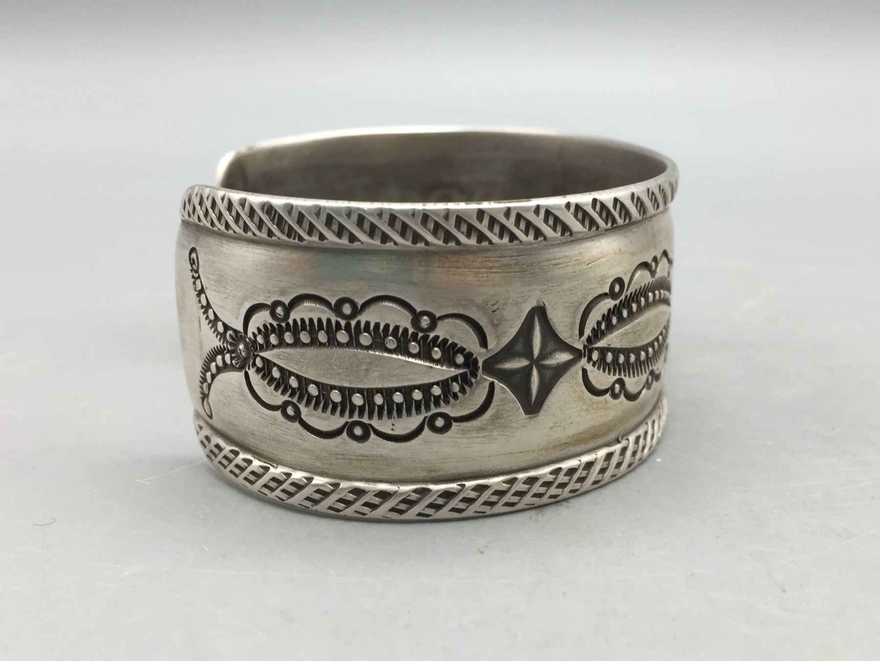 Description: Presented for sale in this lot we have a larger size sterling silver “ingot†handmade bracelet. It has nice stamp work and a weighted feel to it. Maker: Unknown. Approx. Age: Vintage. Size: Inside circumference measures 6-5/8†long. Opening is an additional 1-1/8â€, fitting a 7-3/4†wrist. Width is 1-1/8â€. Weighs 69.2 grams. Condition: Good for its age, normal wear expected. Please look closely at the pictures - they are an important part of our description. Shipping: There will be a $5 handling / packaging fee for shipping this lot. The actual cost of postage will be added on top of that.