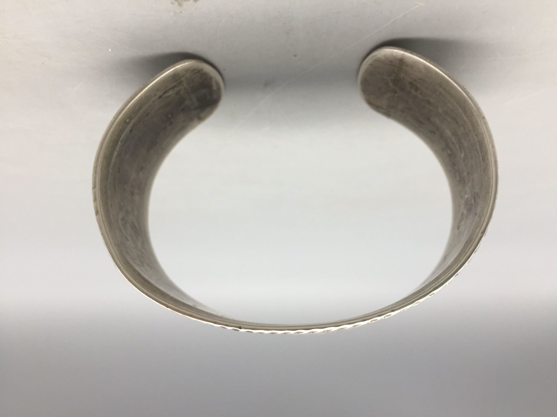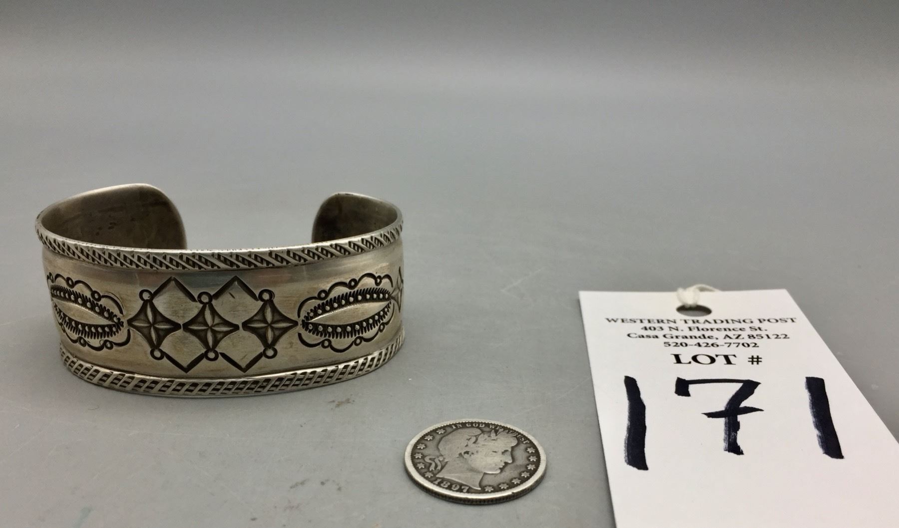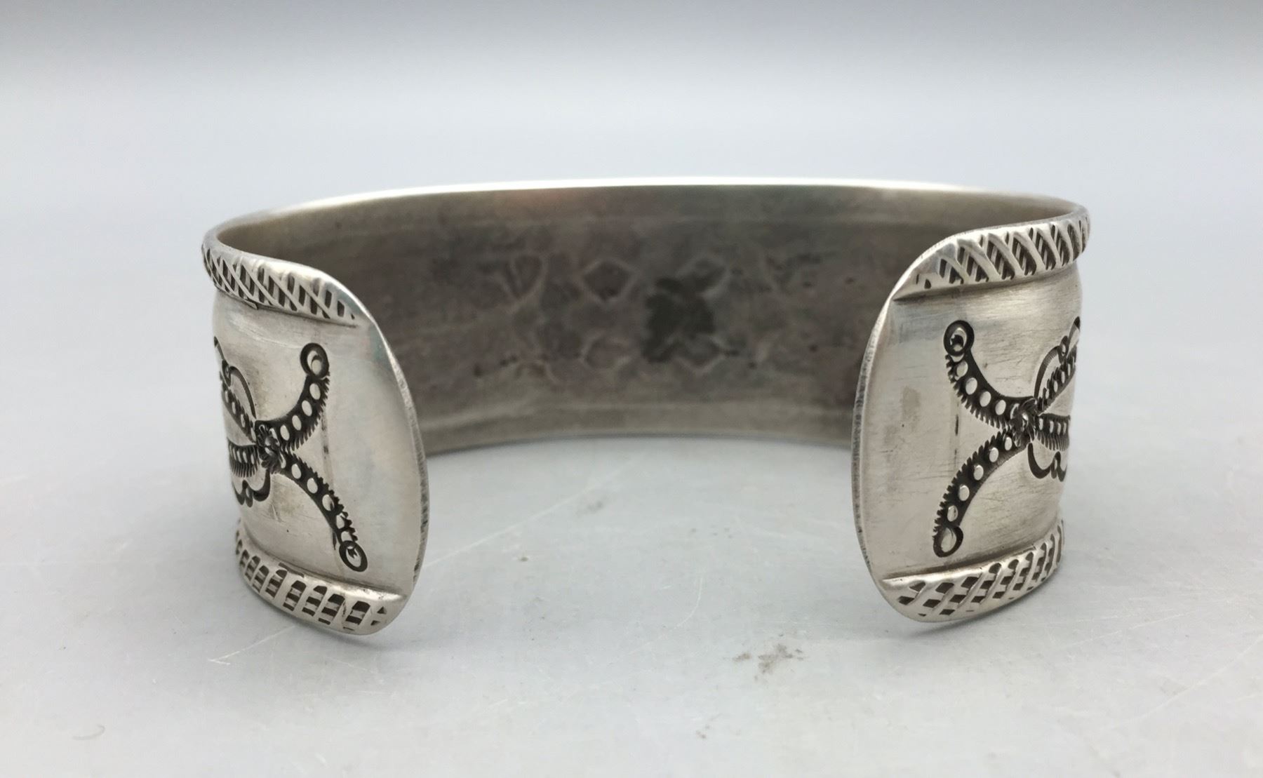 Description: Presented for sale in this lot we have a larger size sterling silver “ingot†handmade bracelet. It has nice stamp work and a weighted feel to it. Maker: Unknown. Approx. Age: Vintage. Size: Inside circumference measures 6-5/8†long. Opening is an additional 1-1/8â€, fitting a 7-3/4†wrist. Width is 1-1/8â€. Weighs 69.2 grams. Condition: Good for its age, normal wear expected. Please look closely at the pictures - they are an important part of our description. Shipping: There will be a $5 handling / packaging fee for shipping this lot. The actual cost of postage will be added on top of that.