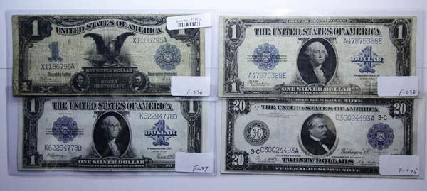 Large Size Silver Certificates and a Large Size Federal Reserve Note, 4 pieces. Fr. 236 1 series 1899 VG. Fr. 237 1 series 1923 crisp unc. Fr. 238 1 series 1923 Fine. Fr. 975 20 series 1914 crisp VF.