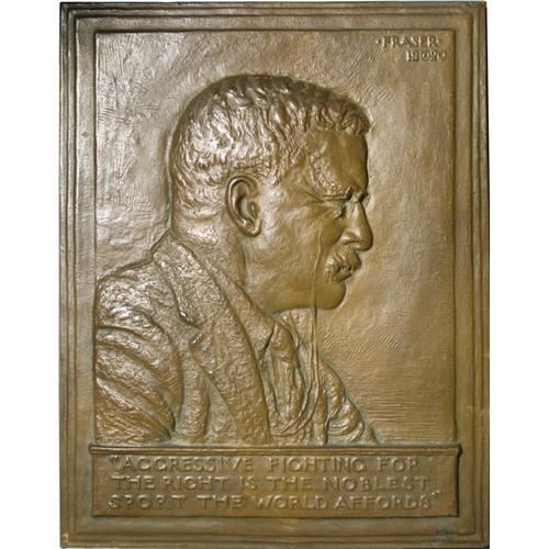 <B>Large Theodore Roosevelt Copper Plaque.</B></I> Designed by James Earl Fraser, the designer of the Buffalo nickel. Dated 1920. 10 x 13 3/4 inches. Copper. Portrait facing right with a three-line inscription: AGGRESSIVE FIGHTING FOR THE RIGHT IS THE NOBLEST SPORT THE WORLD AFFORDS. This quote is attributed to Roosevelt during his tenure as New York police commissioner (1895-1897). The more frequently seen of the two sizes of this plaque, this larger variant is an impressive item. Cast by Decorative Arts, as indicated by the logo on the back: DecArtS. The plaque is essentially flawless, with medium brown color overall. The back has two screws and a wire hanger.<BR><BR><b>Shipping:</b> Coin/Currency (<a target="_blank" href="http://www.heritageauctions.com/common/shipping.php">view shipping information</a>)