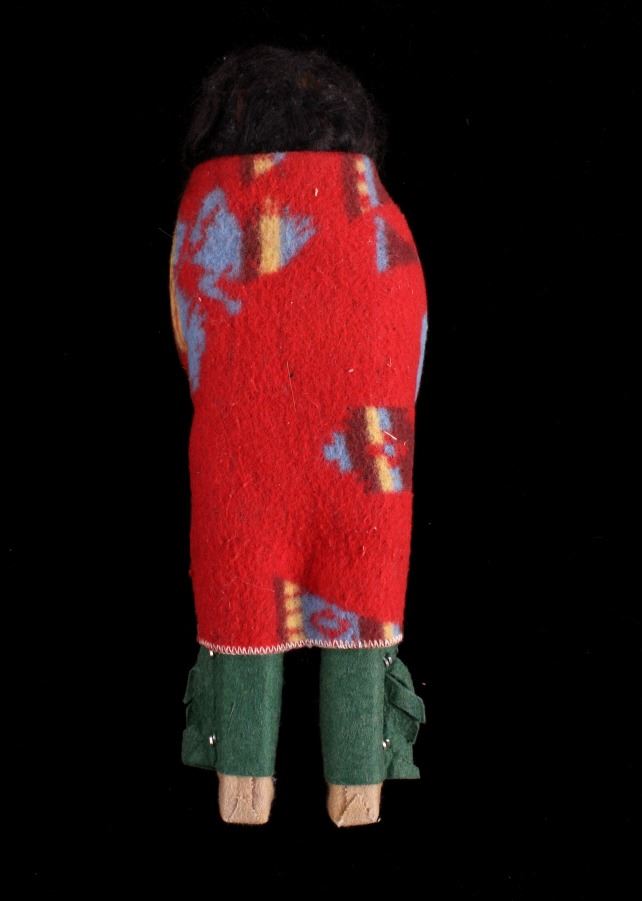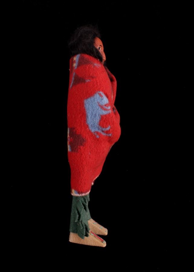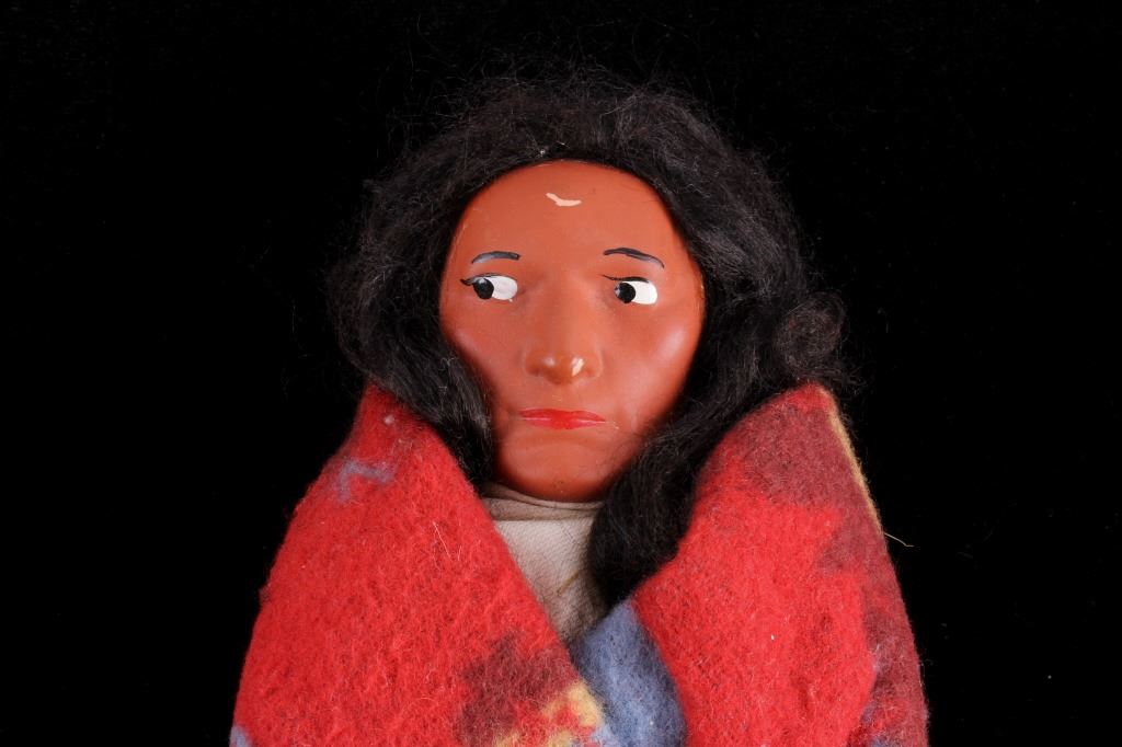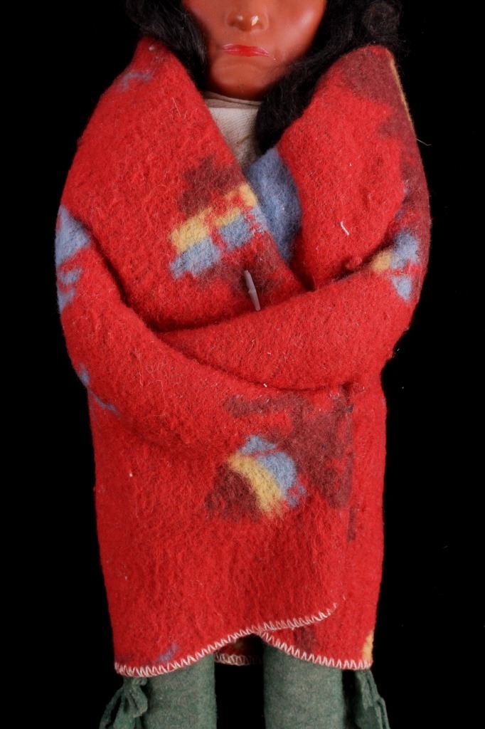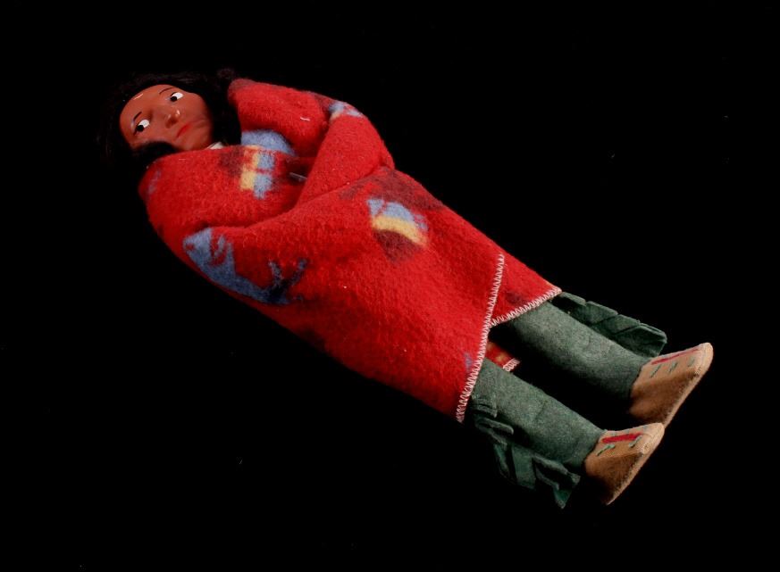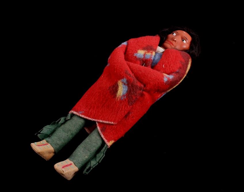 Featured in this lot is a 1920's, original, large, Skookum, eyes right, trade blanket-wrapped Indian doll. The doll shows original construction, with the framework for the doll constructed by wood with straw stuffing and a ceramic face. The doll shows black hair. The Native American man shows cloth constructed clothing and a wool trade blanket wrapped around him. The condition of this doll is good, it shows wear consistent with age. There are two small paint chips on the face. The measurements of this Skookum doll are 11 1/2" x 4" x 2 1/2".