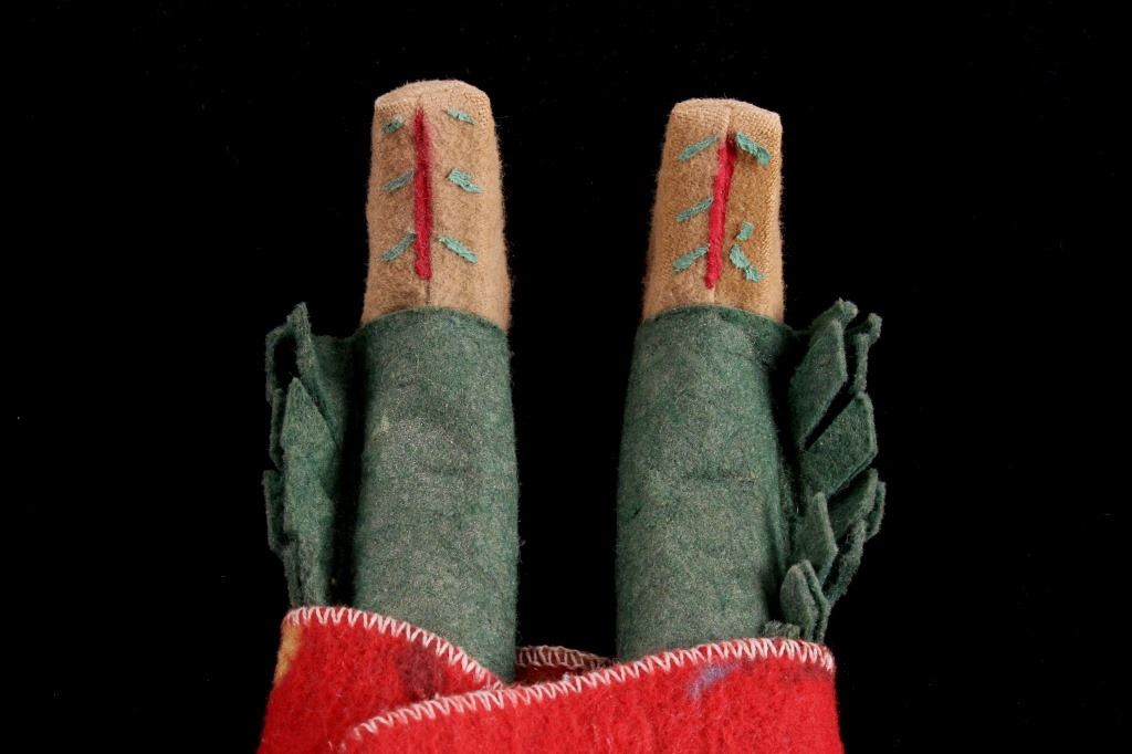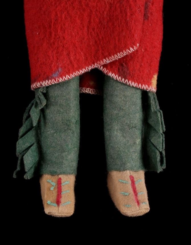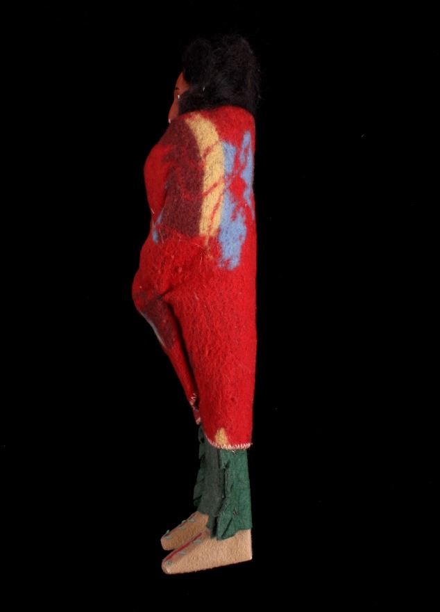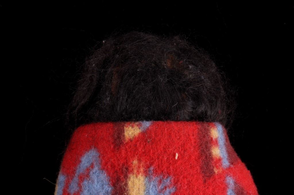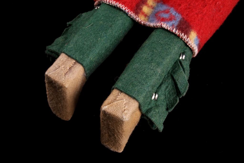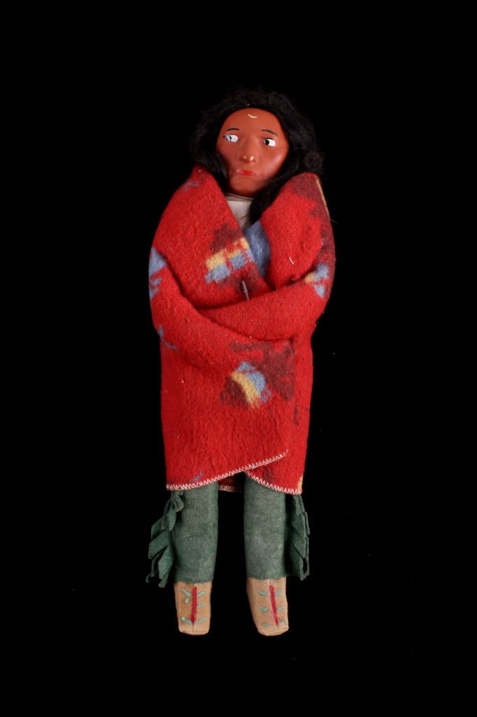 Featured in this lot is a 1920's, original, large, Skookum, eyes right, trade blanket-wrapped Indian doll. The doll shows original construction, with the framework for the doll constructed by wood with straw stuffing and a ceramic face. The doll shows black hair. The Native American man shows cloth constructed clothing and a wool trade blanket wrapped around him. The condition of this doll is good, it shows wear consistent with age. There are two small paint chips on the face. The measurements of this Skookum doll are 11 1/2" x 4" x 2 1/2".