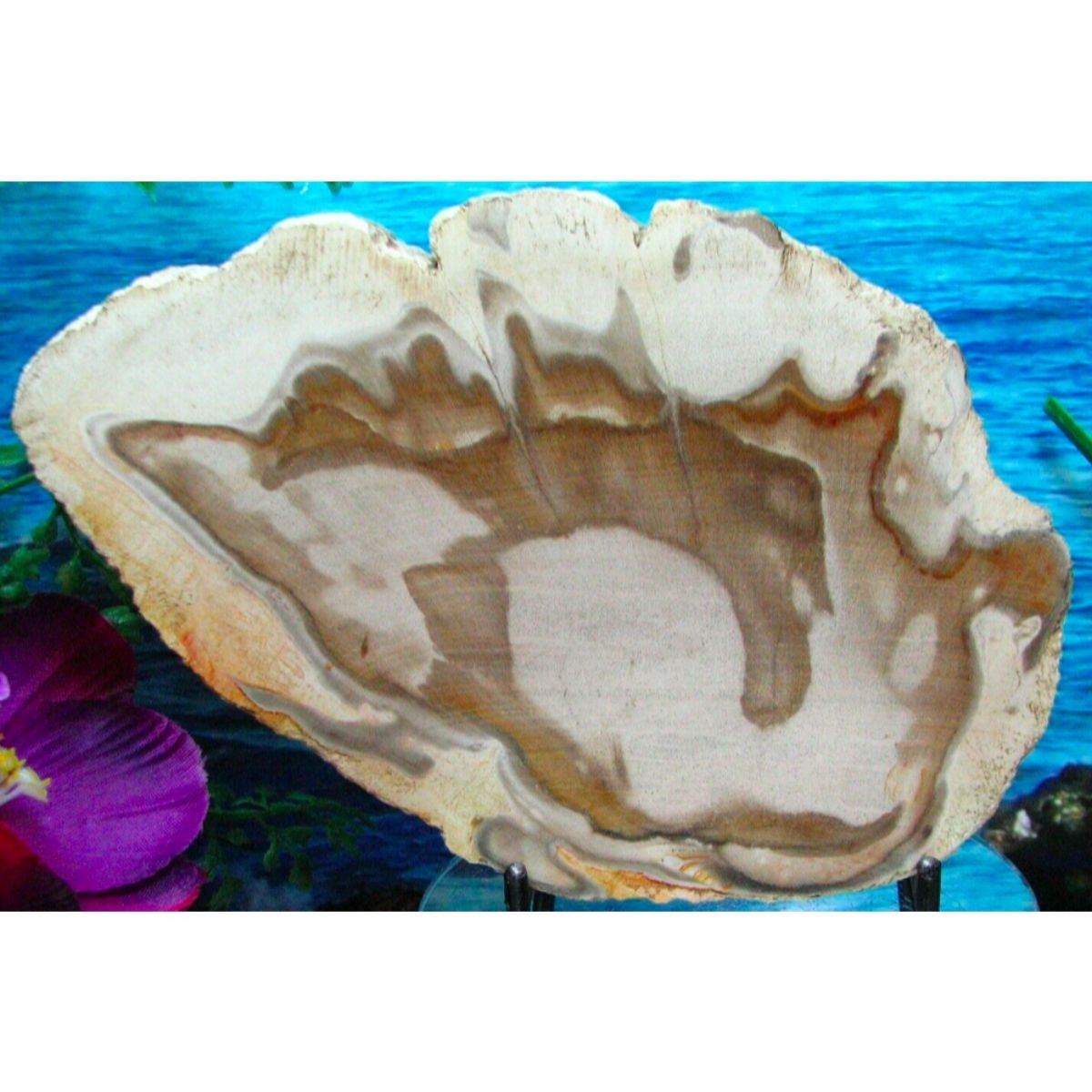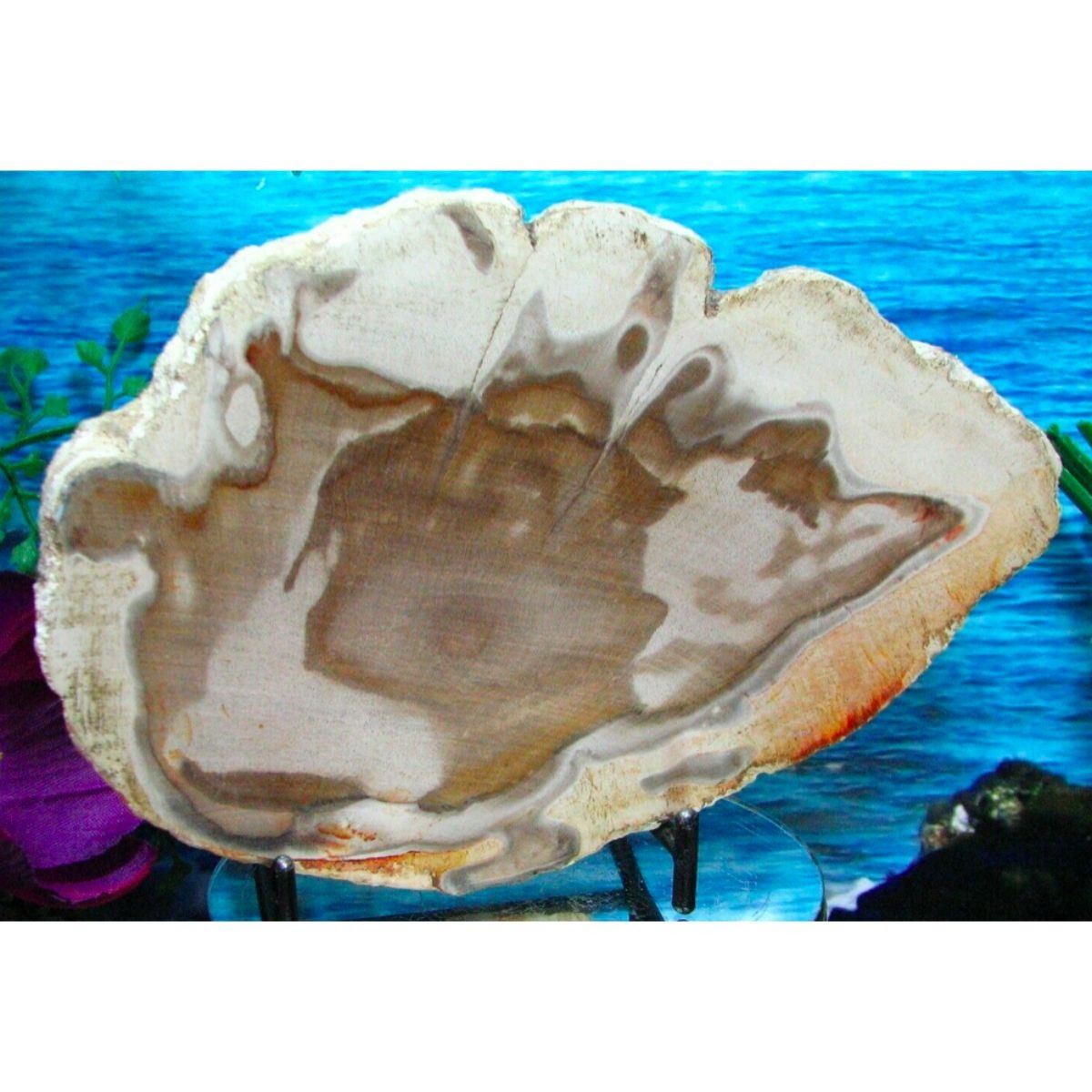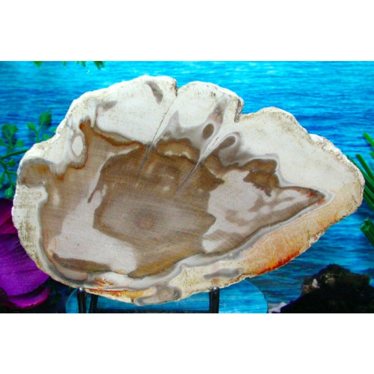 Fantastic large specimen, Myocene Period ( 20 million years old ) petrified wood, tree slab with outer bark surrounding. Indonesia origin. Polished on both sides with glossy finish. 6 3/4" L X 4 1/2" W X  5/8" thick. Approx 1 lb weight.
