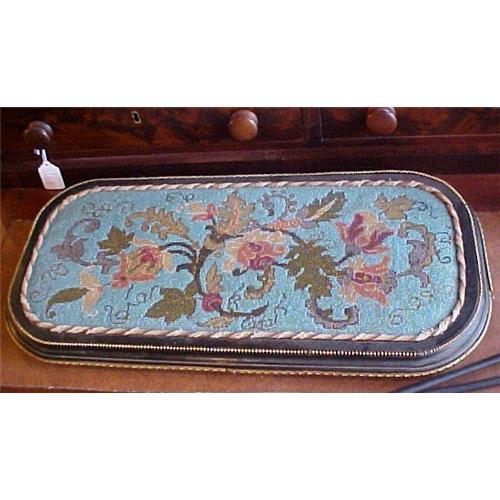Offered here is a large beaded teapot stand of the late Victorian period, worked in a stunning crewel design. The colors are vibrant, and the beading is in excellent condition. It is set in a "frame" of ebony colored wood with ormolu trim. Quite a spectacular piece. The dimensions are 23" by 11"