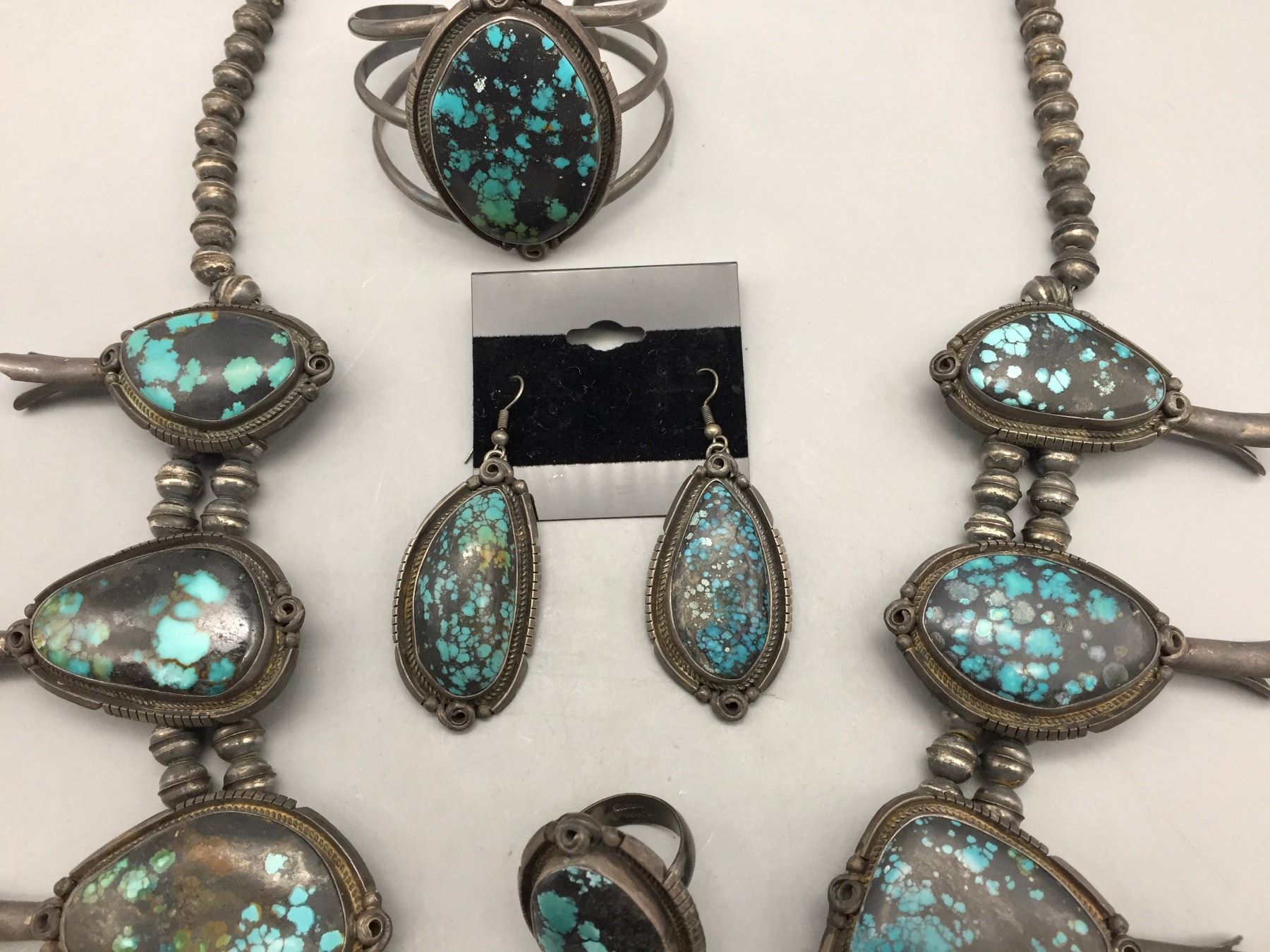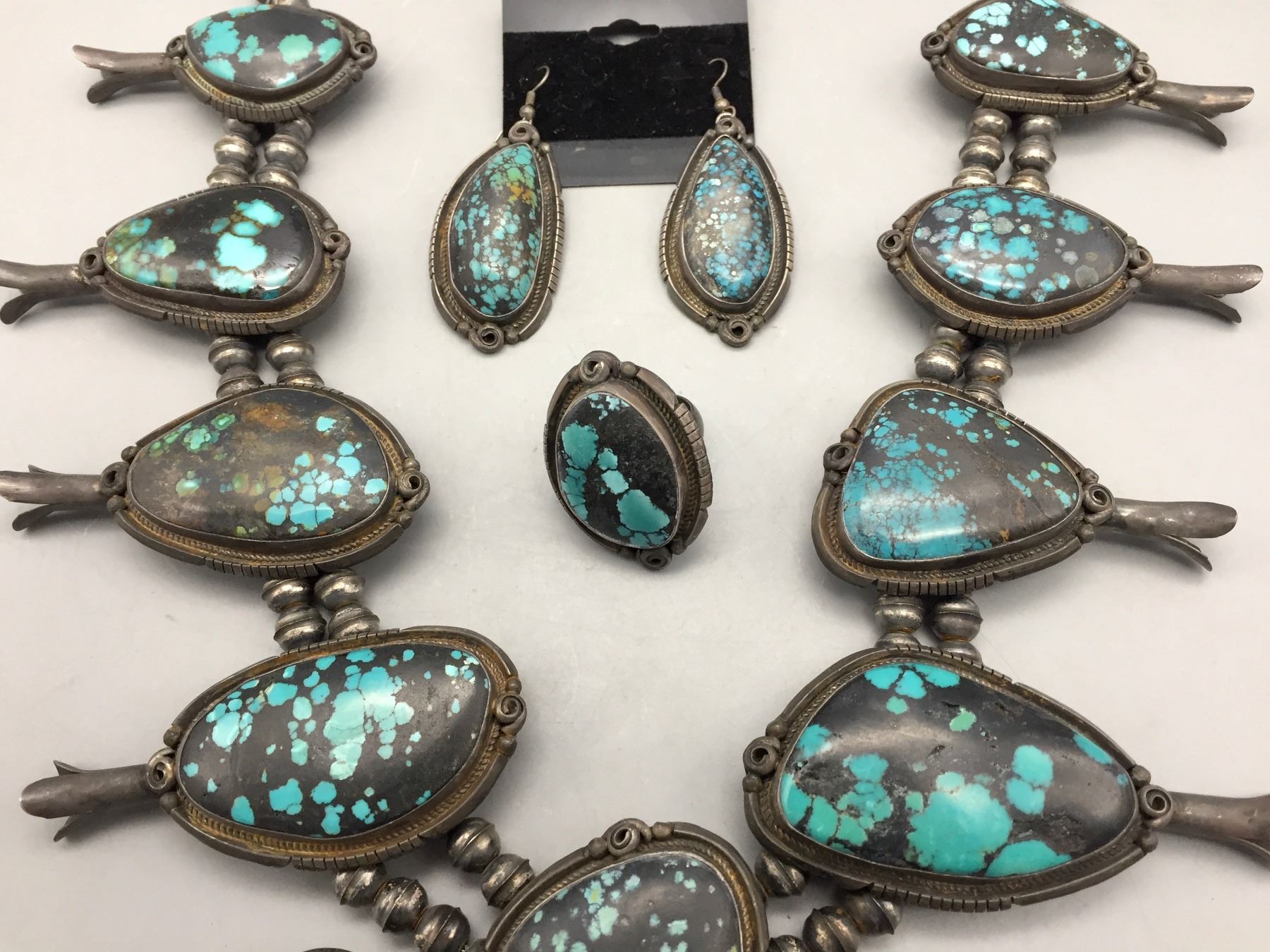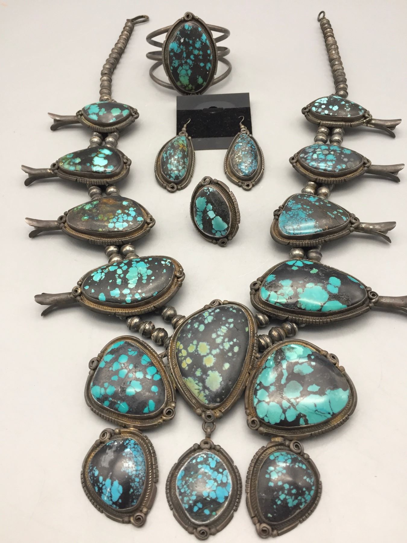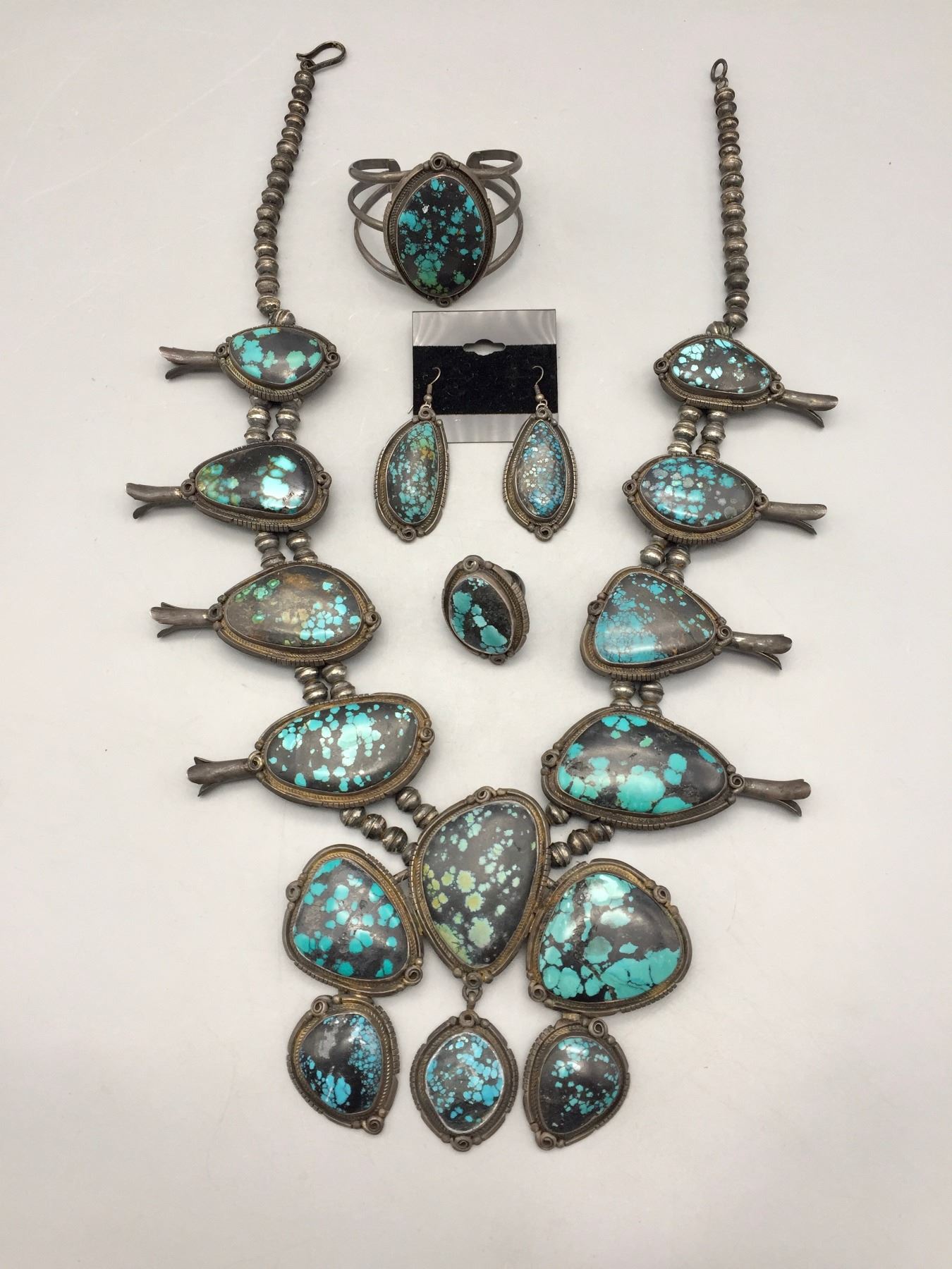 Description: Presented for your consideration, we offer for sale this large squash blossom set which includes a cuff bracelet, ring, earrings, and necklace featuring webbed turquoise. Marked as sterling silver. Maker: B. Jimenez.