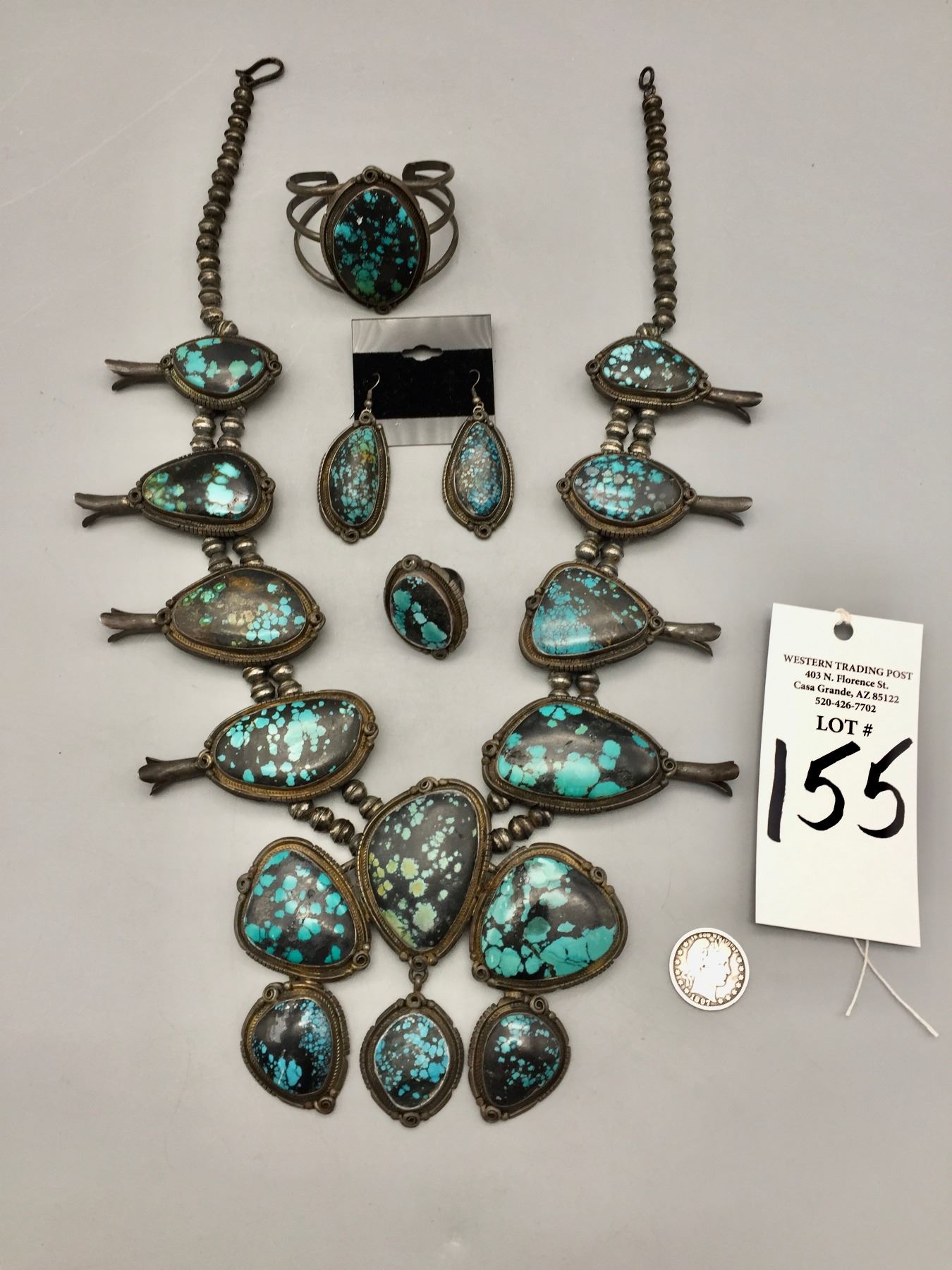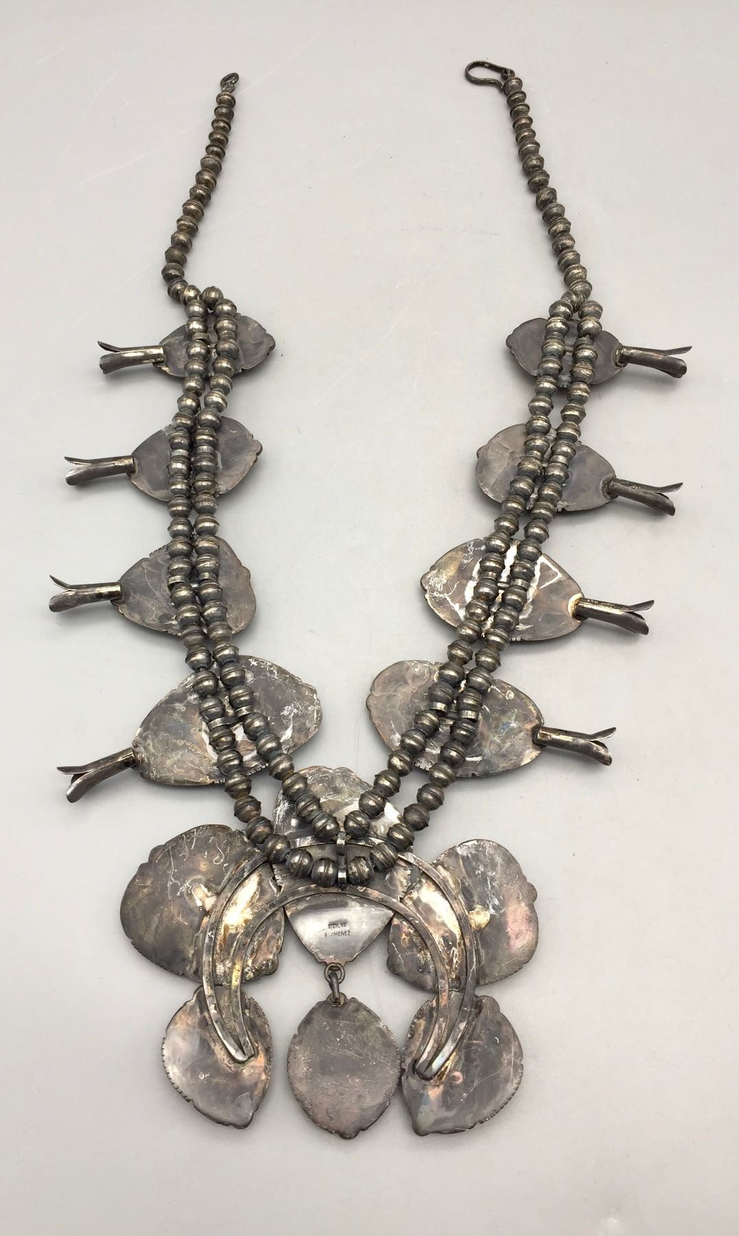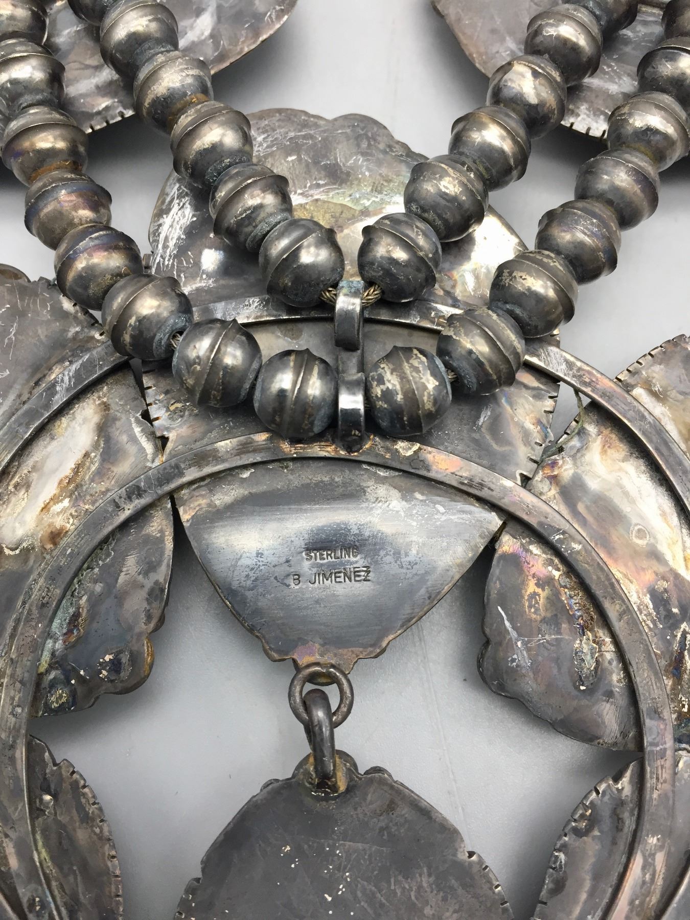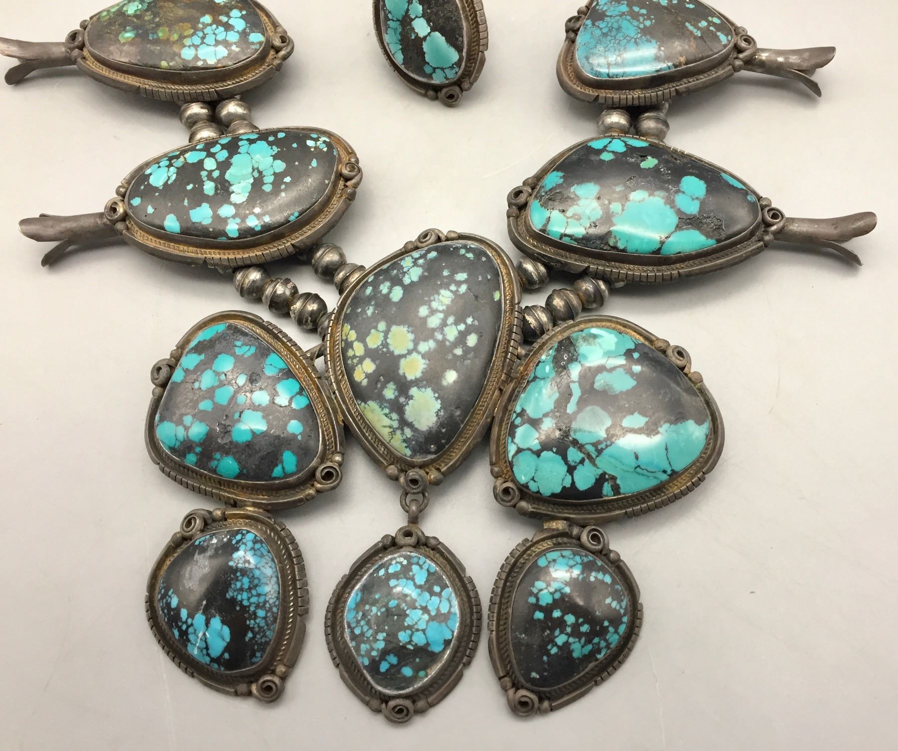 Description: Presented for your consideration, we offer for sale this large squash blossom set which includes a cuff bracelet, ring, earrings, and necklace featuring webbed turquoise. Marked as sterling silver. Maker: B. Jimenez.