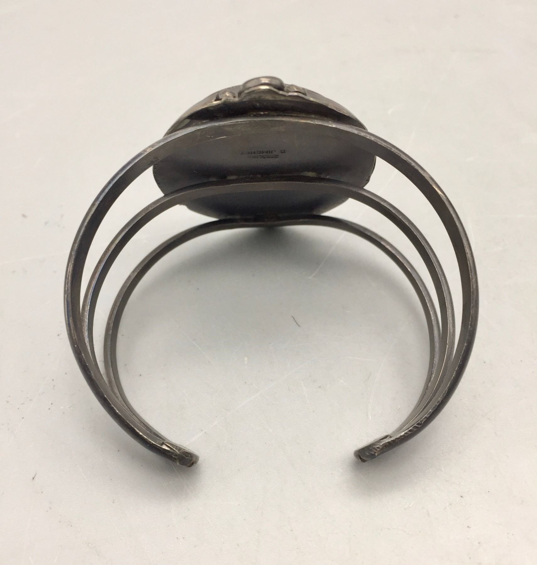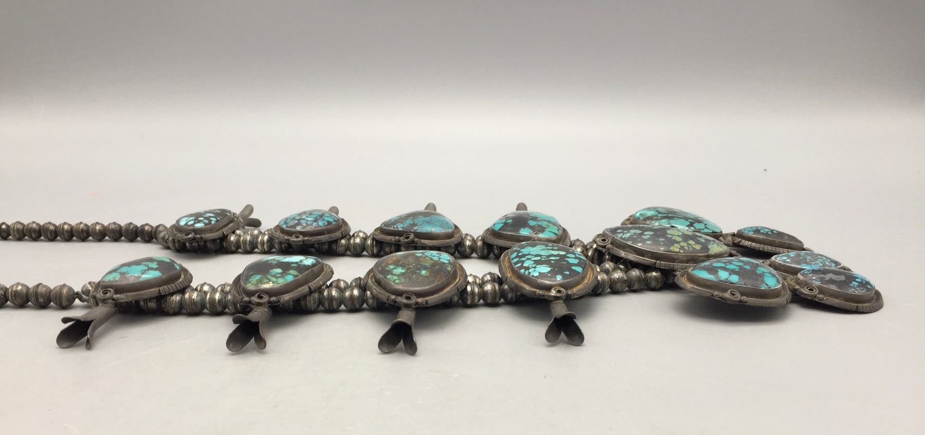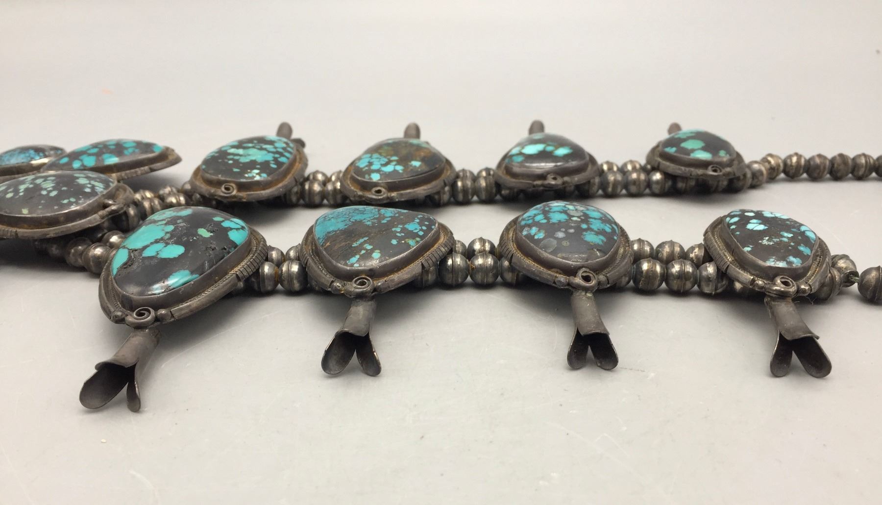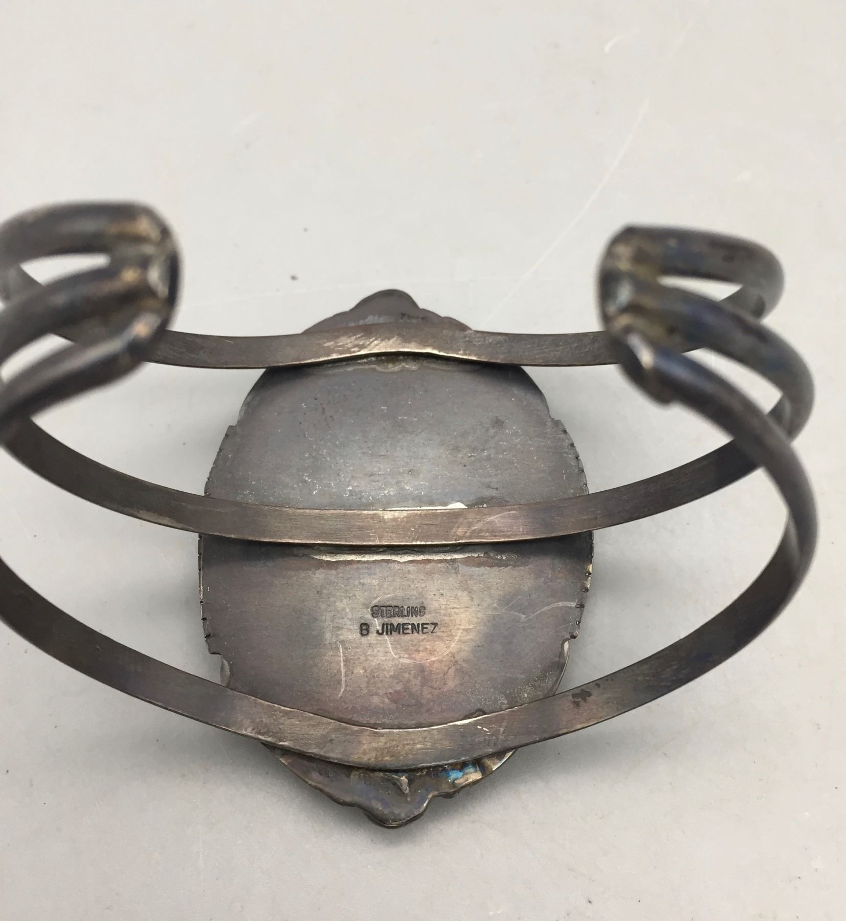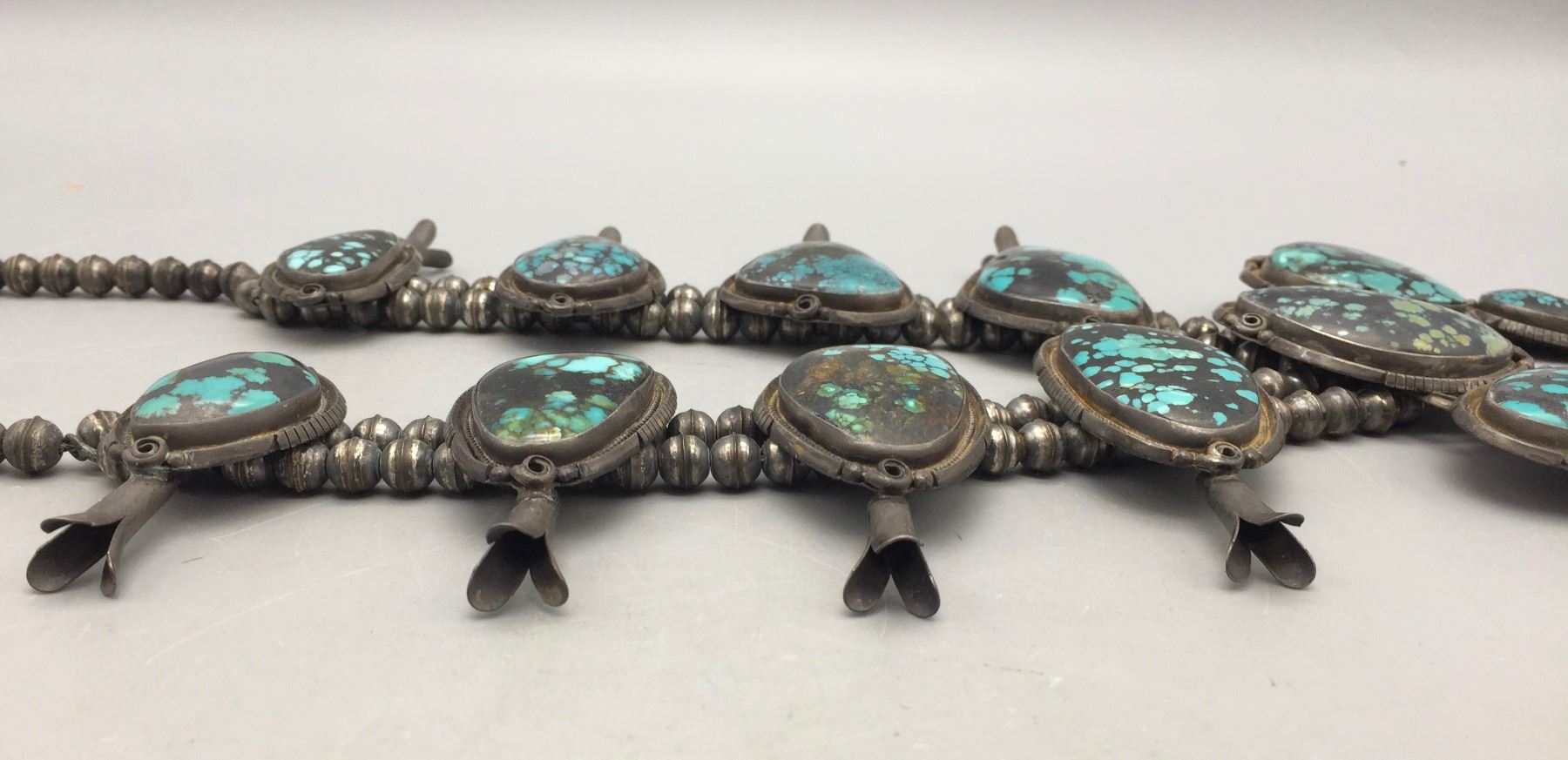 Description: Presented for your consideration, we offer for sale this large squash blossom set which includes a cuff bracelet, ring, earrings, and necklace featuring webbed turquoise. Marked as sterling silver. Maker: B. Jimenez.