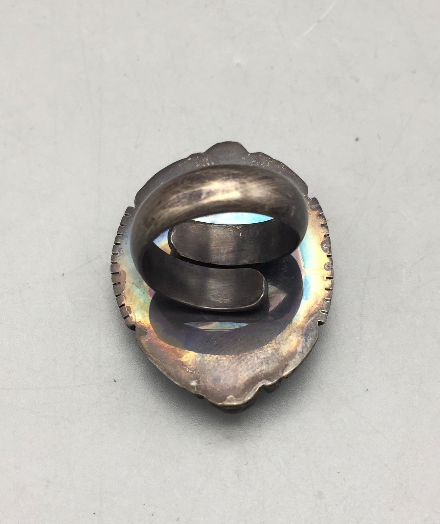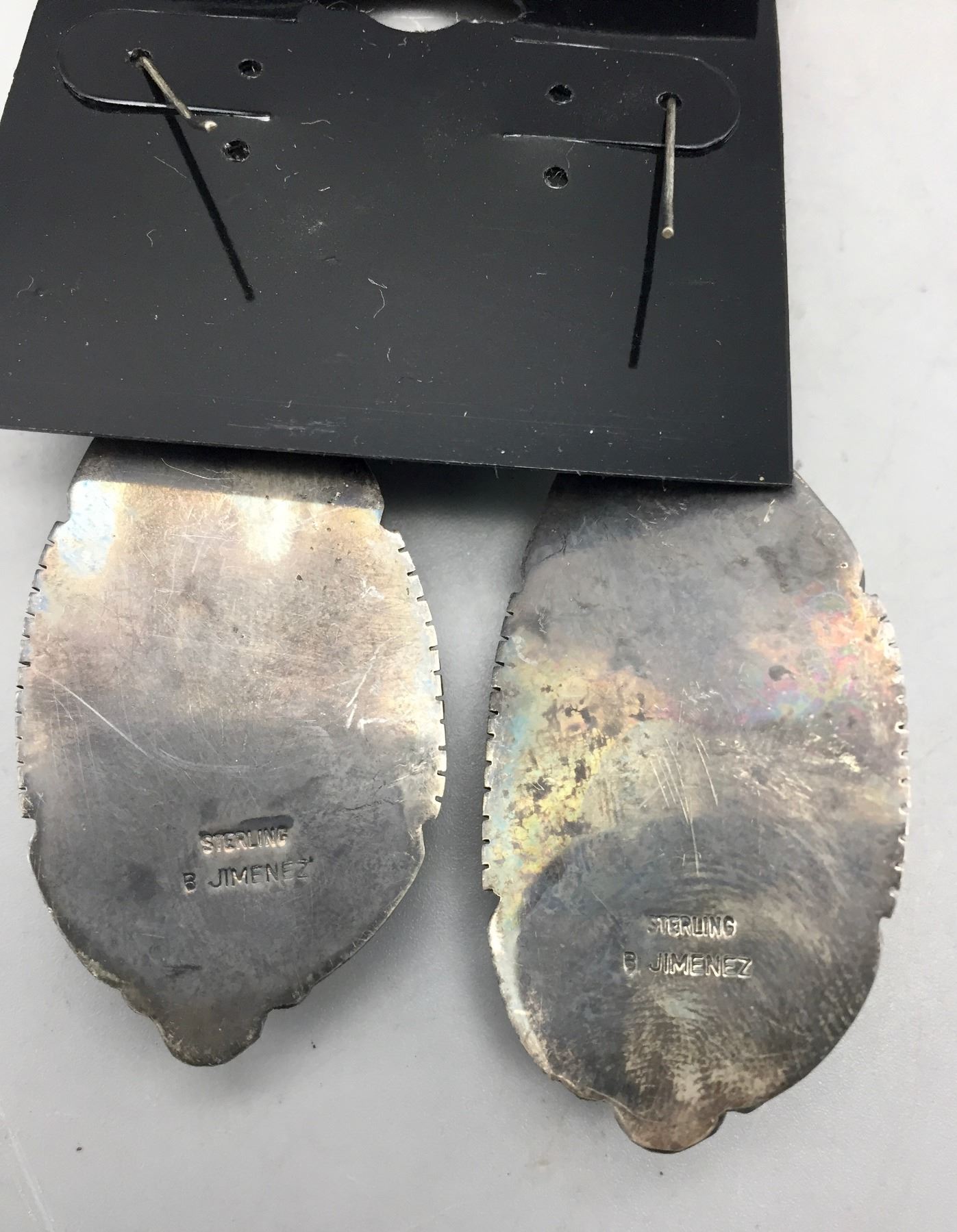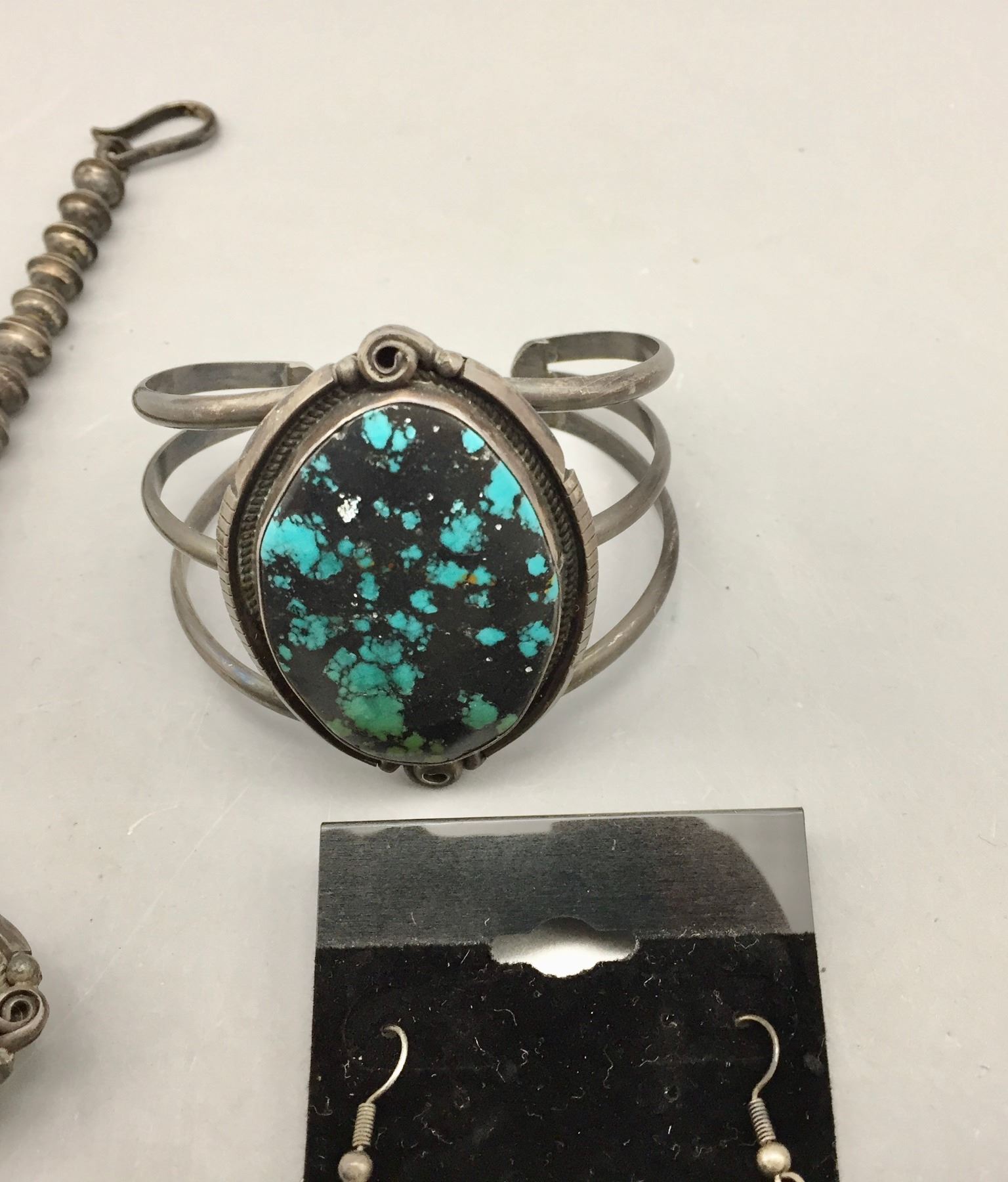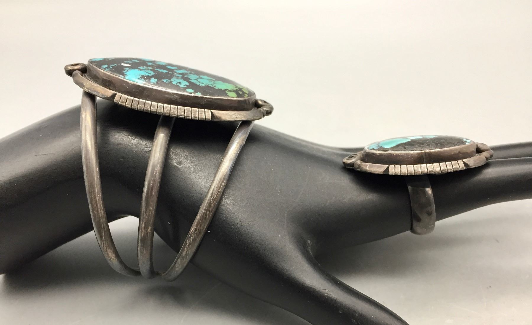 Description: Presented for your consideration, we offer for sale this large squash blossom set which includes a cuff bracelet, ring, earrings, and necklace featuring webbed turquoise. Marked as sterling silver. Maker: B. Jimenez.