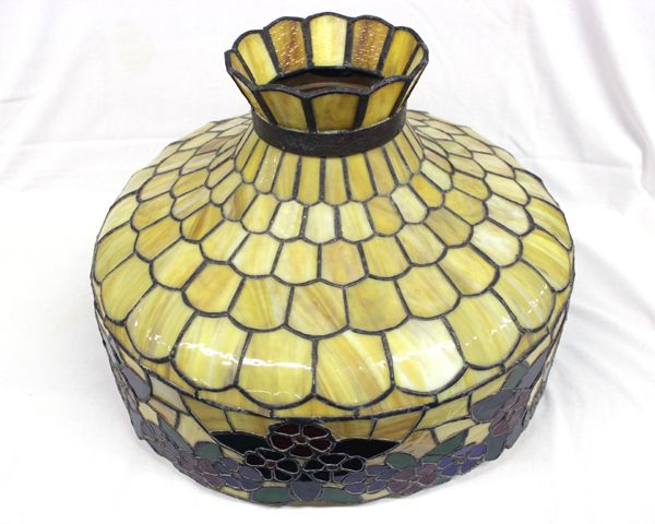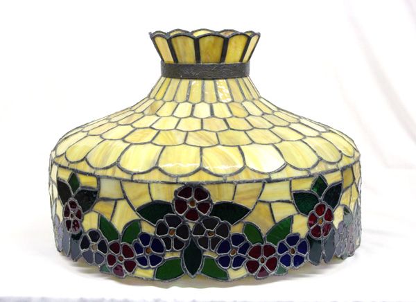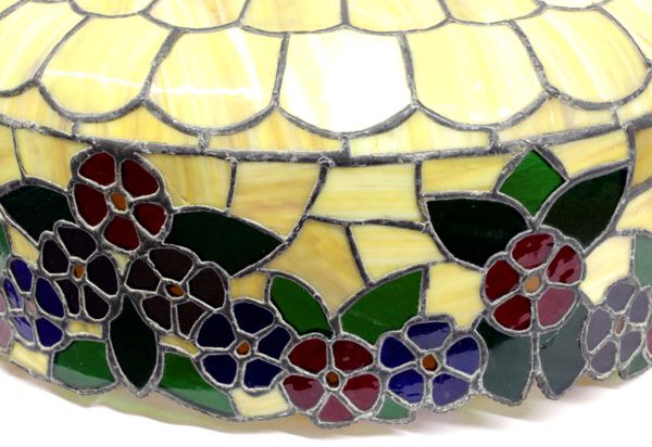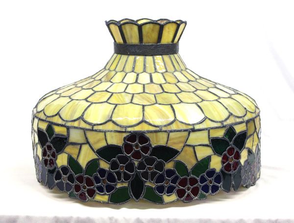 Large Stained Glass Hanging/Standing Lamp Shade. Tight, totally intact shade with golden/ivory slag glass, green leaves, red and blue flowers. A few tiny cracks - see photo. It can be hung or fitted onto a lamp base. A very impressive and beautiful lamp shade. Measures 16''H x 22'' Diameter.