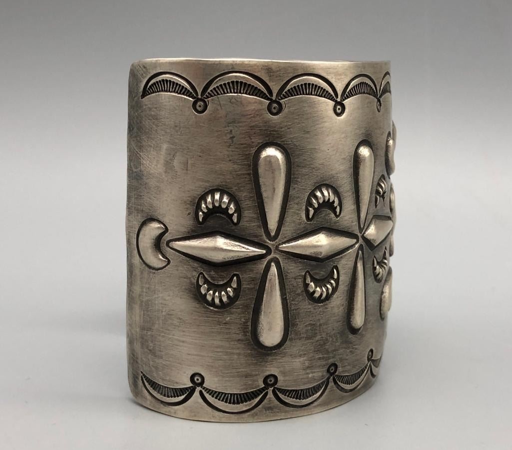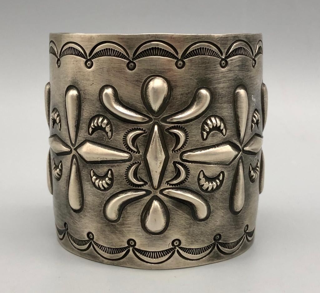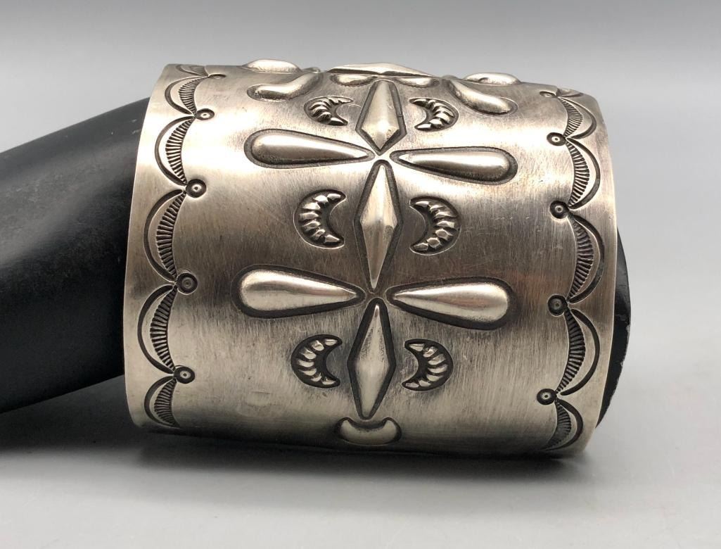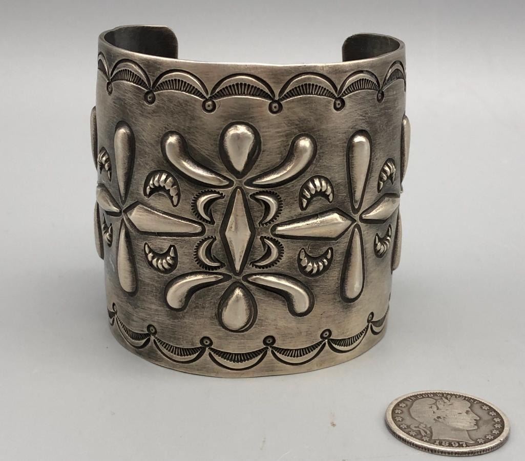 For sale in this lot is a large sterling silver bracelet with repousse work. This is a nice, wide cuff bracelet featuring lovely repousse "bump out" work. It is accented by hand stamped work on the edges. Repousse is an ancient art form dating back to the Phoenicians. It is stamped as sterling silver. MAKER: Hallmarked S/. Dean Sandoval Jr. (Navajo). APPROX AGE: Contemporary. SIZE: Inside circumference measures 6 inches long. Opening is an additional 1-5/8 inches, fitting a 7-5/8 inch wrist. Width is 2-5/8 inches. Weighs 132.1 grams. CONDITION: Good for its age, normal wear expected. Please look closely at the pictures as they are an important part of our description and are hereby incorporated into the description, specifically with regards to condition. SHIPPING: There will be a $5 handling / packaging fee for shipping this lot. The actual cost of postage will be added on top of that. BUY IT NOW: If you would like to buy this item now, without waiting for the auction day to bid on it, we do offer this option (which is available up to 48 hours before the actual auction starts). The “Buy it Now†price is the high estimate of this lot (plus applicable fees and the Buyer's premium is discounted to 10% when using the Buy it Now option). If you would like to exercise this option, you must contact us by email (or phone as long as you talk to someone live). Reference this lot number and your intention to "Buy it Now."
