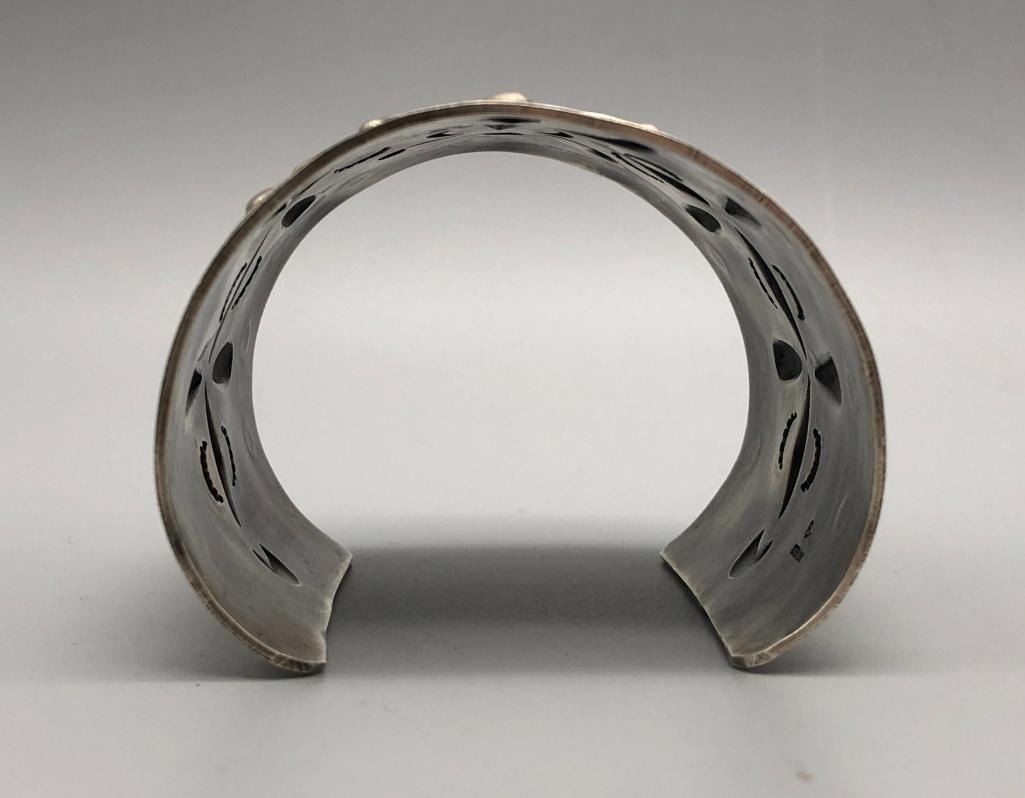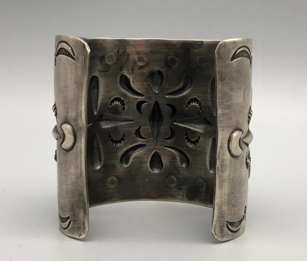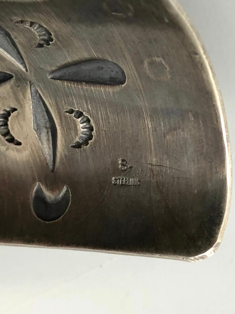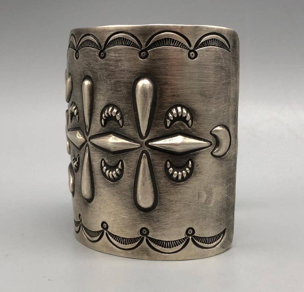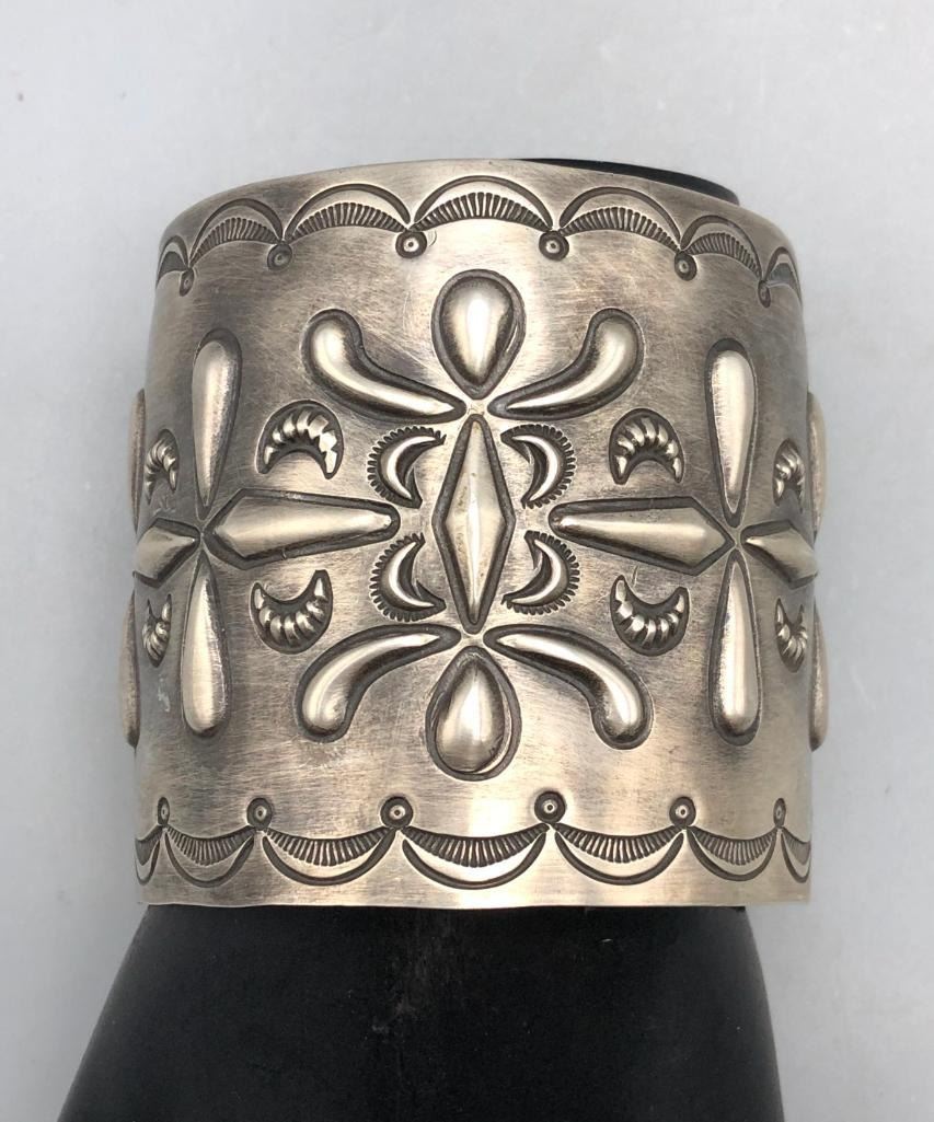 For sale in this lot is a large sterling silver bracelet with repousse work. This is a nice, wide cuff bracelet featuring lovely repousse "bump out" work. It is accented by hand stamped work on the edges. Repousse is an ancient art form dating back to the Phoenicians. It is stamped as sterling silver. MAKER: Hallmarked S/. Dean Sandoval Jr. (Navajo). APPROX AGE: Contemporary. SIZE: Inside circumference measures 6 inches long. Opening is an additional 1-5/8 inches, fitting a 7-5/8 inch wrist. Width is 2-5/8 inches. Weighs 132.1 grams. CONDITION: Good for its age, normal wear expected. Please look closely at the pictures as they are an important part of our description and are hereby incorporated into the description, specifically with regards to condition. SHIPPING: There will be a $5 handling / packaging fee for shipping this lot. The actual cost of postage will be added on top of that. BUY IT NOW: If you would like to buy this item now, without waiting for the auction day to bid on it, we do offer this option (which is available up to 48 hours before the actual auction starts). The “Buy it Now†price is the high estimate of this lot (plus applicable fees and the Buyer's premium is discounted to 10% when using the Buy it Now option). If you would like to exercise this option, you must contact us by email (or phone as long as you talk to someone live). Reference this lot number and your intention to "Buy it Now."