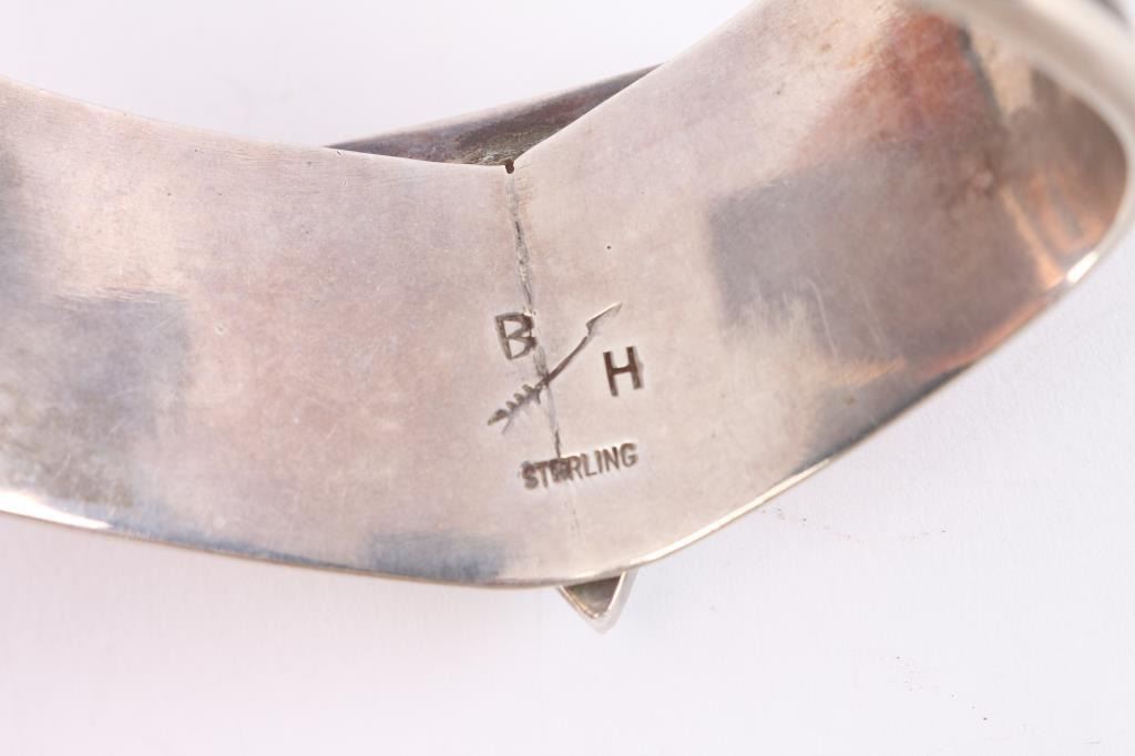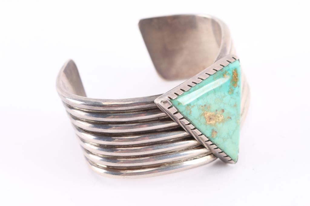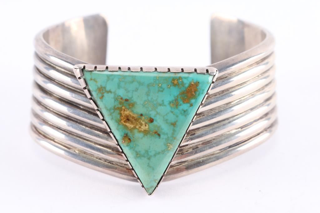 Measures 8 1/2" with gap. Heavy chiseled sterling silver cuff with large triangle of green/blue turquoise with nice matrix. Maker marked B H with diagonal arrow pointing up.