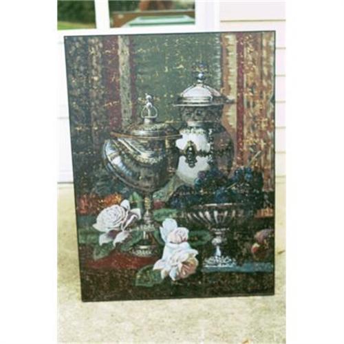Terrific Vintage Large Decorative Screen Litho with beautiful roses and silver service in formal background with greys, greens, mauves and darker red tones with purple on a one inch mounting board with finished back and wired for wall hanging...Great decorative in large format for dining or living area...Excellent condition; could be custom framed for larger, more formal look...Strong piece with unique, sophisticated image...Thanks for looking! Chas.