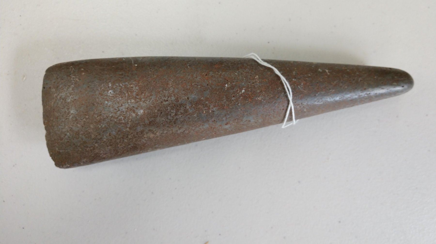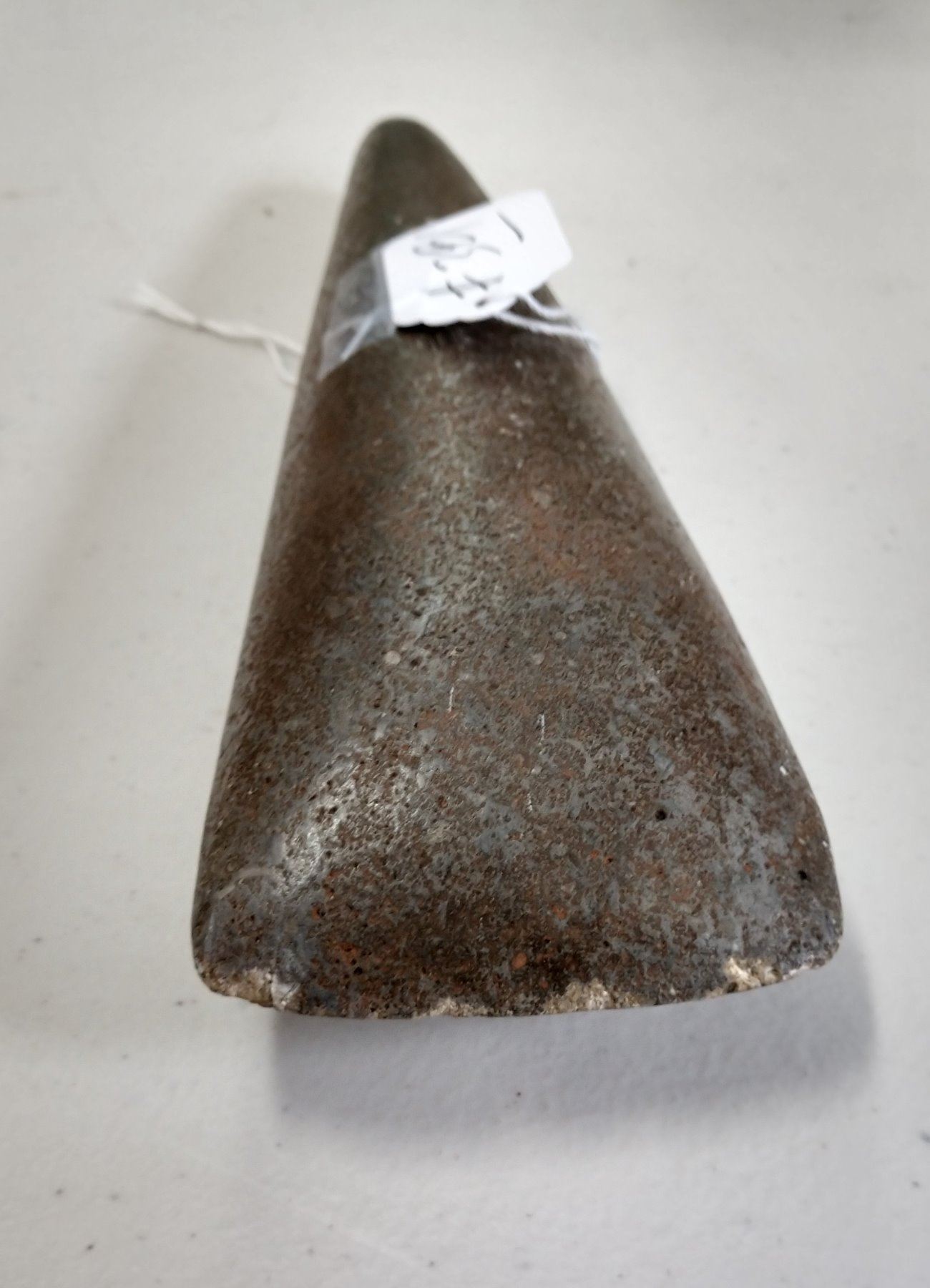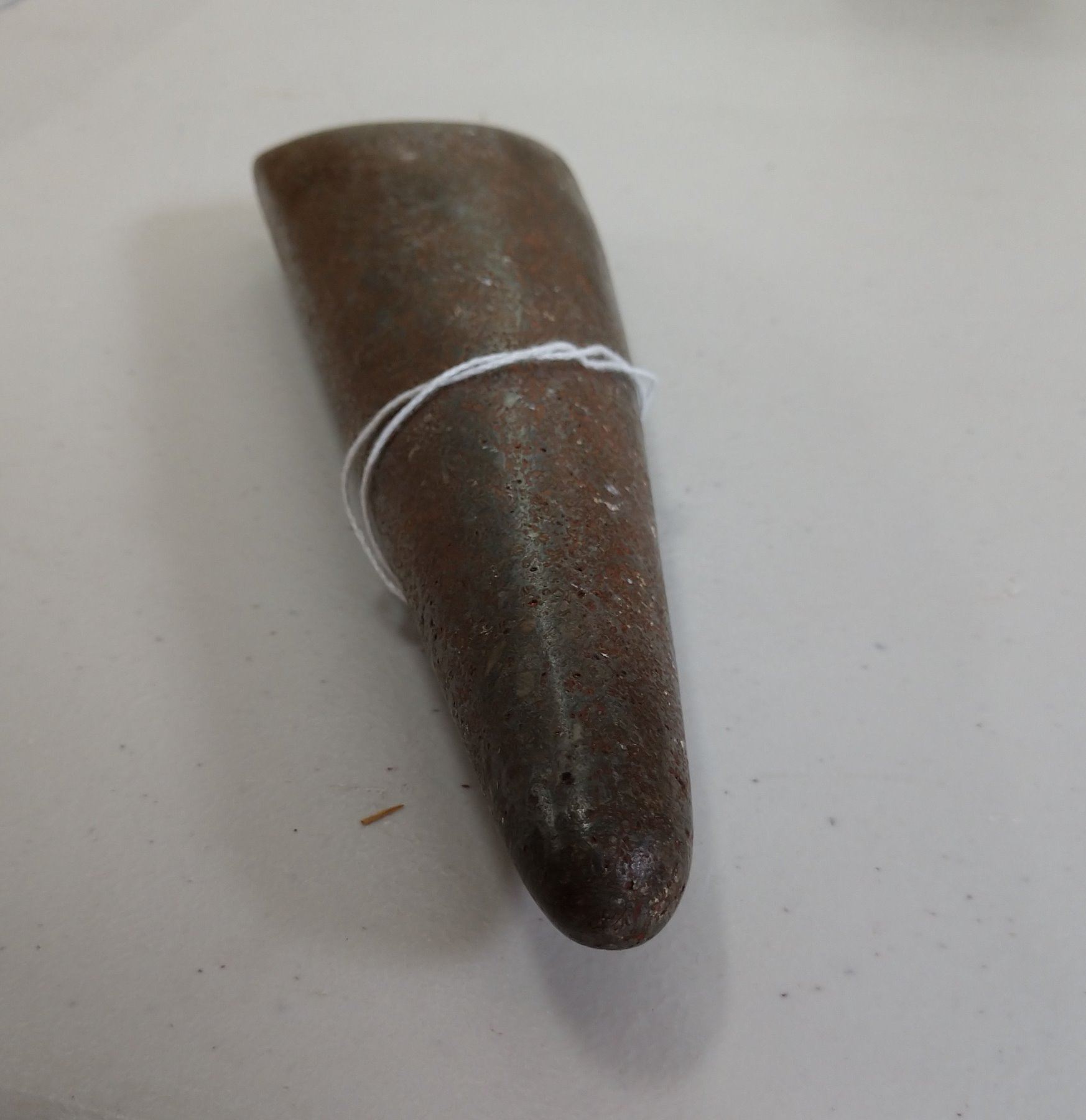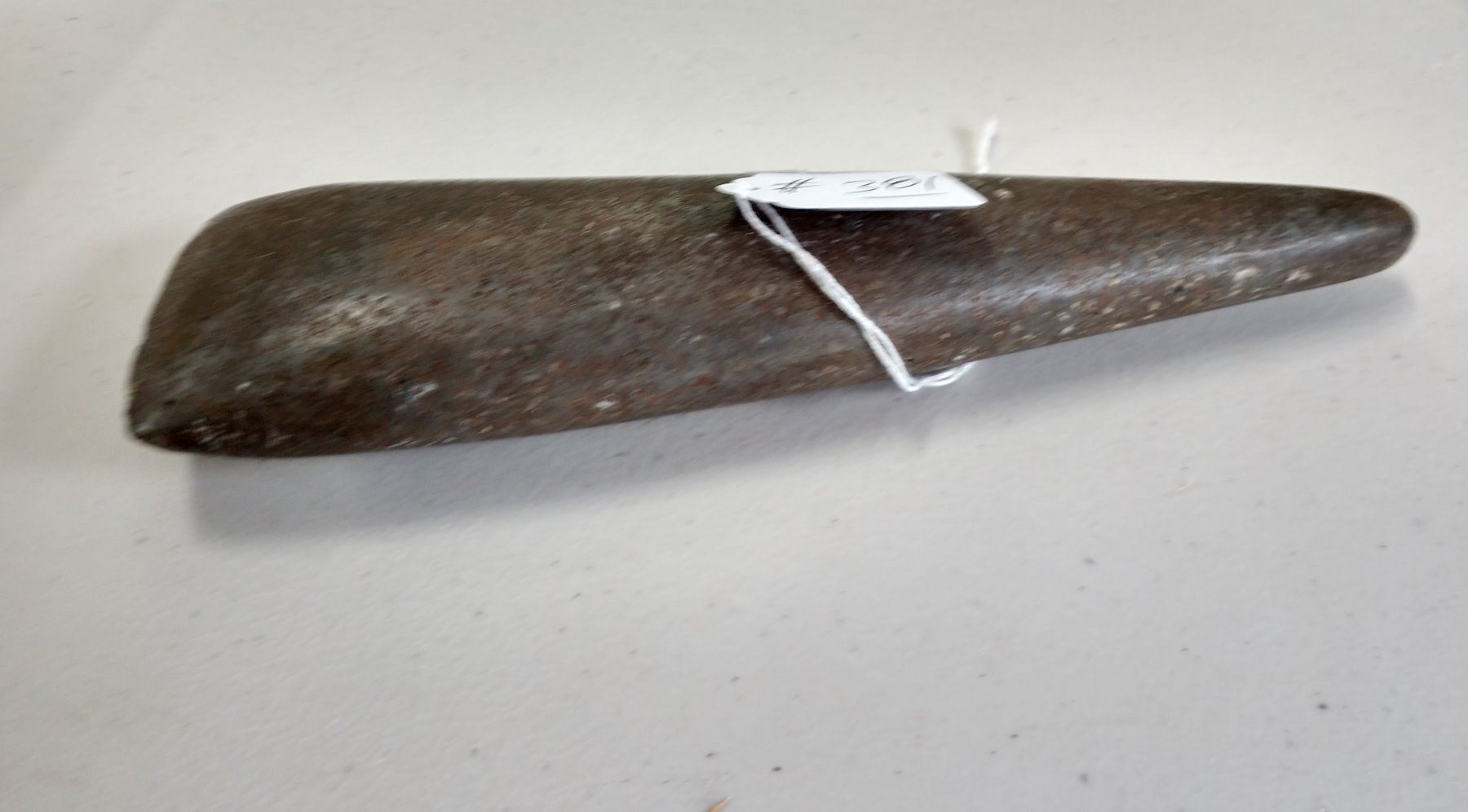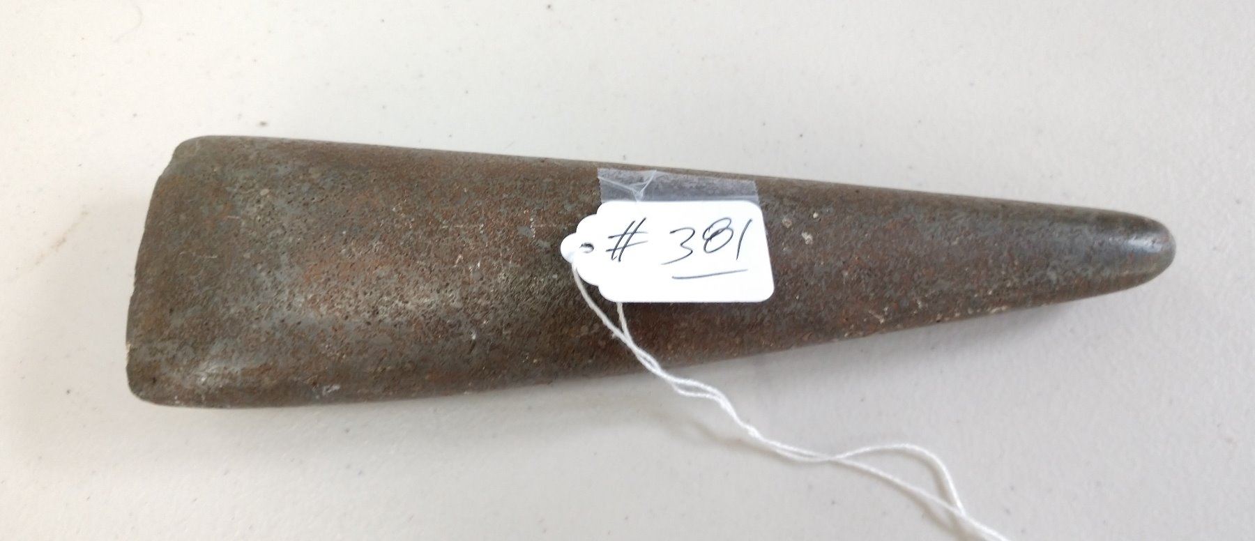 Large Stone Celt, pre-historic item. Made of basalt, the item measures 9 3/4" long. Arkansas. Condition: Some minor bit dings, see images. Shipping: $22.00 w/insurance and signature, due to size and weight.