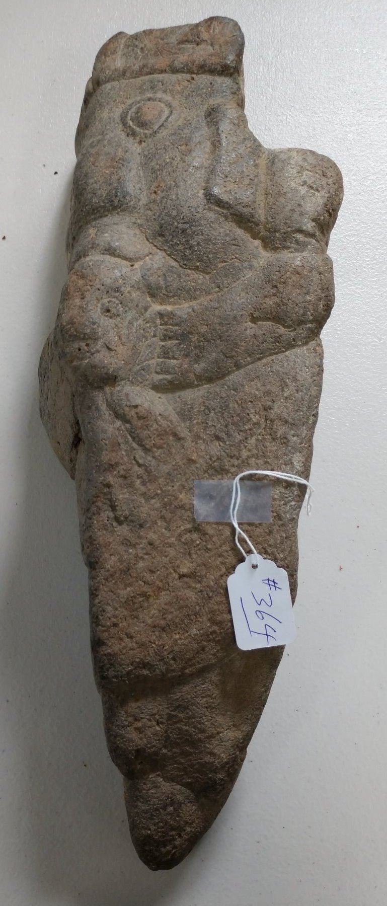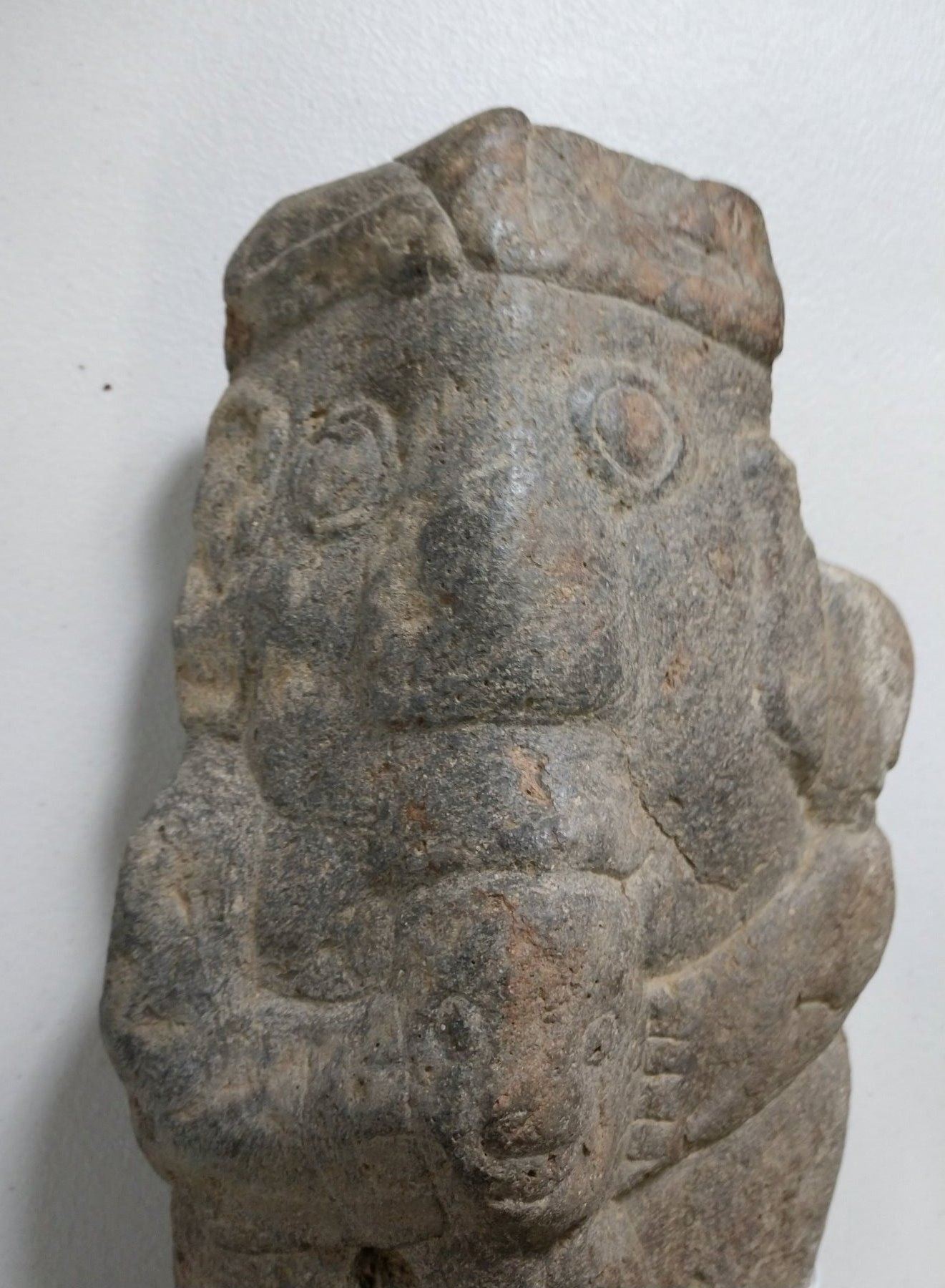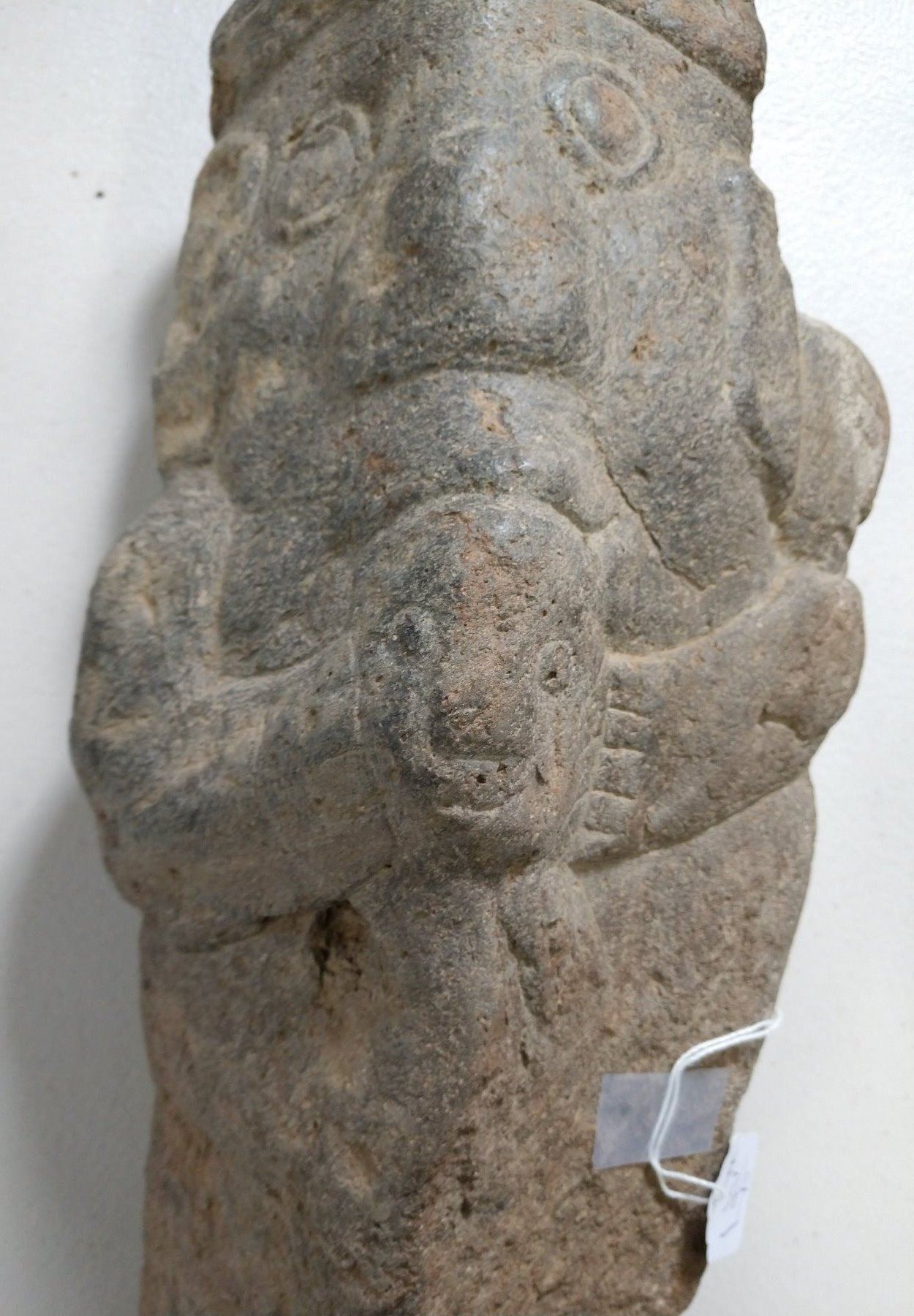 Large Stone Effigy Marker, pre-Columbian item. Made of basalt, the item measures 18" x 8" x 7". Central America. From an old, 1960s California collection. Appears to be a man holding a head. Weighs approx. 30 pounds. Condition: As found, see images. Shipping: $85.00 USA estimate only, due to weight and value.
