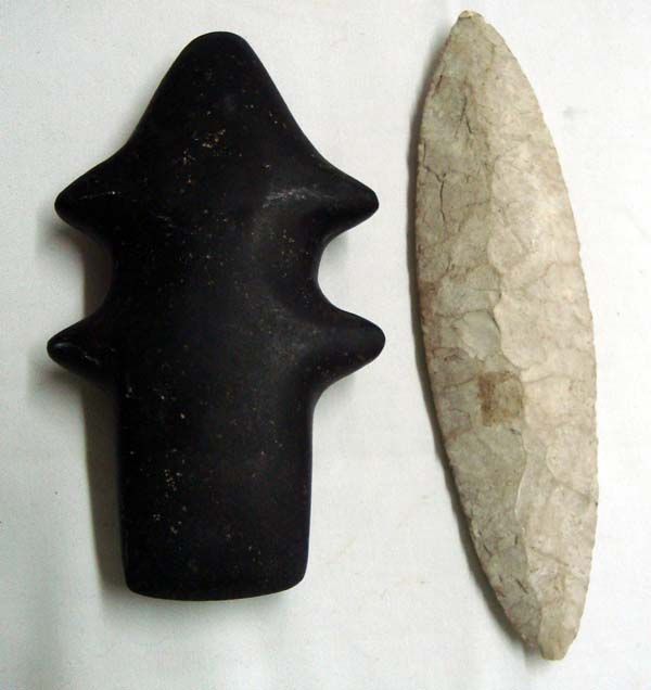Large Stone Spearpoint & Mace Spiro Club. Age & Origin Unknown. Spearhead measures approx. 9'' L x 2.25''W.