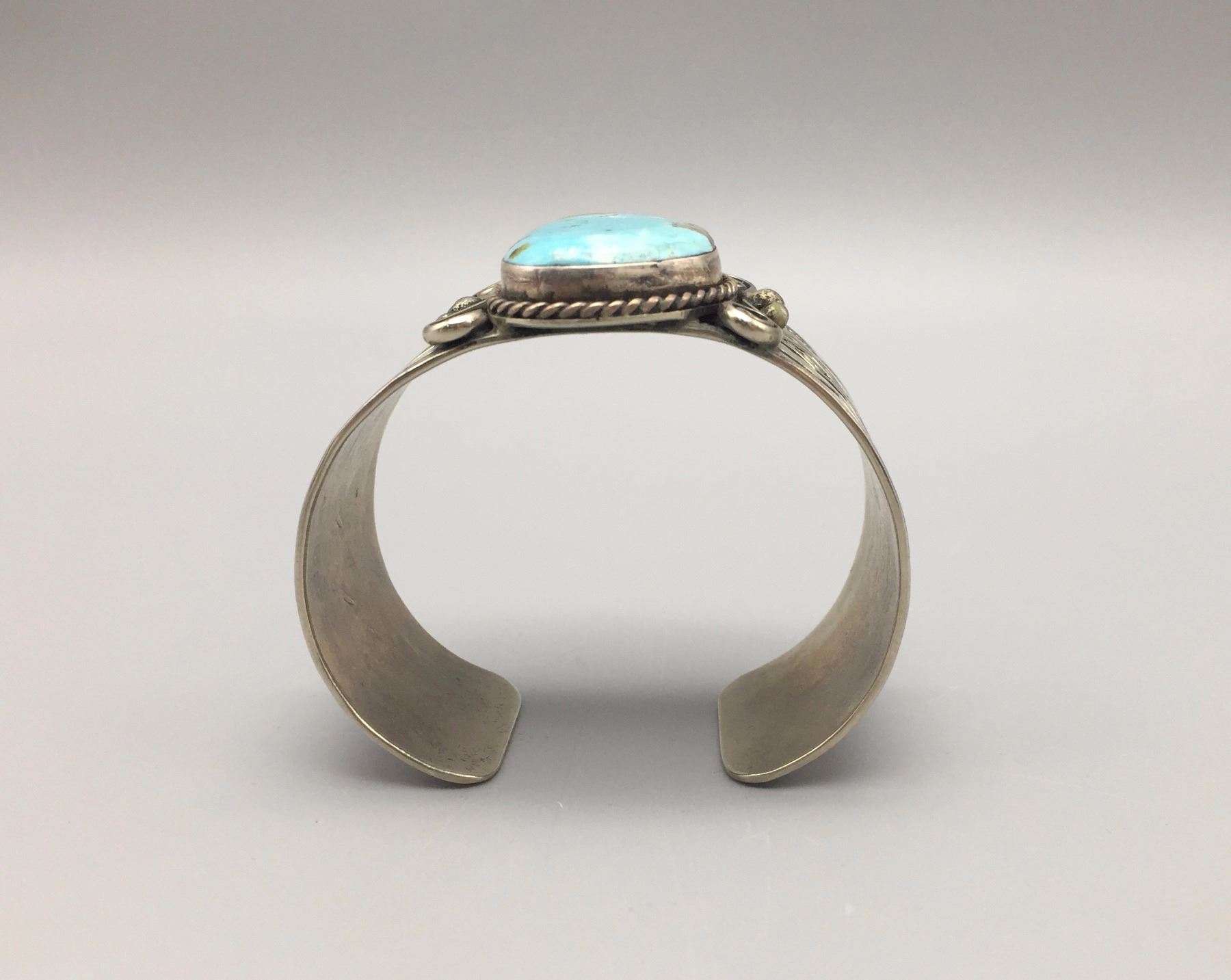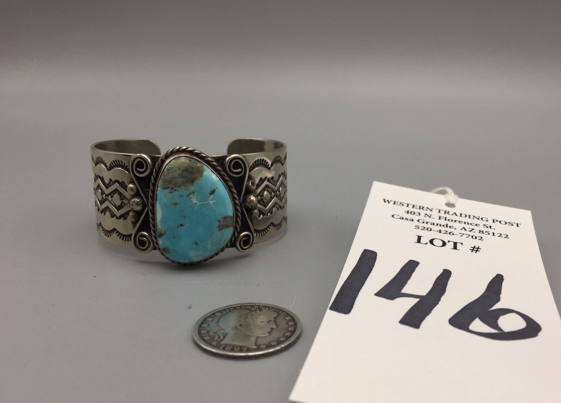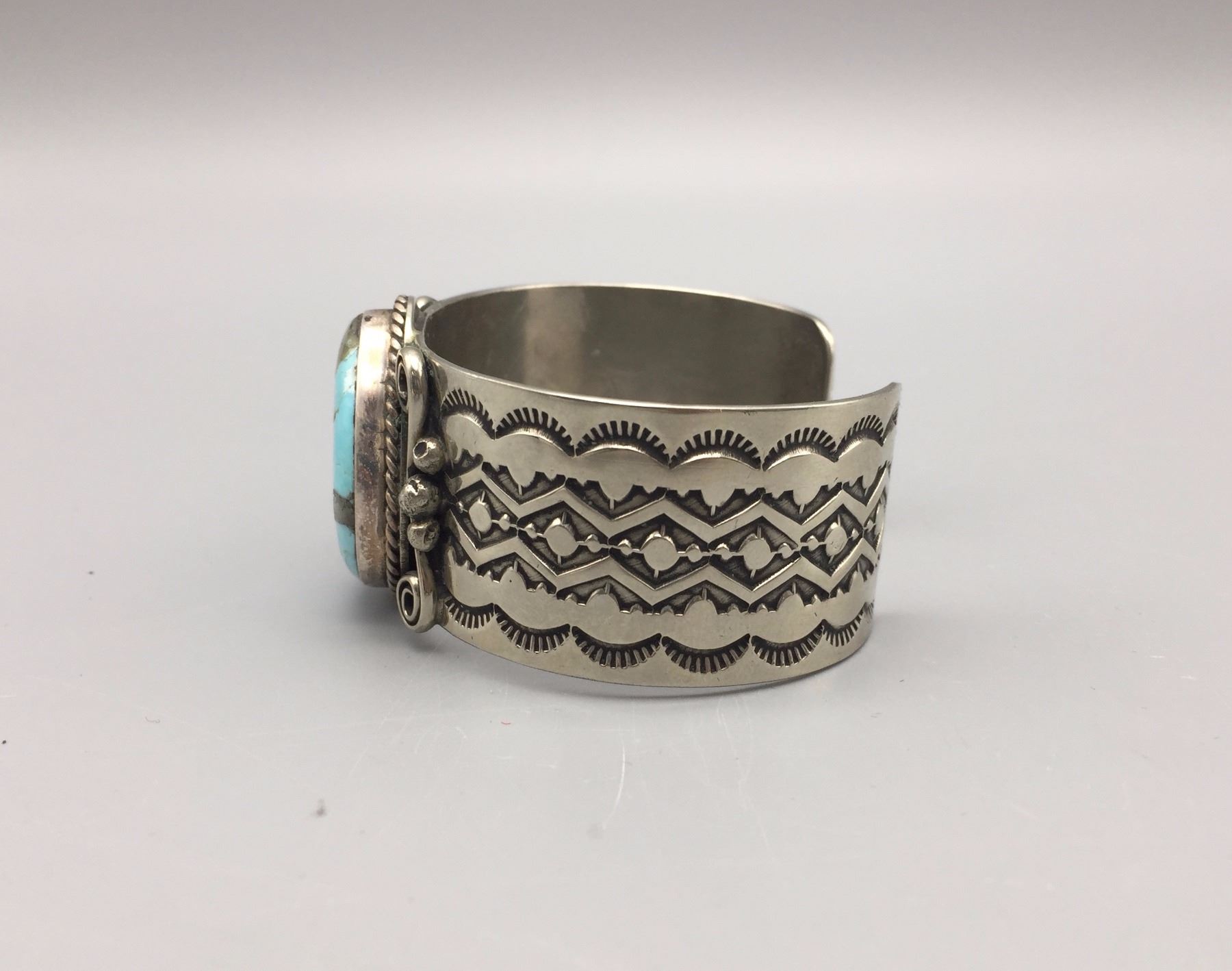 Maker: Unknown. Approx. Age: Fairly modern. Size: Inside circumference measures 5 7/8” with an additional 1” opening, (fitting a 6 7/8” wrist) approx. 1 3/8” wide and weighs 57.6 g. Additional Info: A nice turquoise stone bracelet. Appears to be sterling silver, but not marked or tested. Condition: Good for it’s age, normal wear expected. Please look closely at the pictures - they are an important part of our description. Shipping: There will be a $5 handling / packaging fee for shipping this lot. The actual cost of postage will be added on top of that.