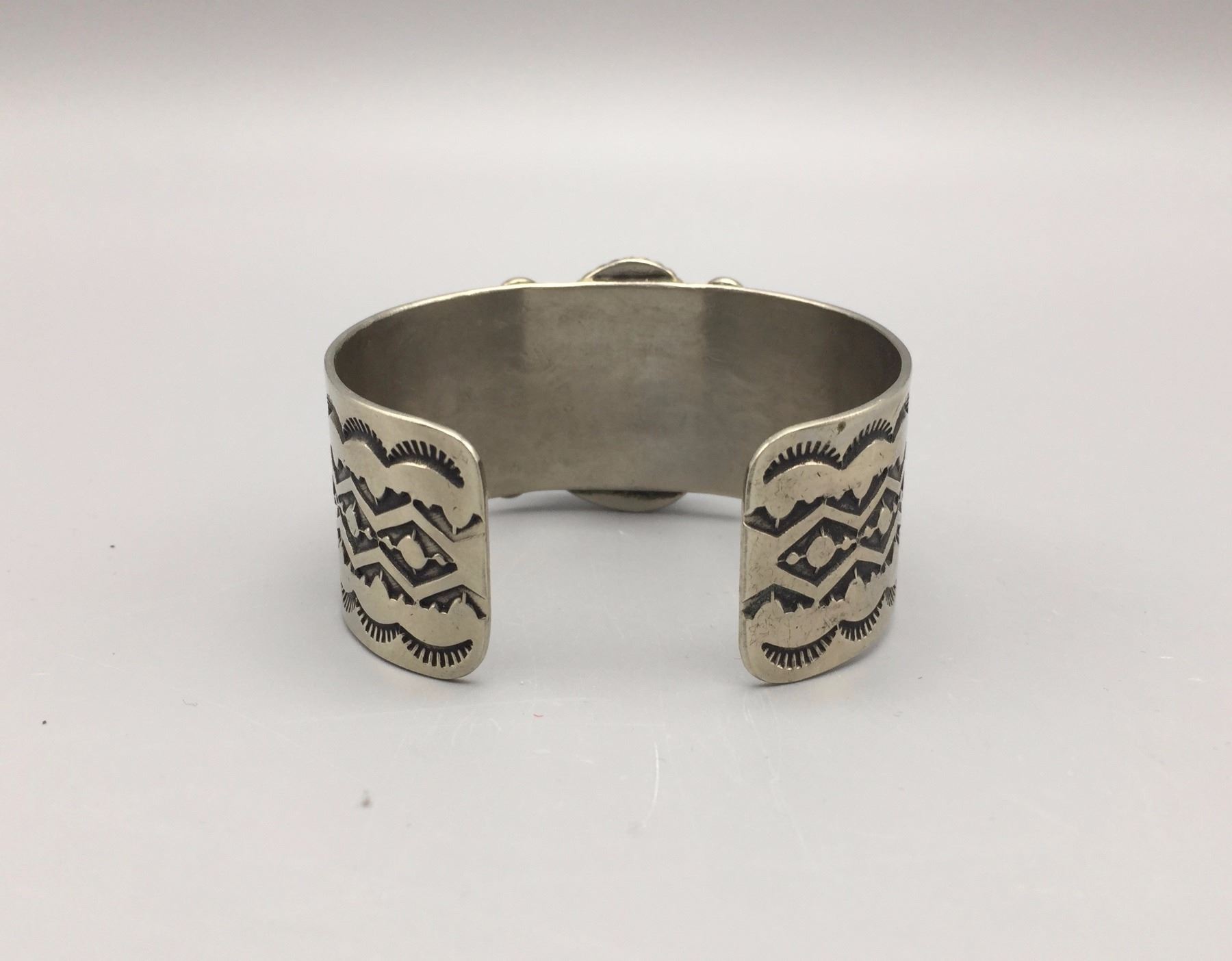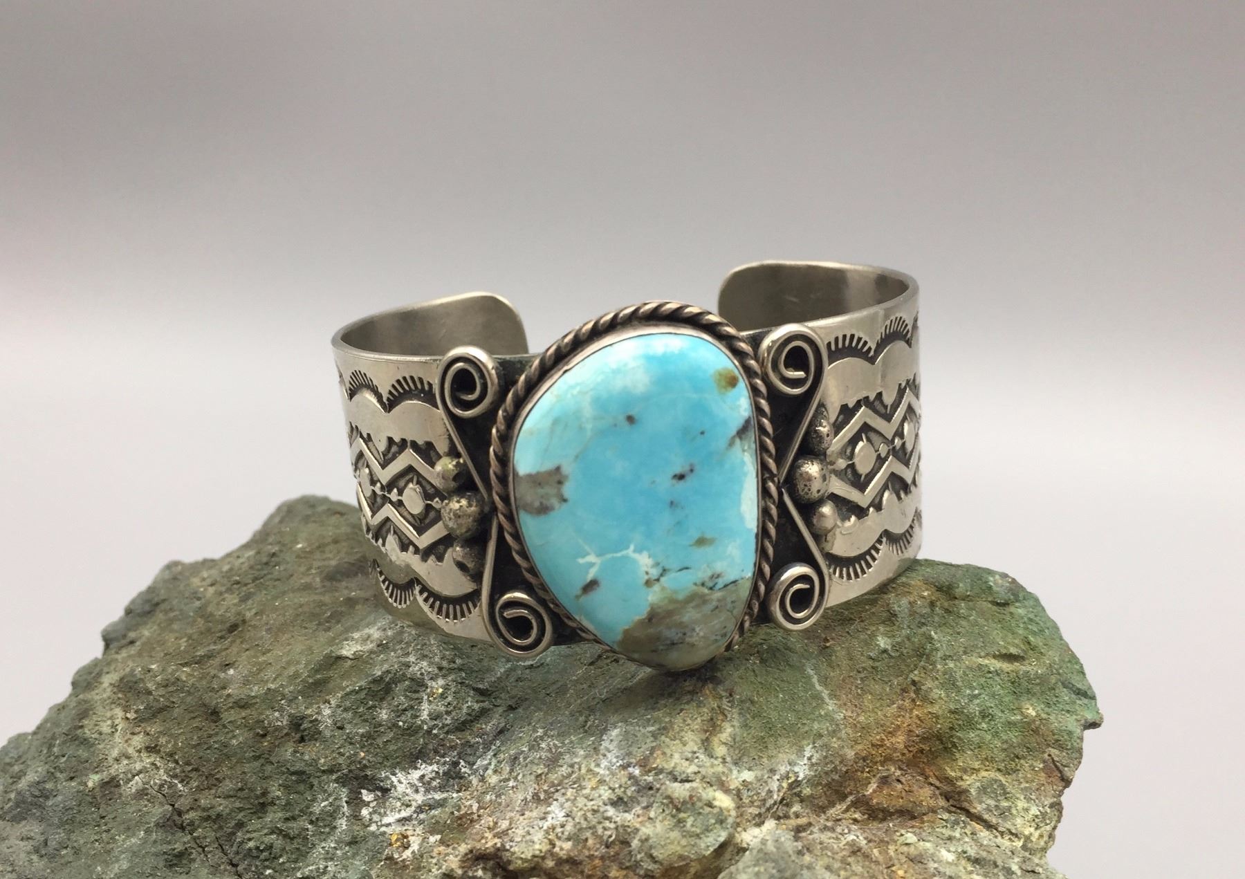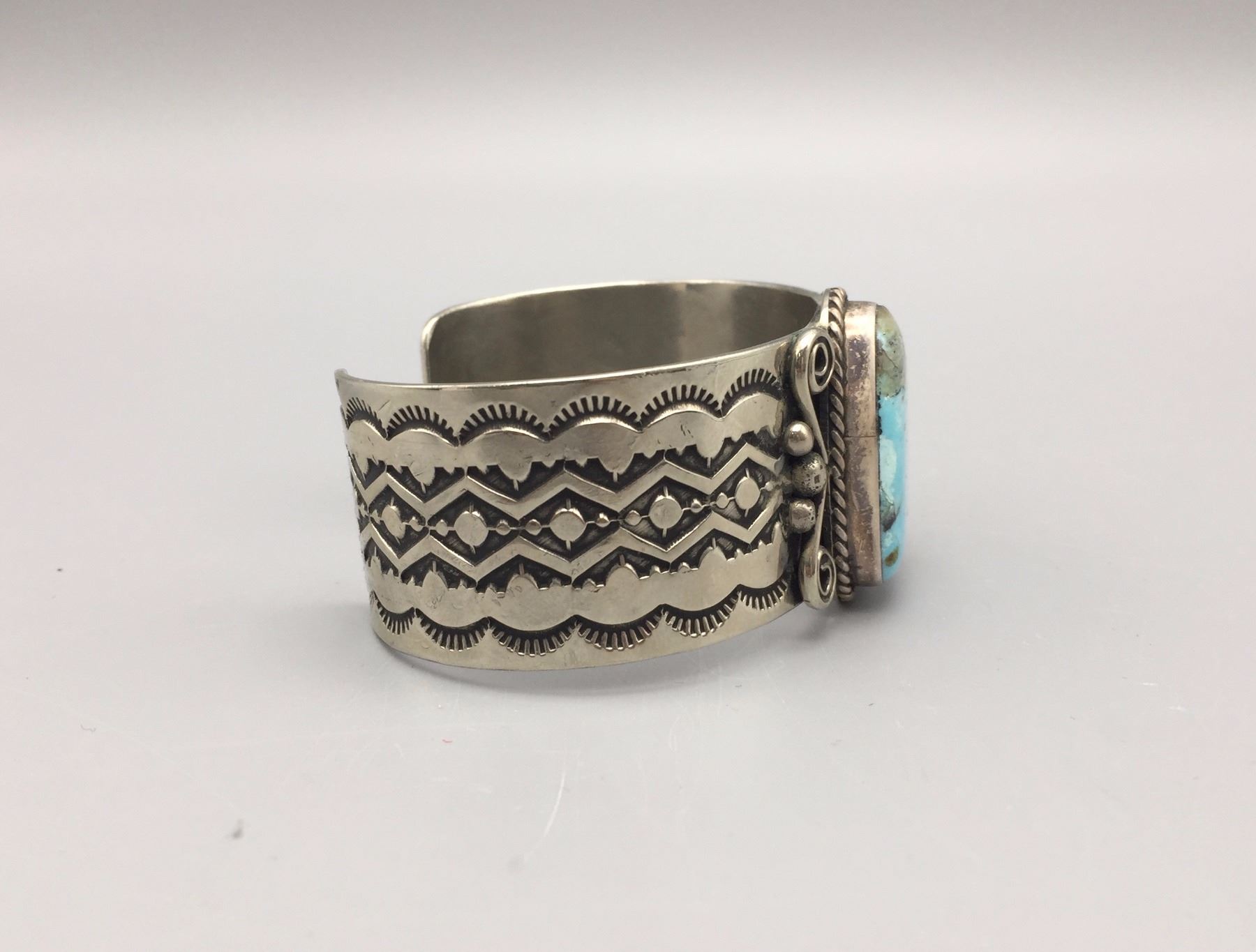 Maker: Unknown. Approx. Age: Fairly modern. Size: Inside circumference measures 5 7/8” with an additional 1” opening, (fitting a 6 7/8” wrist) approx. 1 3/8” wide and weighs 57.6 g. Additional Info: A nice turquoise stone bracelet. Appears to be sterling silver, but not marked or tested. Condition: Good for it’s age, normal wear expected. Please look closely at the pictures - they are an important part of our description. Shipping: There will be a $5 handling / packaging fee for shipping this lot. The actual cost of postage will be added on top of that.