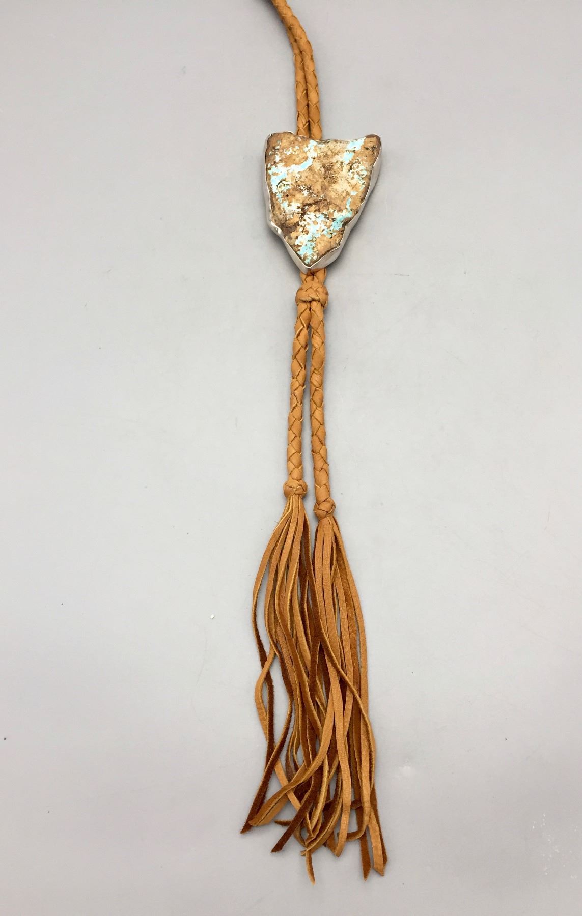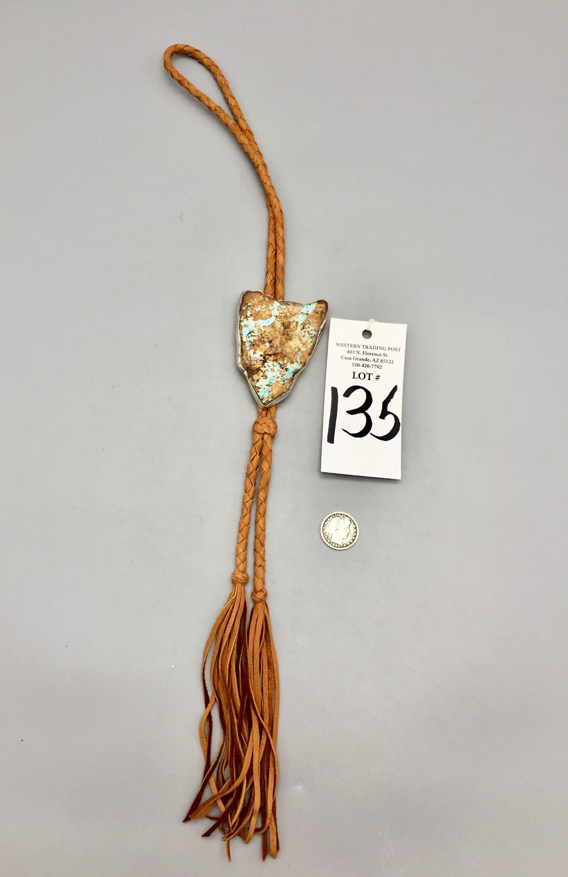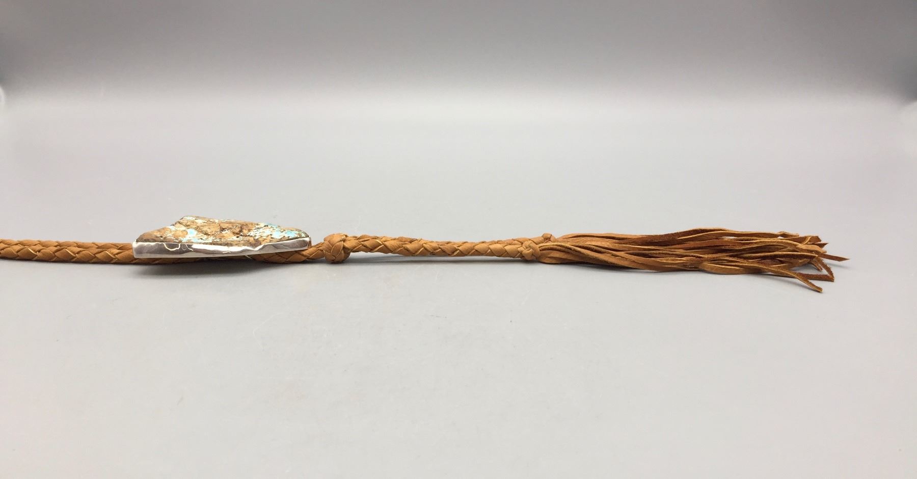 Description: Offered for sale in this lot is a bolo featuring a large, nugget style stone that is set in sterling silver. The braided cord on this bolo is made of soft brown deer skin leather. Maker: No hallmark was found. Approx. Age: Fairly modern. Size: Fits a 25” neck. Slide measures 2-1/4” w x 3” tall. Weighs 104 grams. Condition: Good for its age, normal wear expected. Please look closely at the pictures - they are an important part of our description. Shipping: There will be a $5 handling / packaging fee for shipping this lot. The actual cost of postage will be added on top of that.