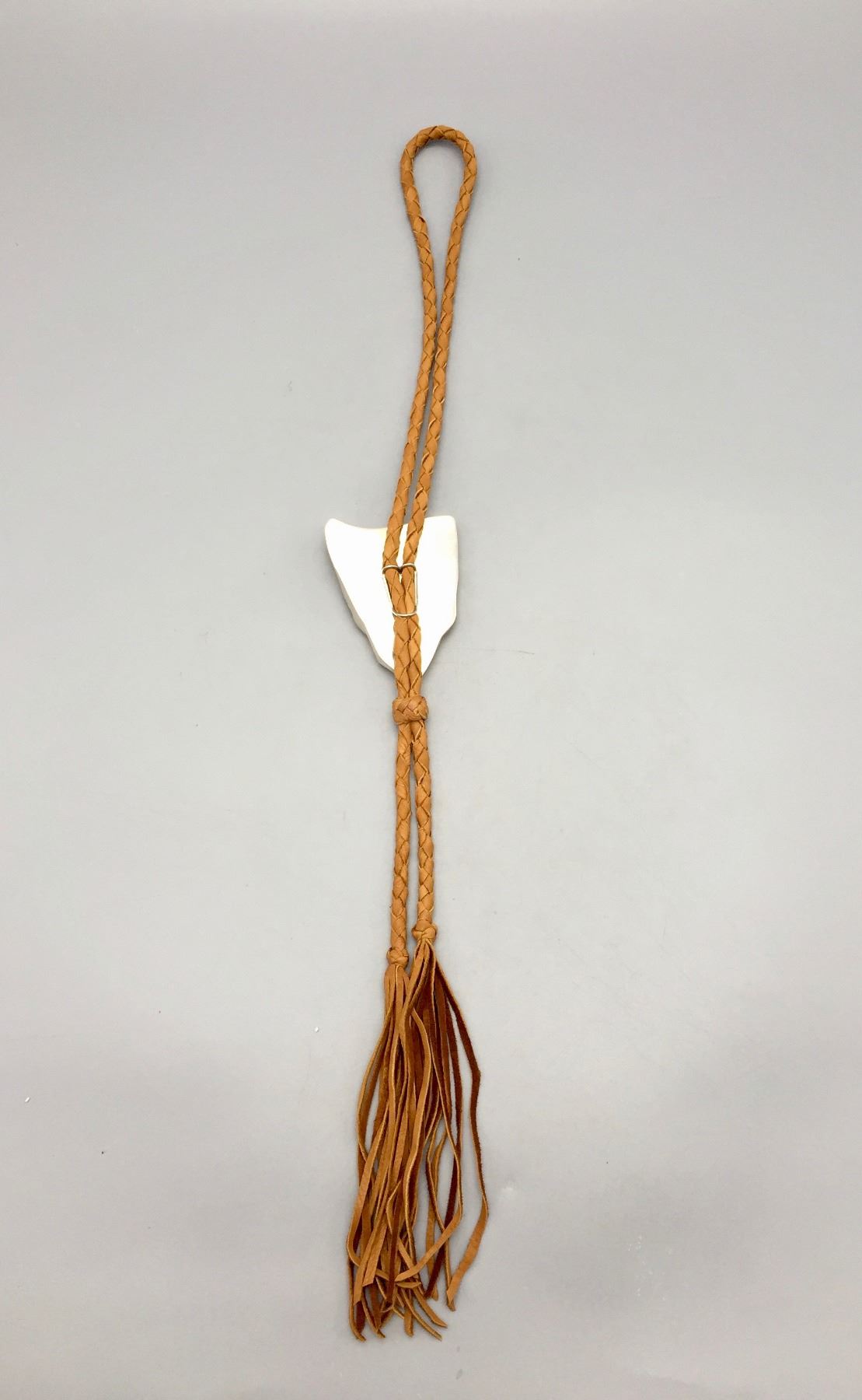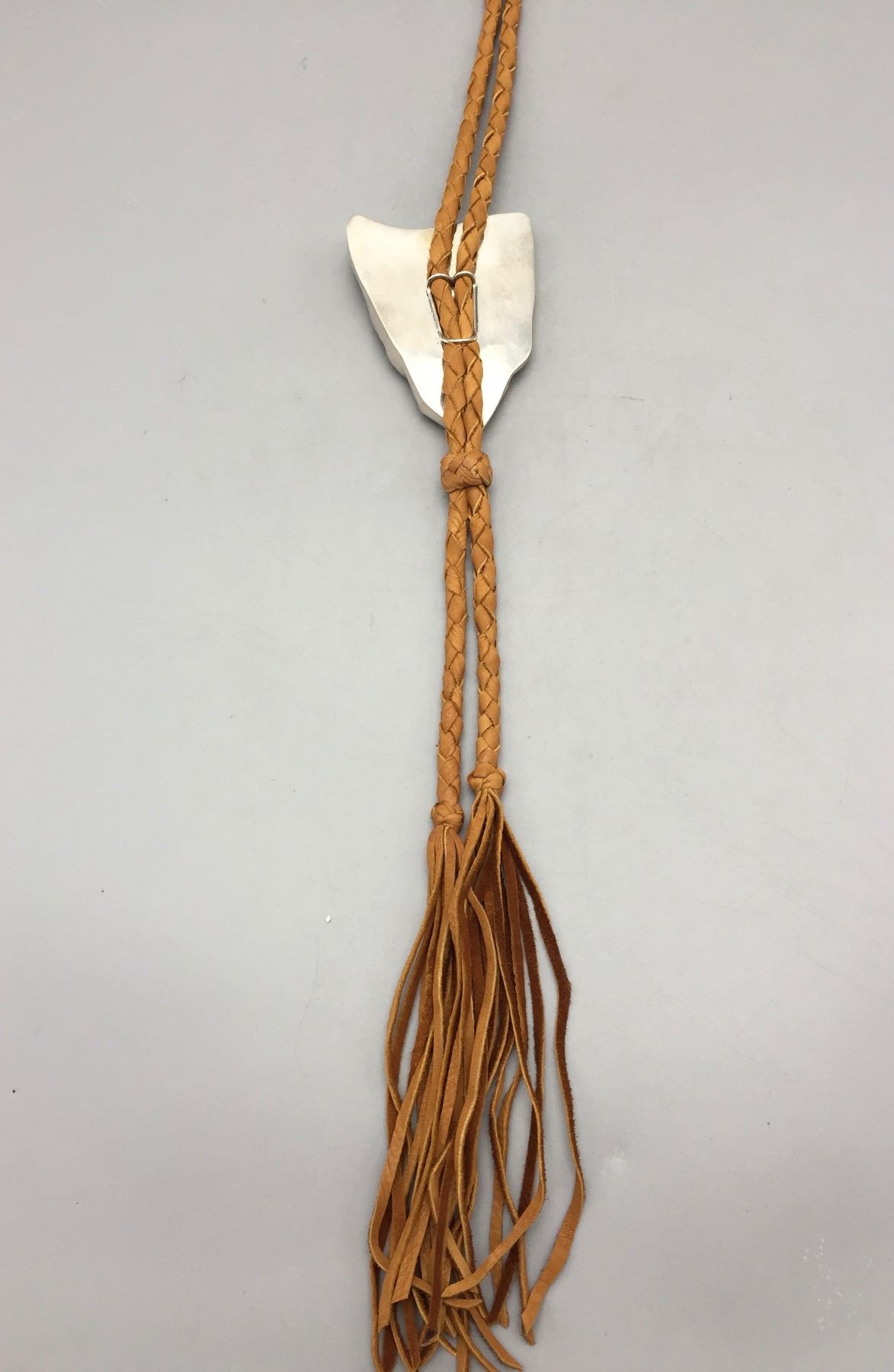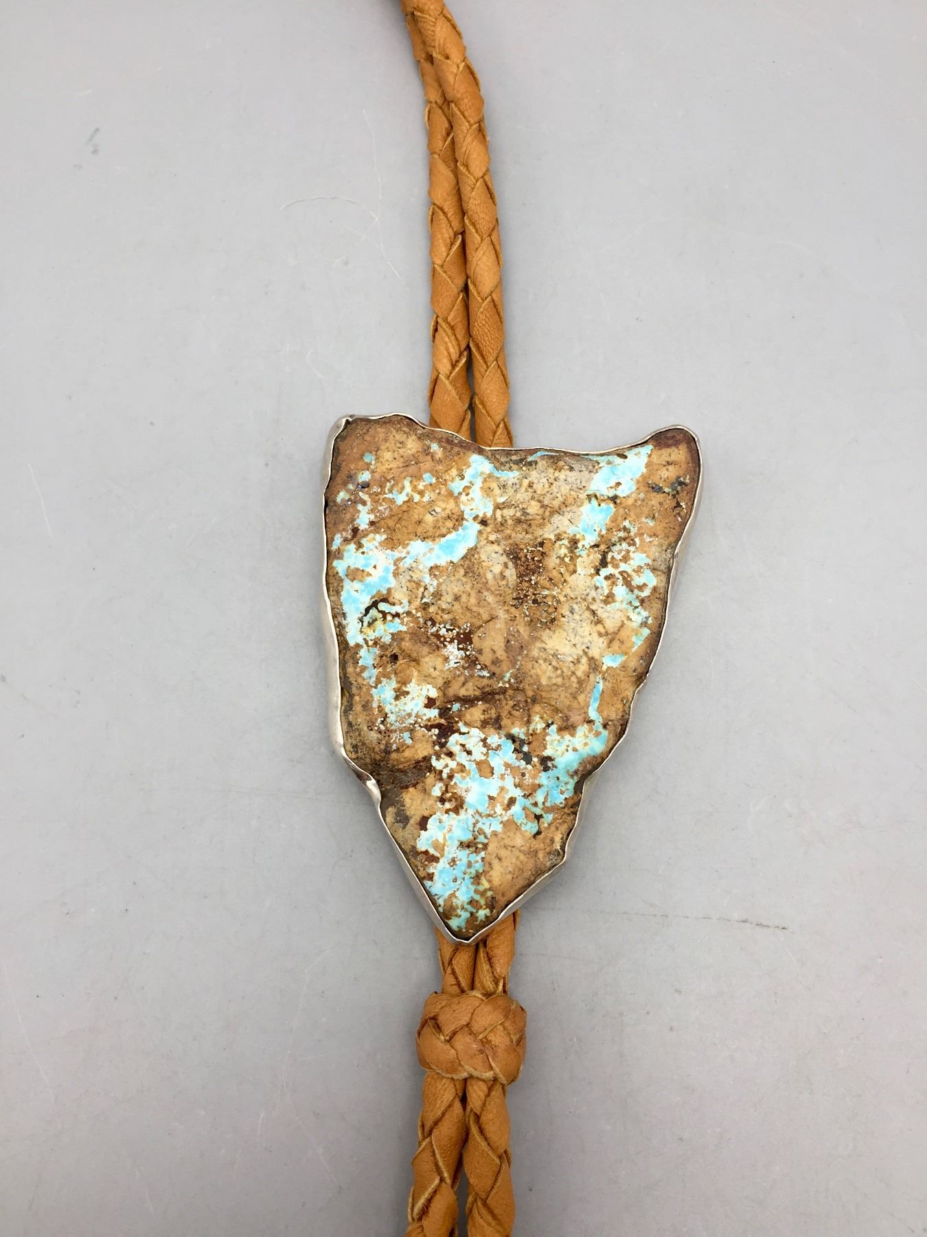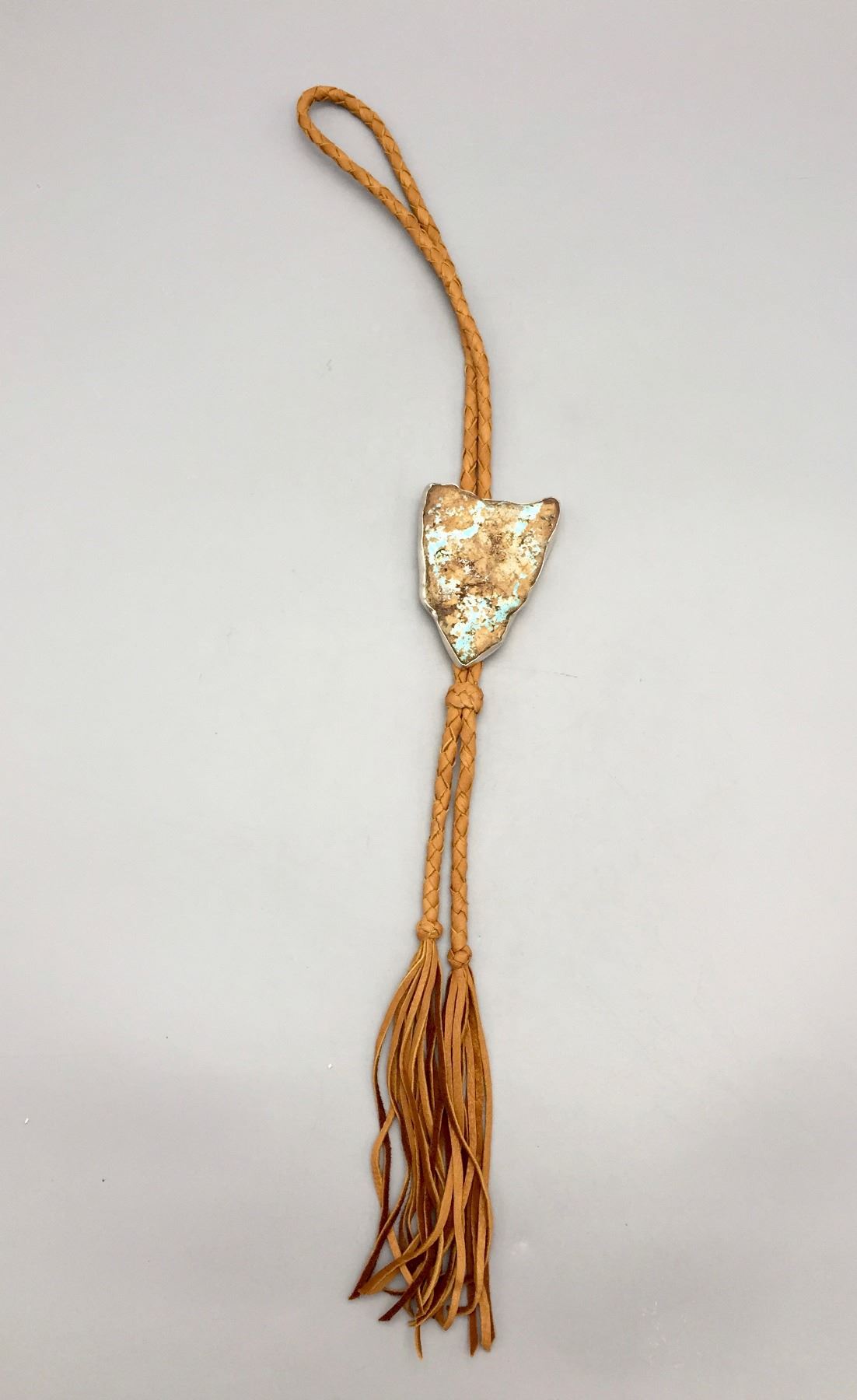 Description: Offered for sale in this lot is a bolo featuring a large, nugget style stone that is set in sterling silver. The braided cord on this bolo is made of soft brown deer skin leather. Maker: No hallmark was found. Approx. Age: Fairly modern. Size: Fits a 25” neck. Slide measures 2-1/4” w x 3” tall. Weighs 104 grams. Condition: Good for its age, normal wear expected. Please look closely at the pictures - they are an important part of our description. Shipping: There will be a $5 handling / packaging fee for shipping this lot. The actual cost of postage will be added on top of that.