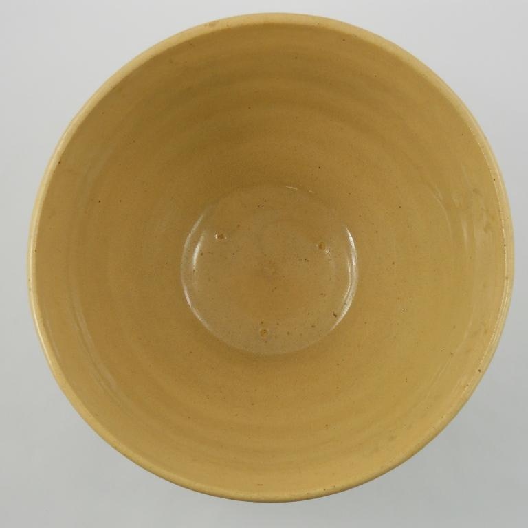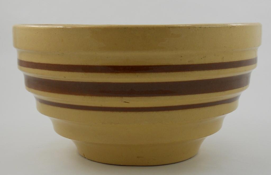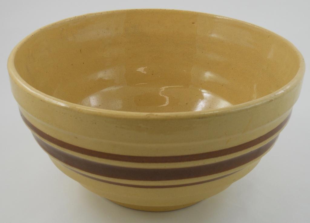 This is a nice large bowl. The overall size of this is 5-1/2 inches tall x 10-7/8 inches in diameter. There are no chips or cracks, and the tan with brown stripe design looks good. This is just a nice bowl to have out on a counter!