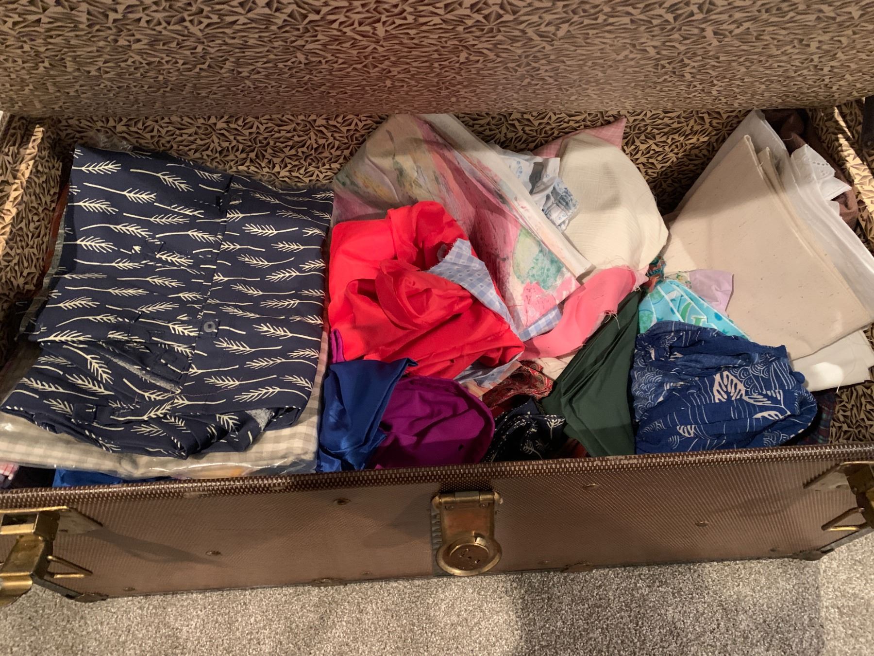Large Storage Chest With Assorted Sewing Materials (Buttons, Fabric, & Thread)