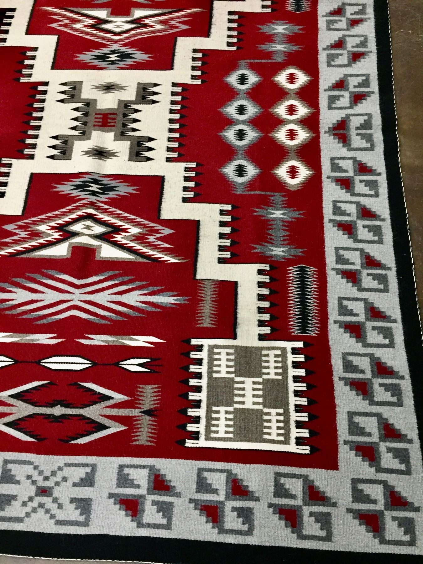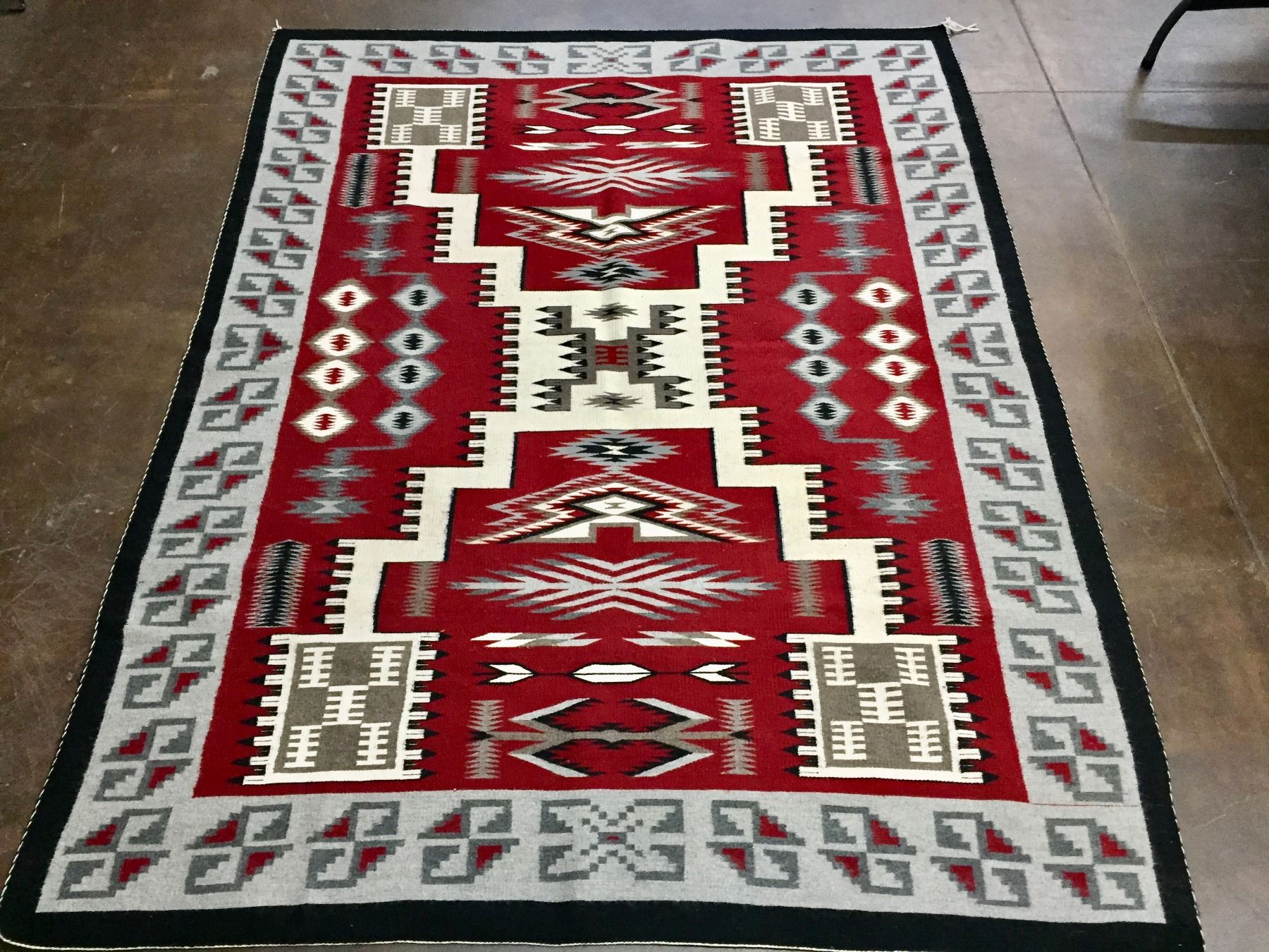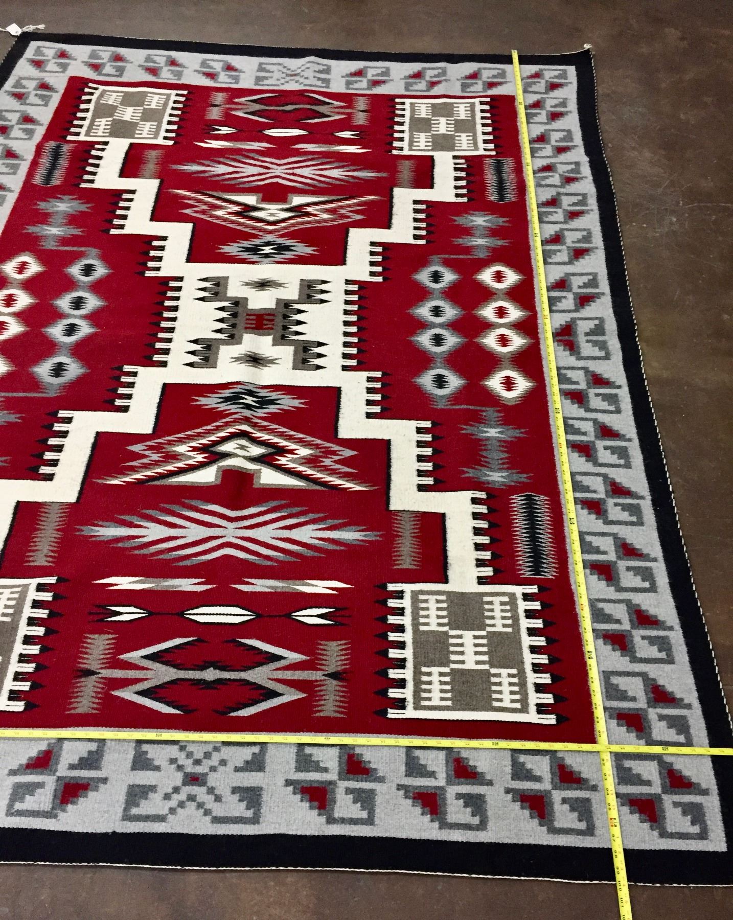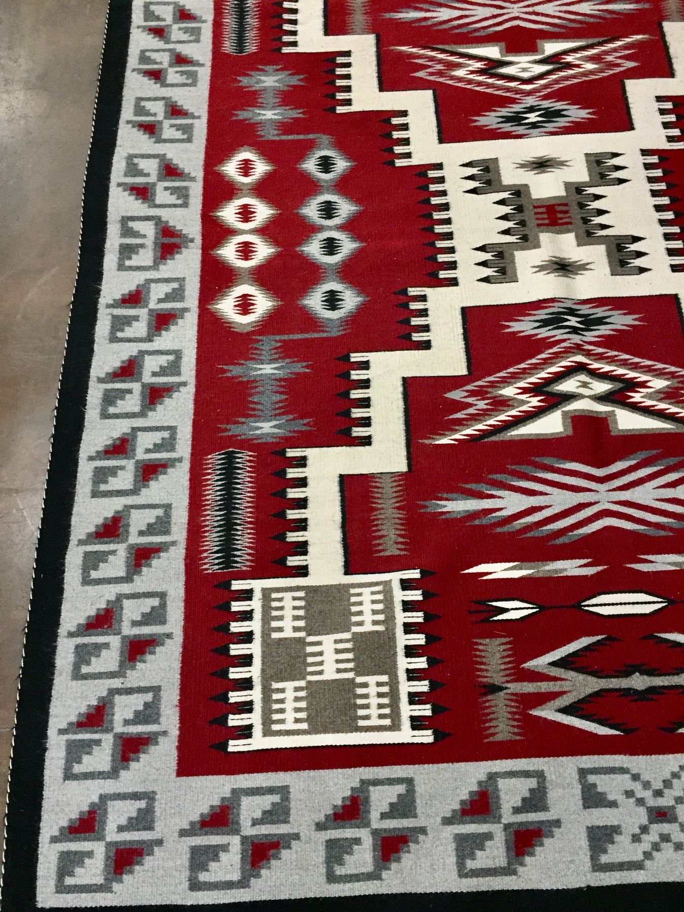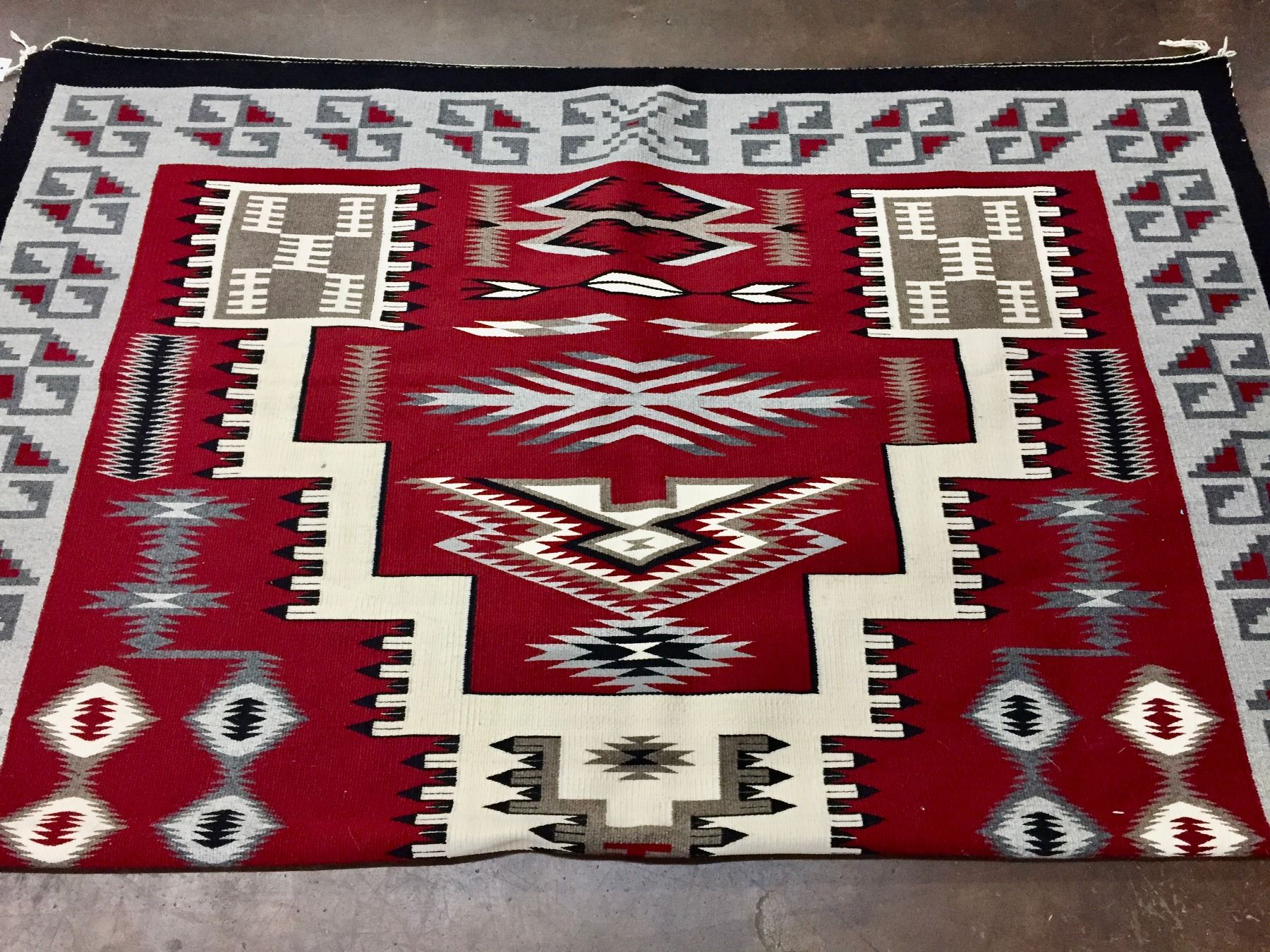 Description: Presented for sale in this lot is a very nicely woven Navajo rug with a storm pattern featuring reds, blacks, grays and whites. If you like masterful Navajo Textiles which can be hung like a painting, this is a great weaving for you! Maker: Unknown Navajo Weaver. Approx. Age: Vintage. Size: Large, 77” x 99” Condition: Good for its age, normal wear expected. Please look closely at the pictures - they are an important part of our description. Shipping: There will be a $10 handling / packaging fee for shipping this lot. The actual cost of postage will be added on top of that.