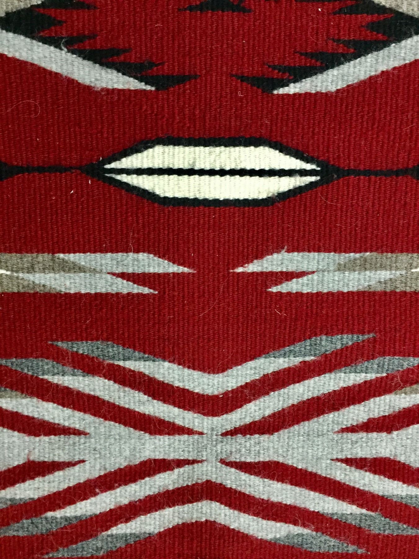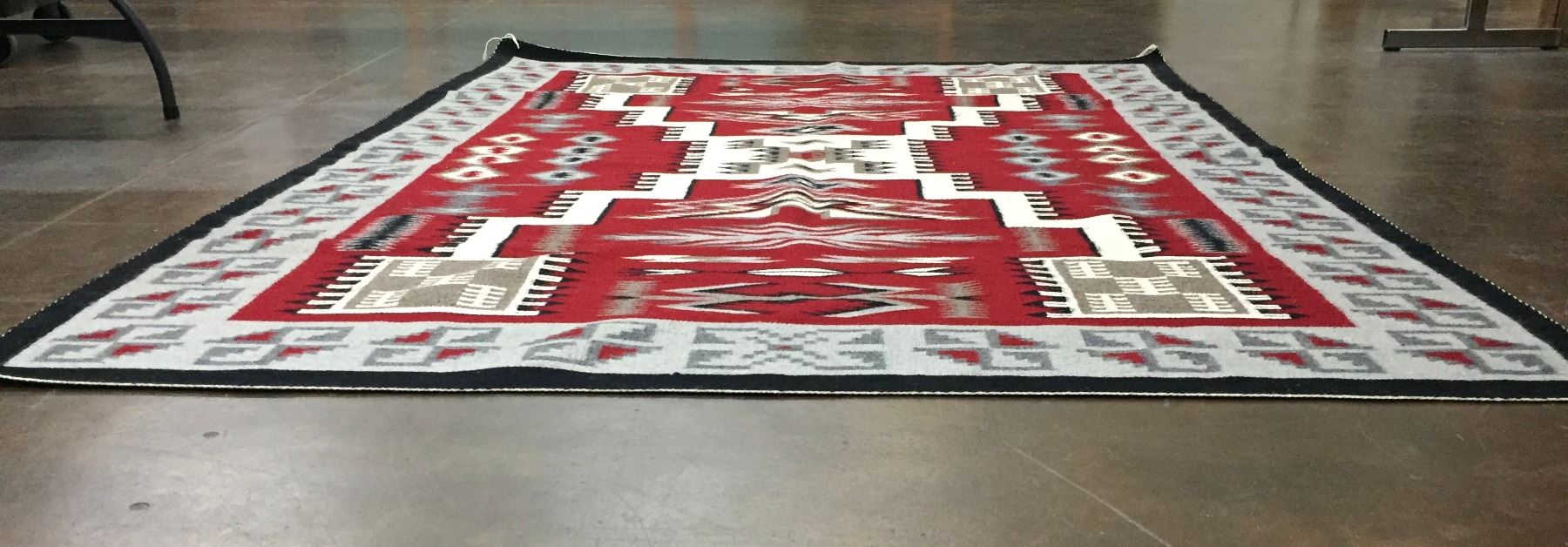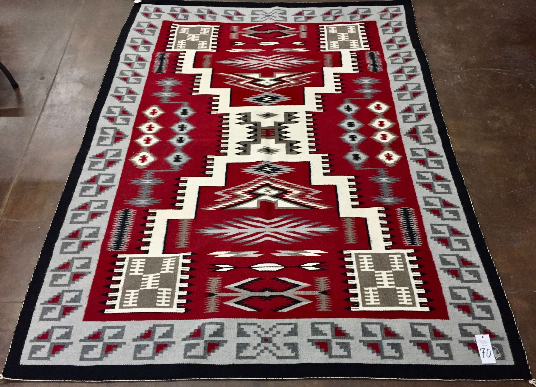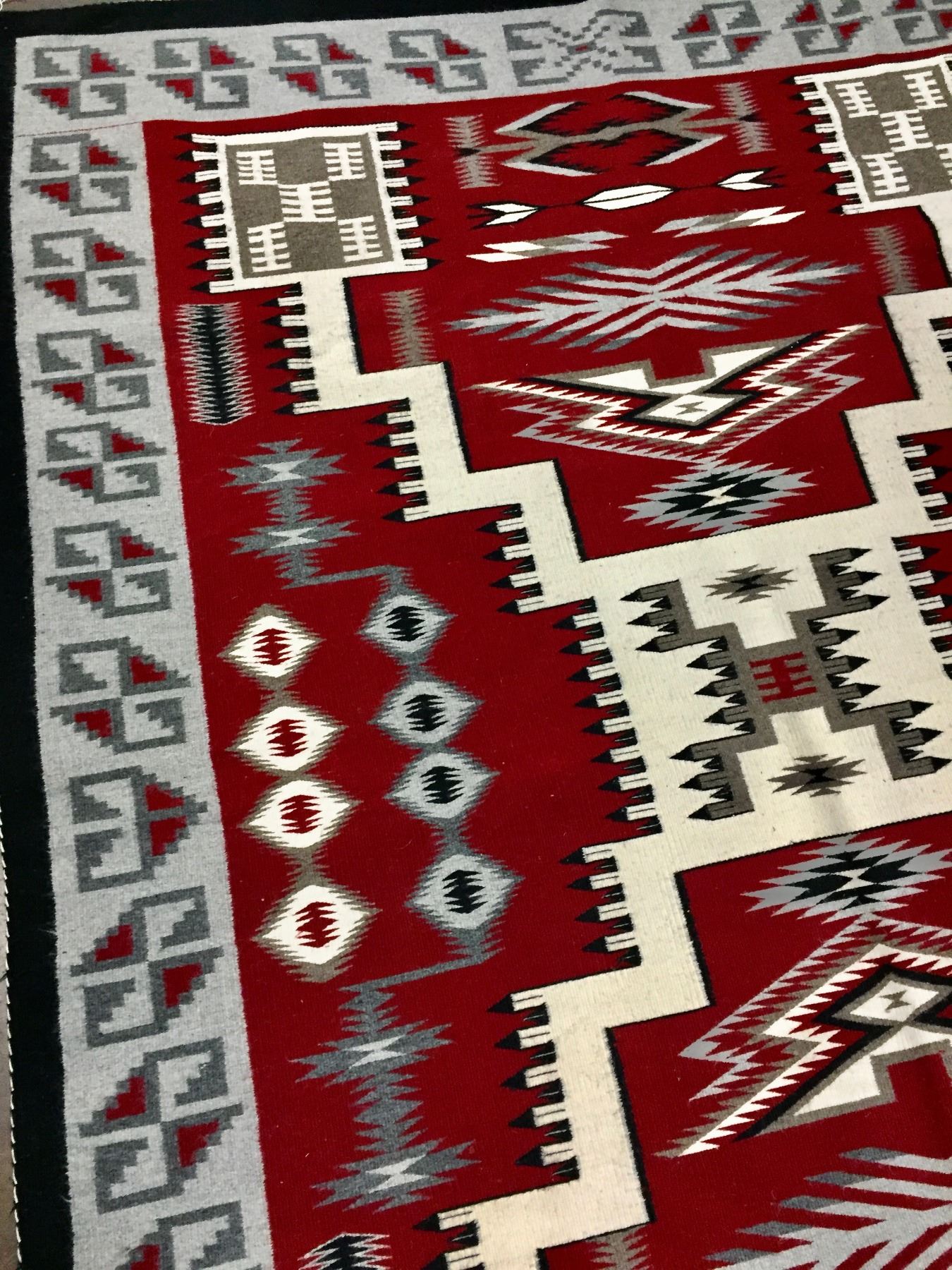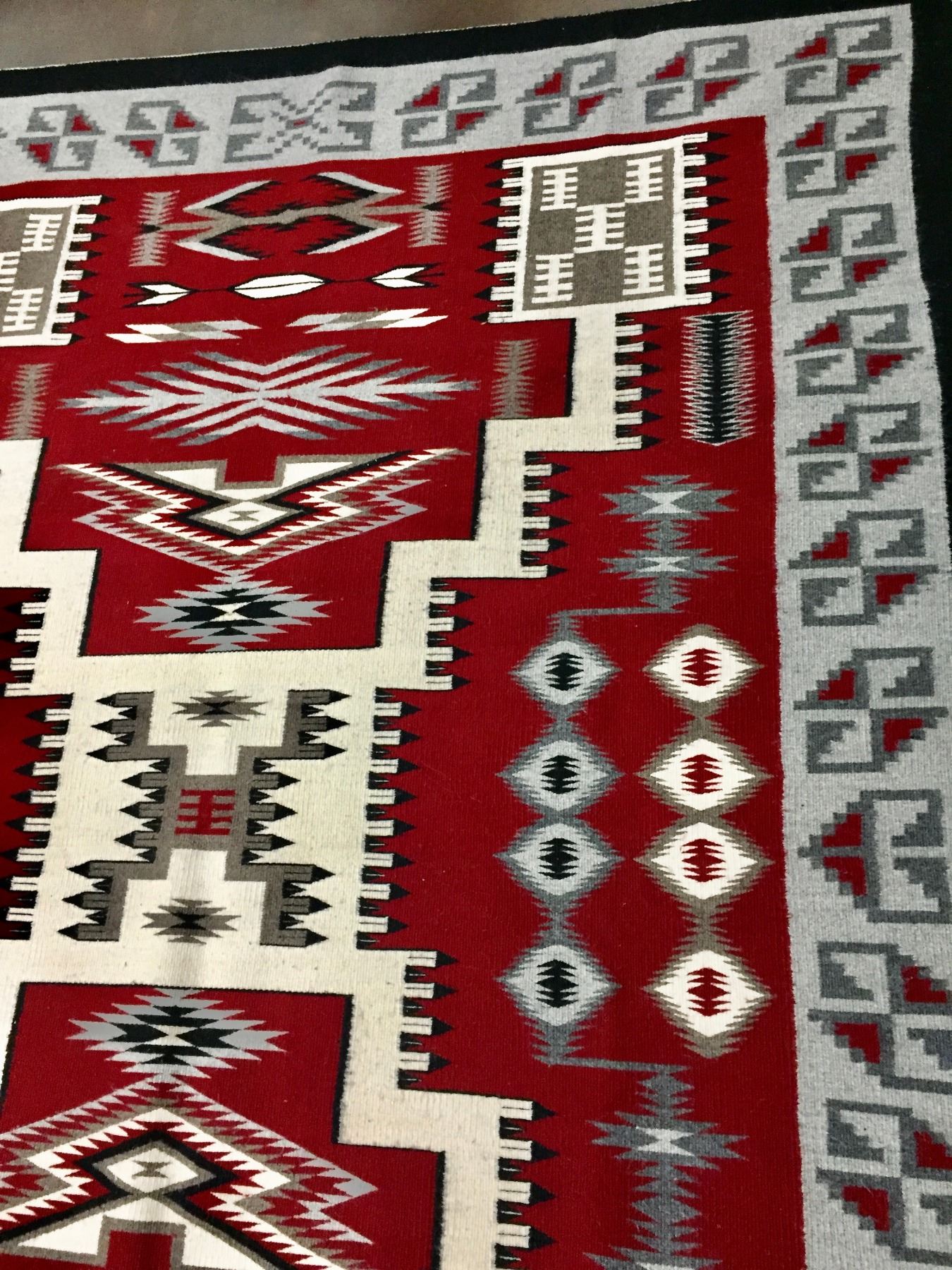 Description: Presented for sale in this lot is a very nicely woven Navajo rug with a storm pattern featuring reds, blacks, grays and whites. If you like masterful Navajo Textiles which can be hung like a painting, this is a great weaving for you! Maker: Unknown Navajo Weaver. Approx. Age: Vintage. Size: Large, 77” x 99” Condition: Good for its age, normal wear expected. Please look closely at the pictures - they are an important part of our description. Shipping: There will be a $10 handling / packaging fee for shipping this lot. The actual cost of postage will be added on top of that.
