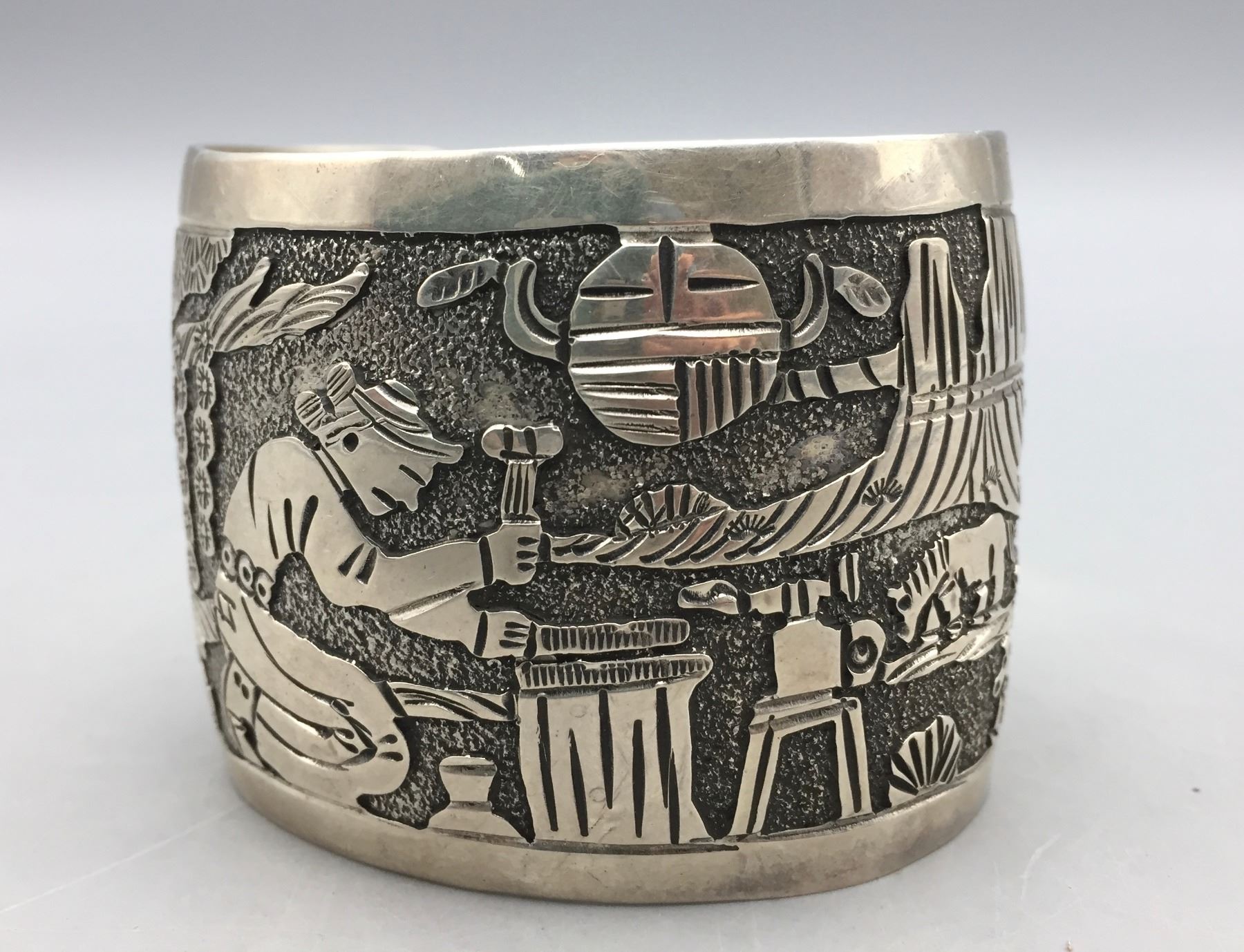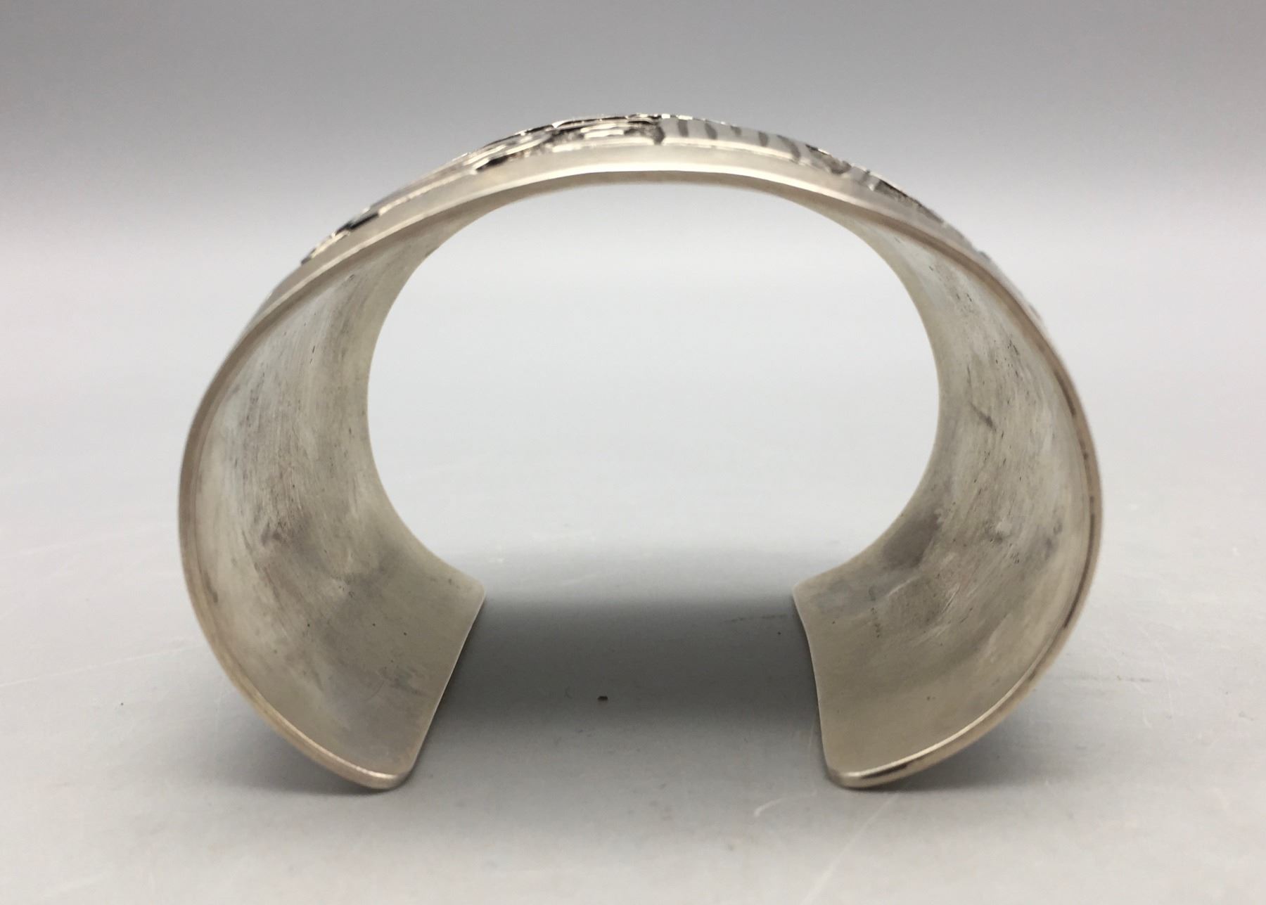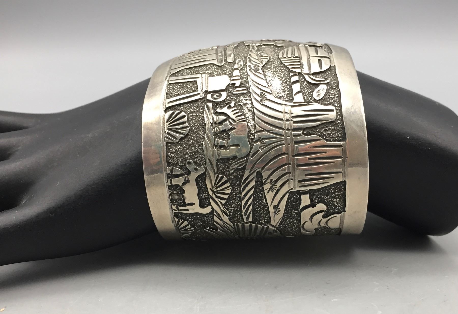 Description: Offered for sale in this lot is a large, overlay storyteller bracelet, marked as sterling silver. Maker: Hallmarked with a B.