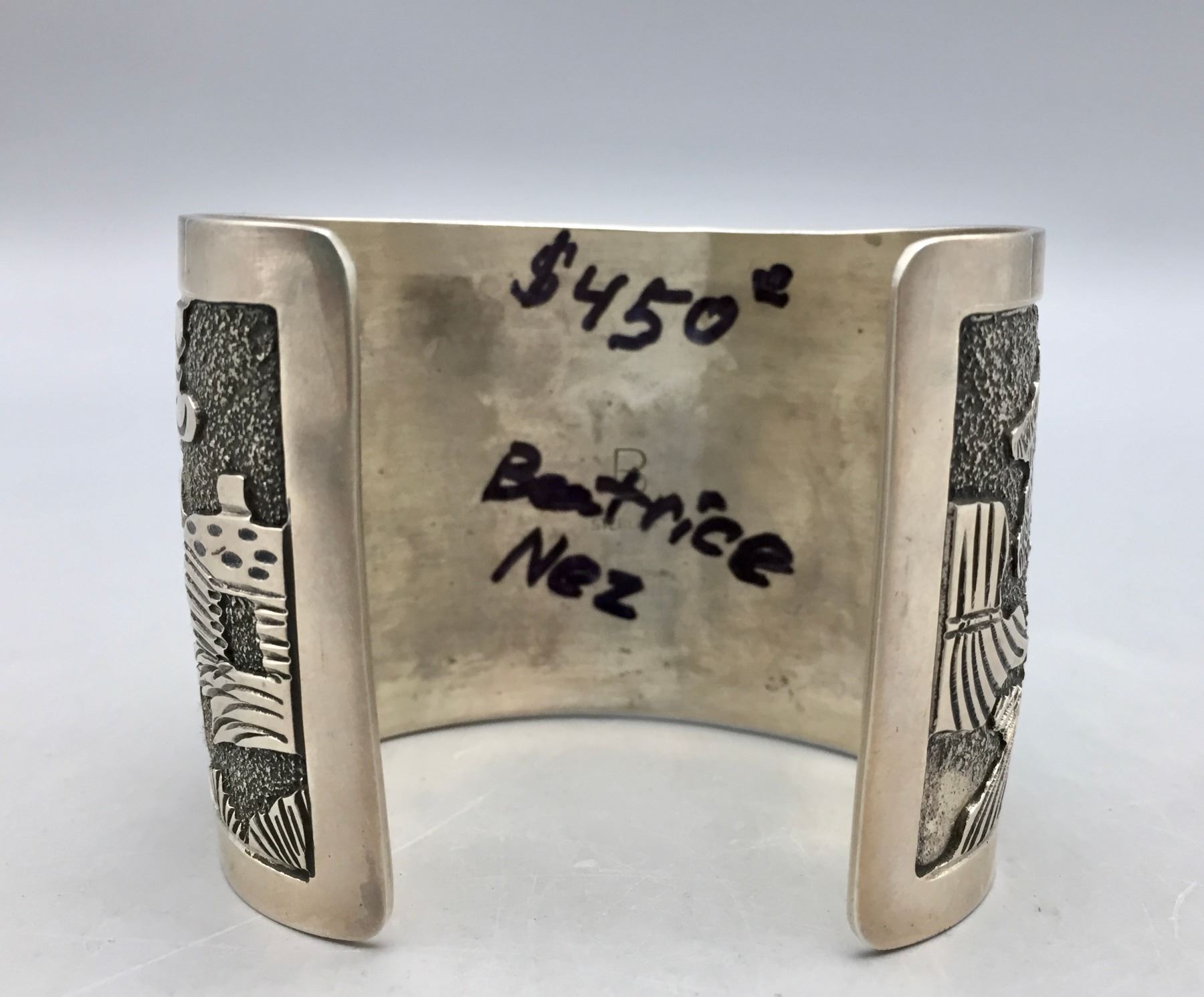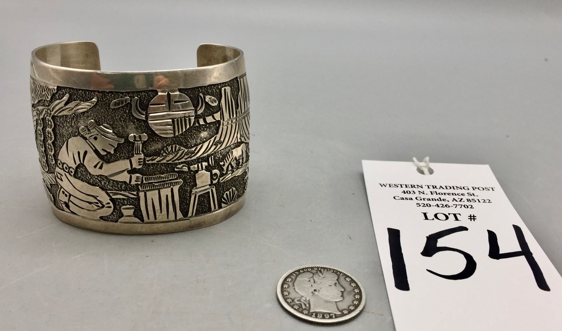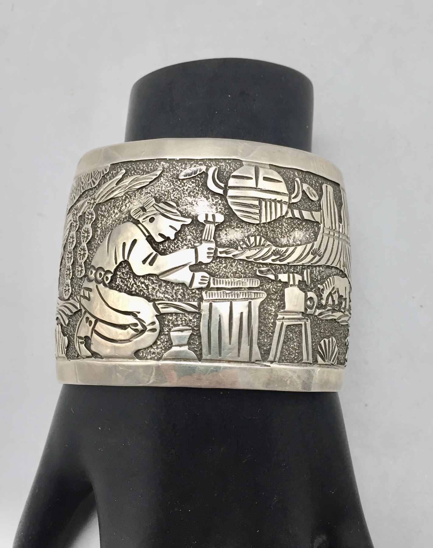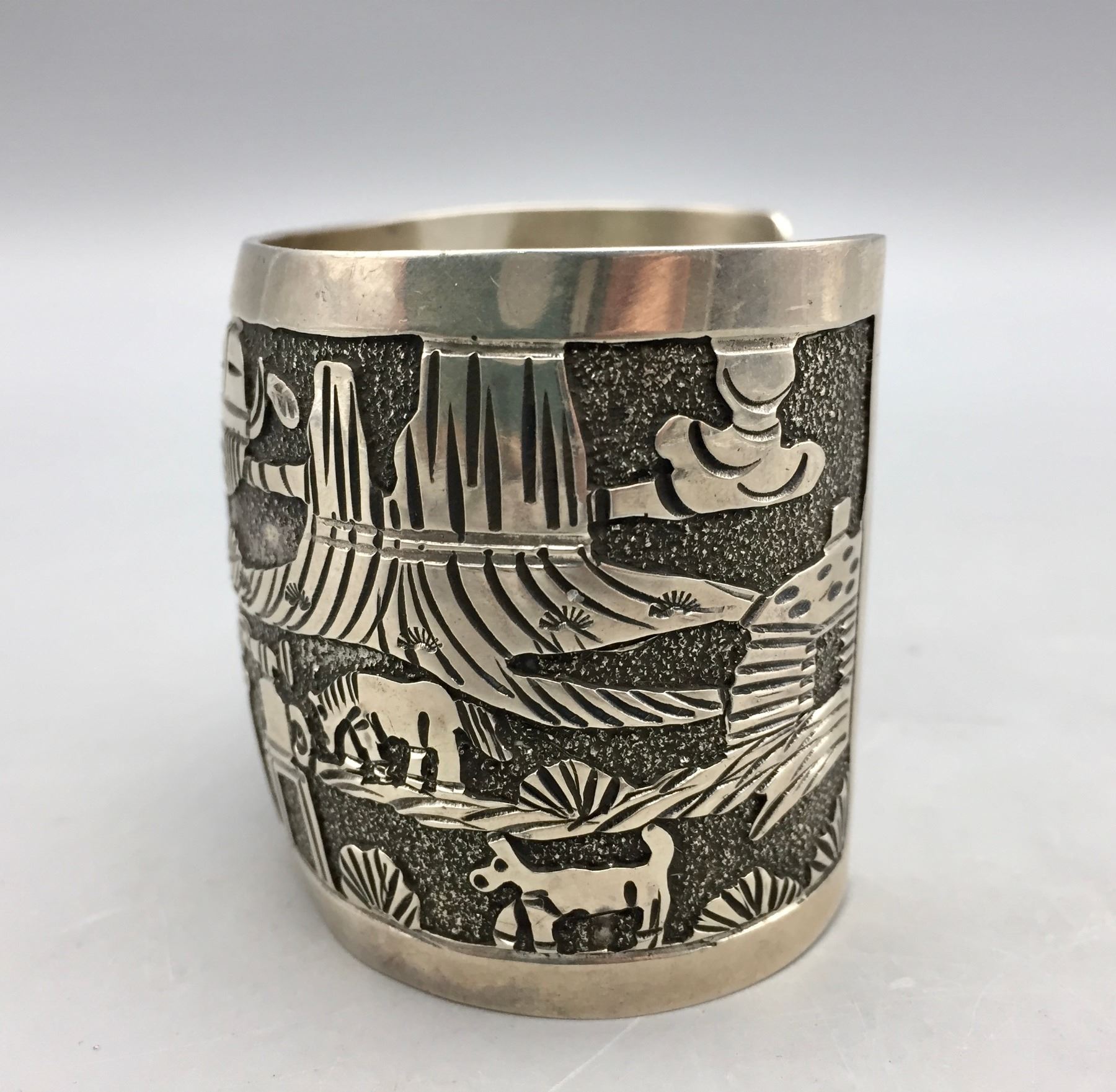 Description: Offered for sale in this lot is a large, overlay storyteller bracelet, marked as sterling silver. Maker: Hallmarked with a B.