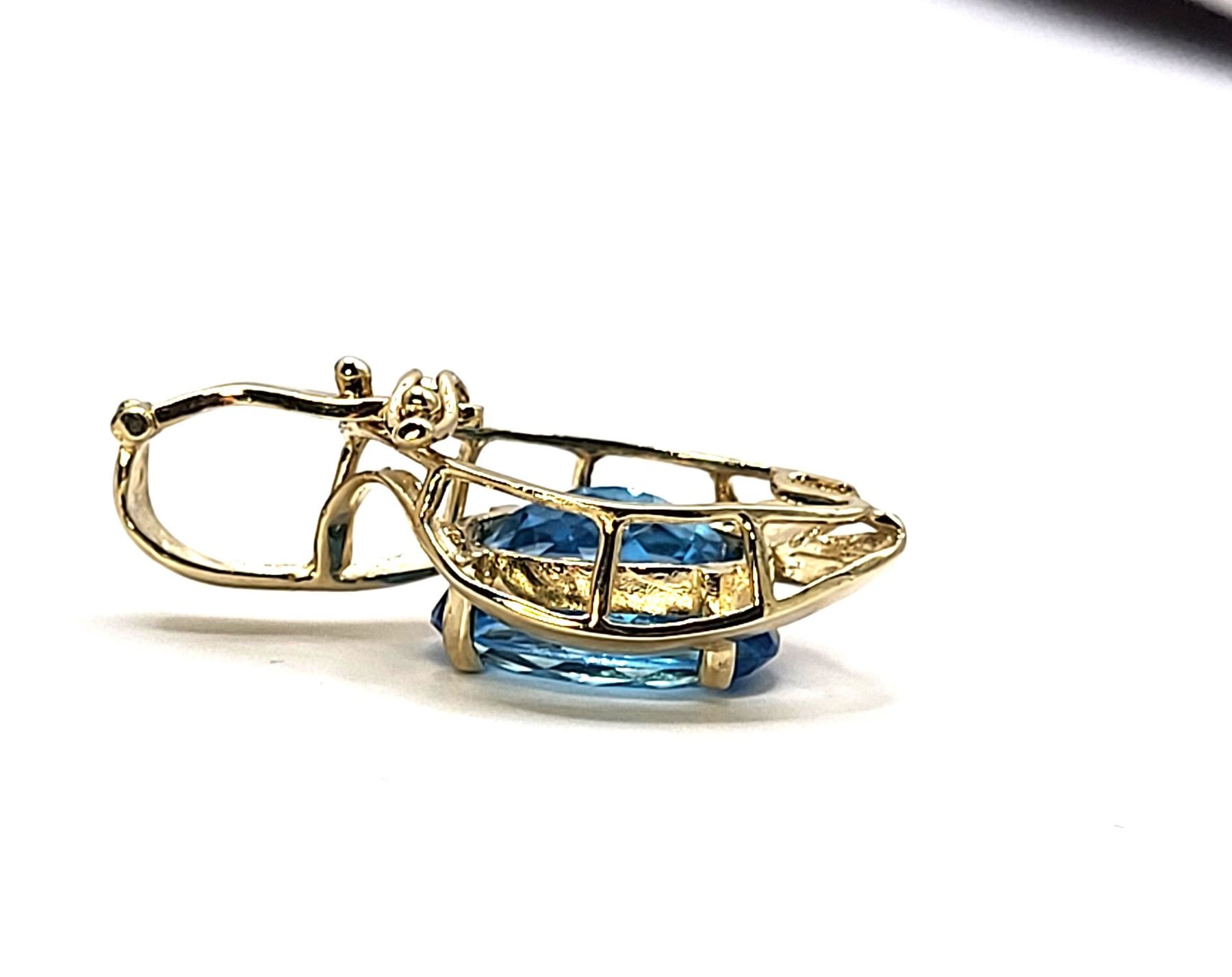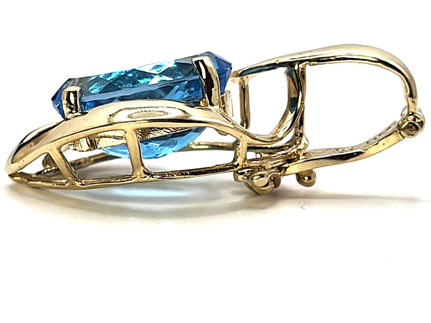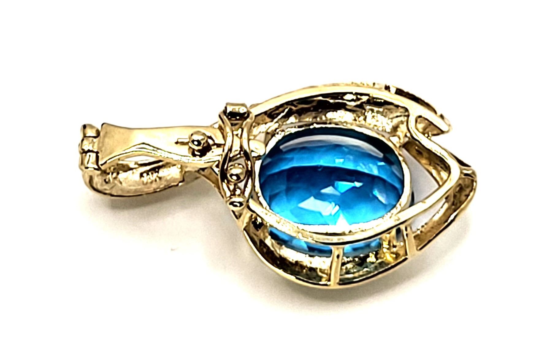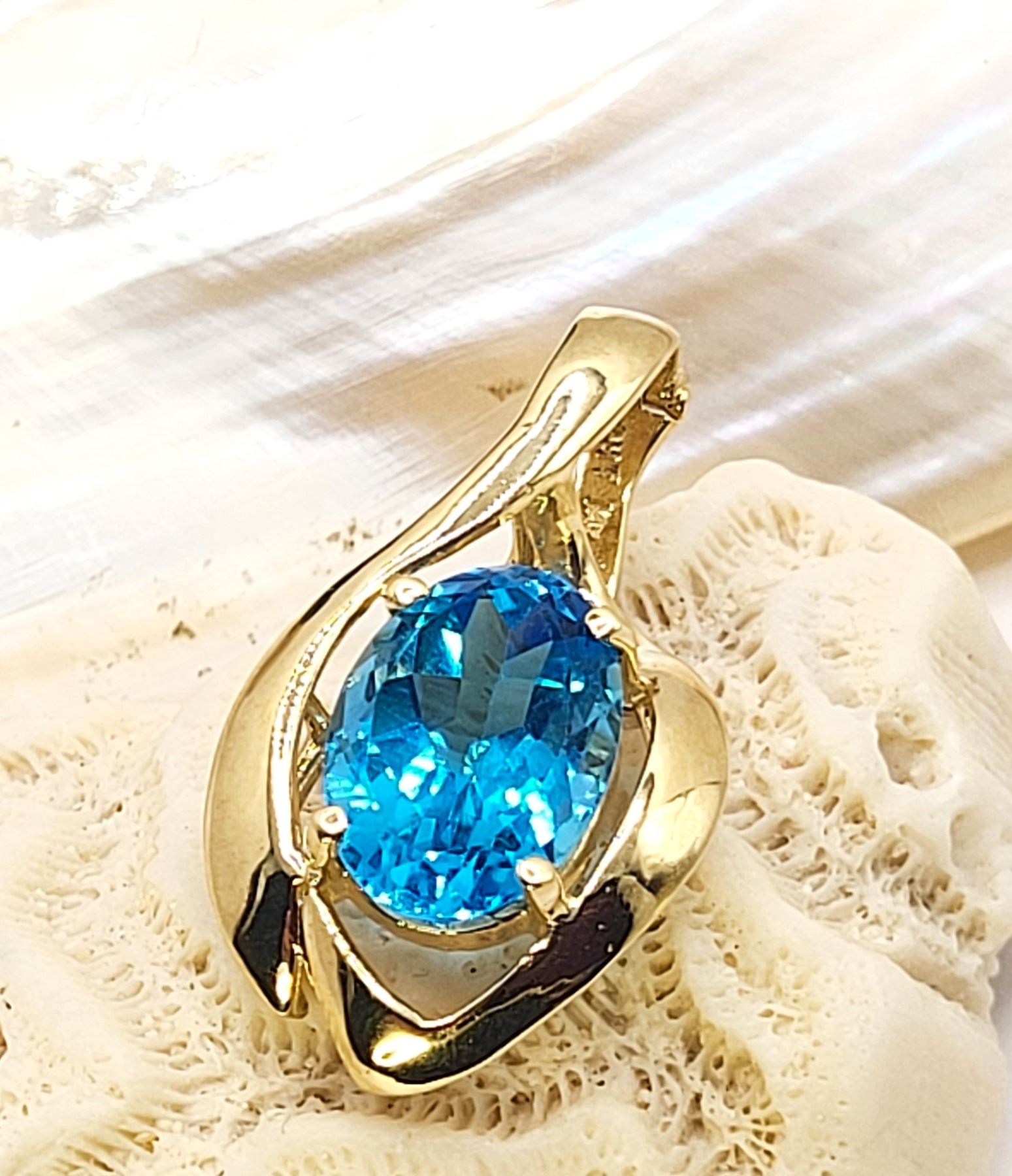 This 14 karat yellow gold pendant (or enhancer) features an approximate 7 or 8.00 Carat oval-cut, prong-set, genuine Swiss Blue Topaz with wide, sweeping ribbons of 14K yellow gold and a built-in hinged bail and a safety clip. approx 1.25& quot; long.& nbsp; Admin:33110-1lgt
