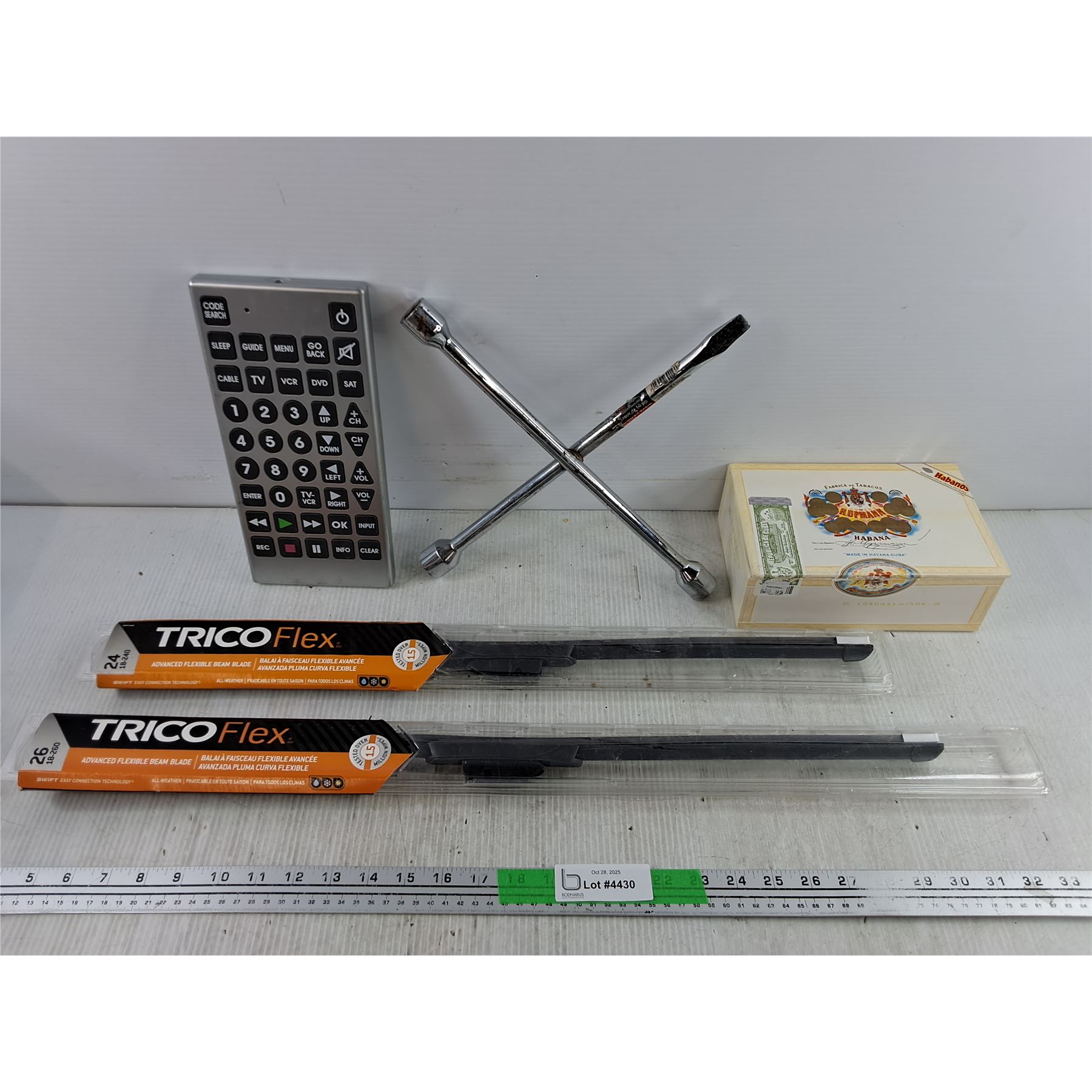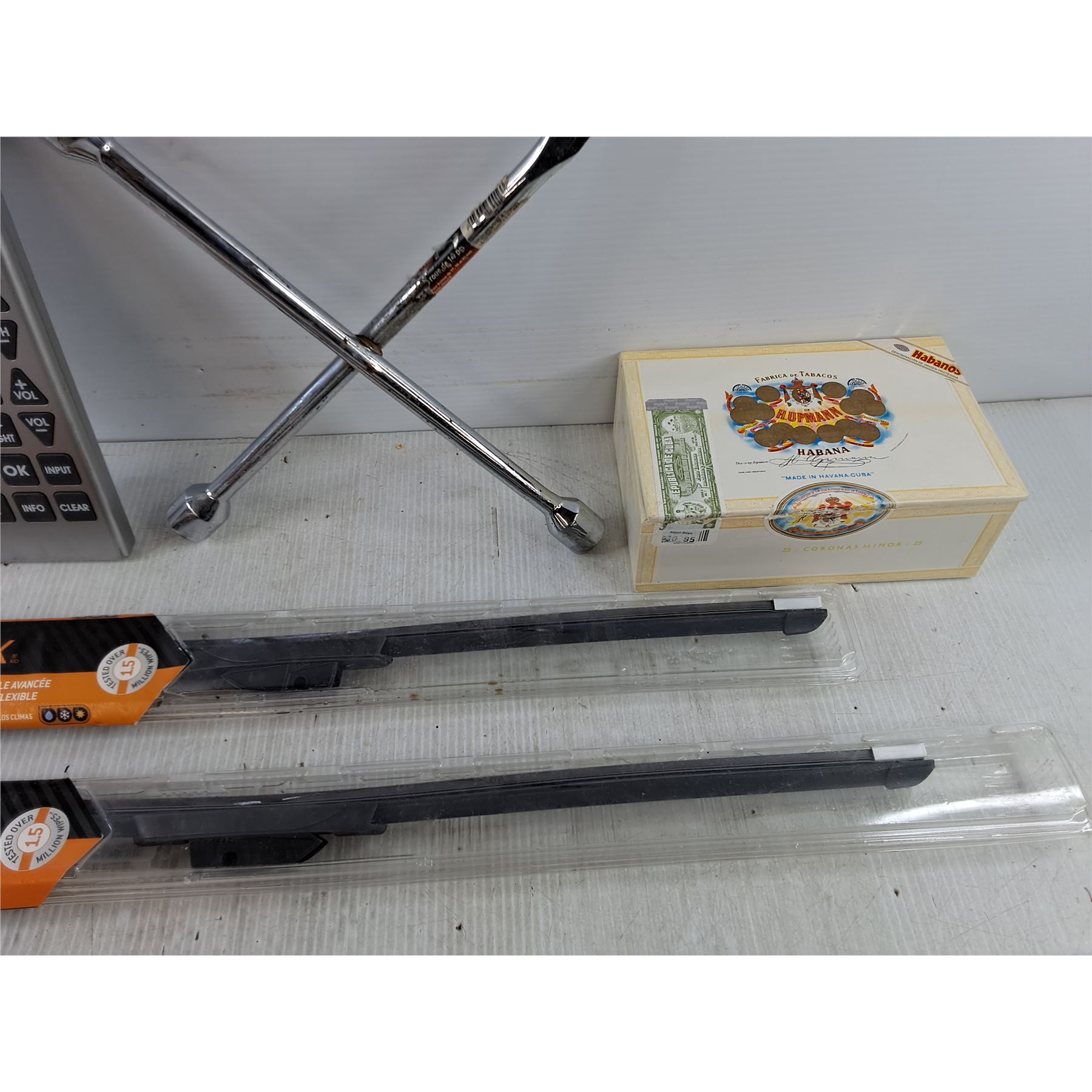 Large TV Remote, Lug Wrench, 26" & 24" TricoFlex Wipers, Empty Habana Cigar Box - PICK UP