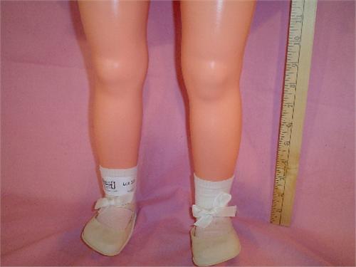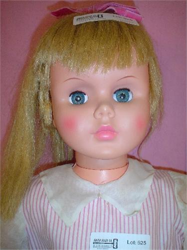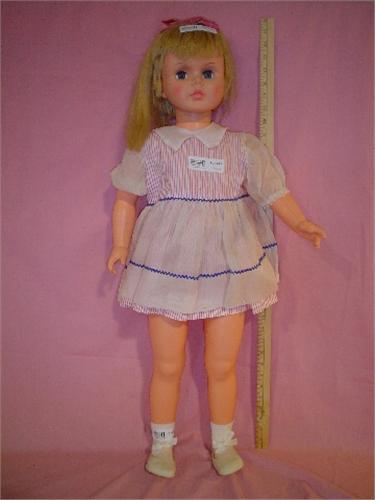 Large Tall Standing Doll. Pink striped Dress. Plastic/Vinyl. Working, moveable Eyes. Unmarked