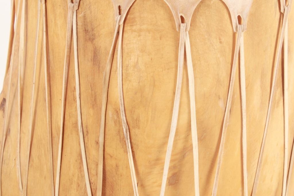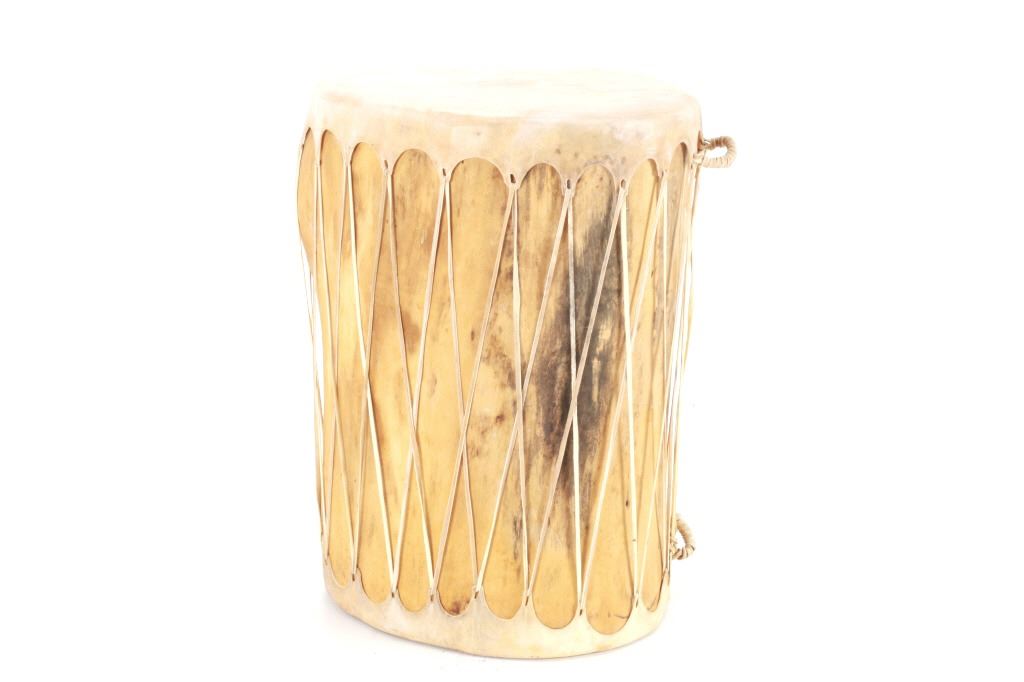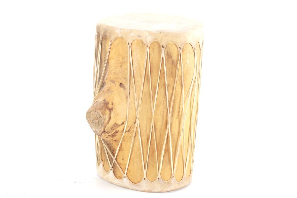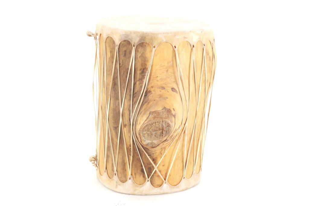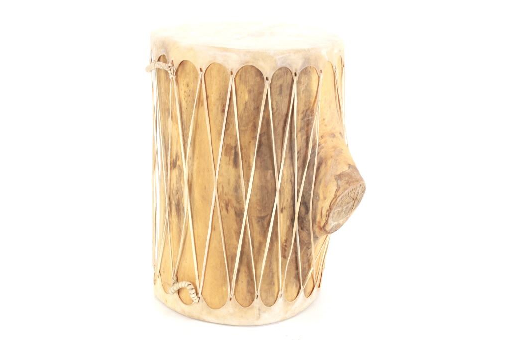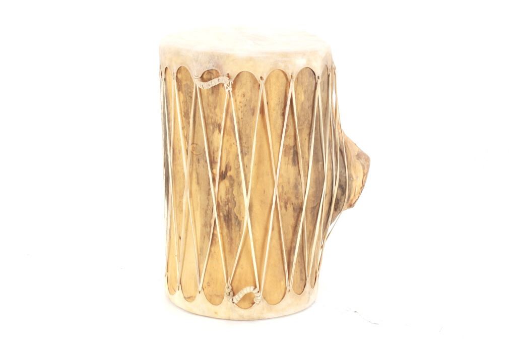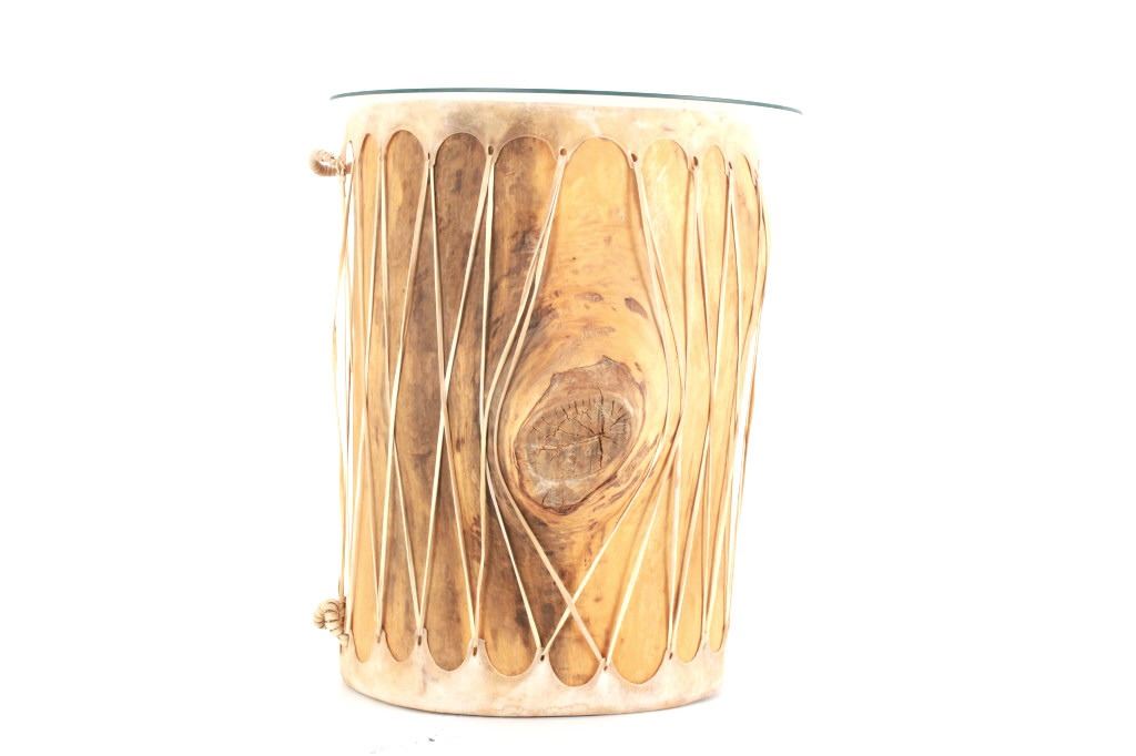 Featured in this lot is this Taos drum tall log carved wooden table. The table features a cut glass top that protects the wonderfully crafted Taos drum. The drum features a double sided stretched rawhide covering with a single log frame. The drum is all handmade from the Taos Drum workshop and is made by native craftsman artist from the Taos Pueblo ages-old tradition of drum making. The table is considered a one tree or one log drum as the drum is crafted from one large tree trunk which is burned and carved out at the center leaving the ridged wood outer core in one piece then covered in two rawhide Parfleche thick wraps, one on the top and bottom, which are wetted and stretched over the wood and tied with rawhide lacing which then all dries giving a taunt hard surface with amazing deep sounds. The condition of this Taos drum table is good with slight wear to the foot of the drum but otherwise is in good overall condition. The measurements of this drum table are 32" x 25" x 24".