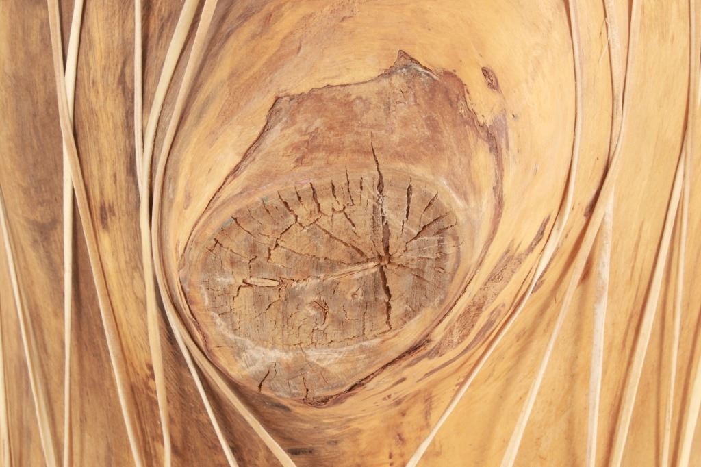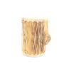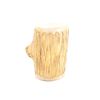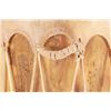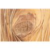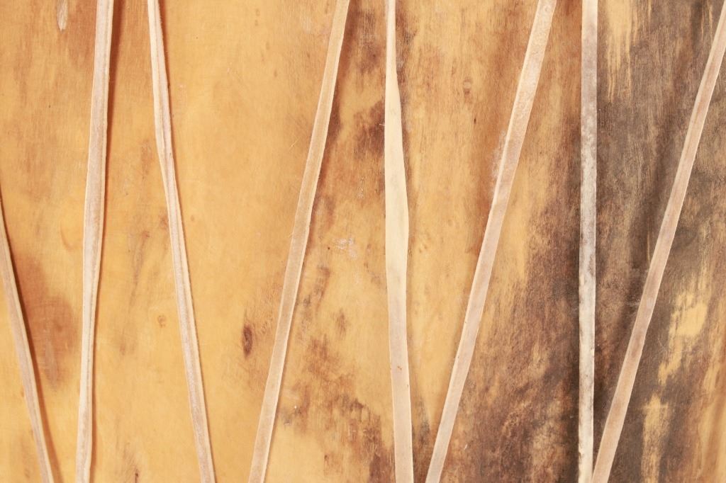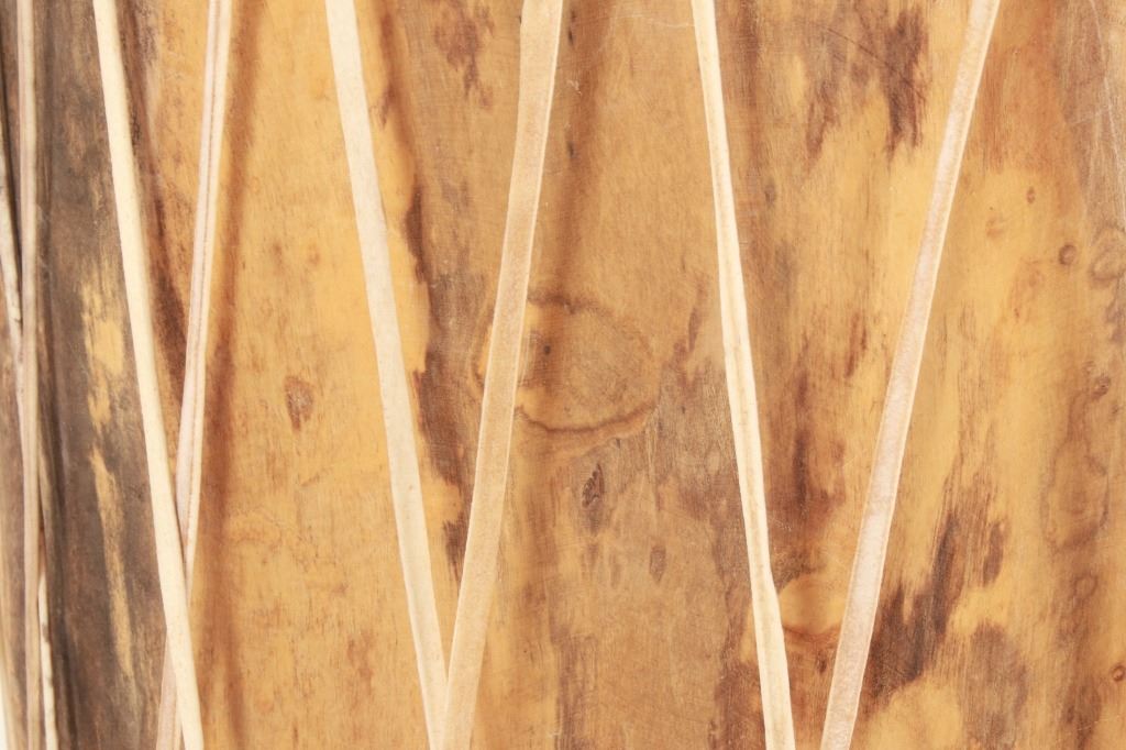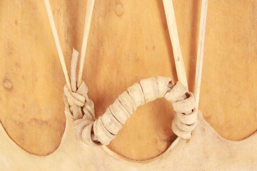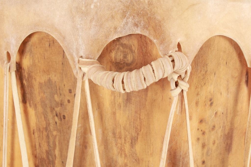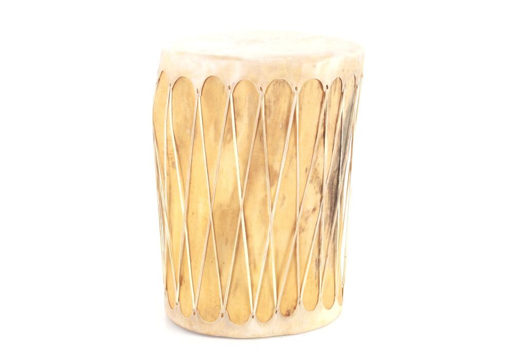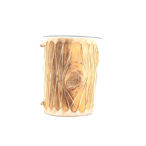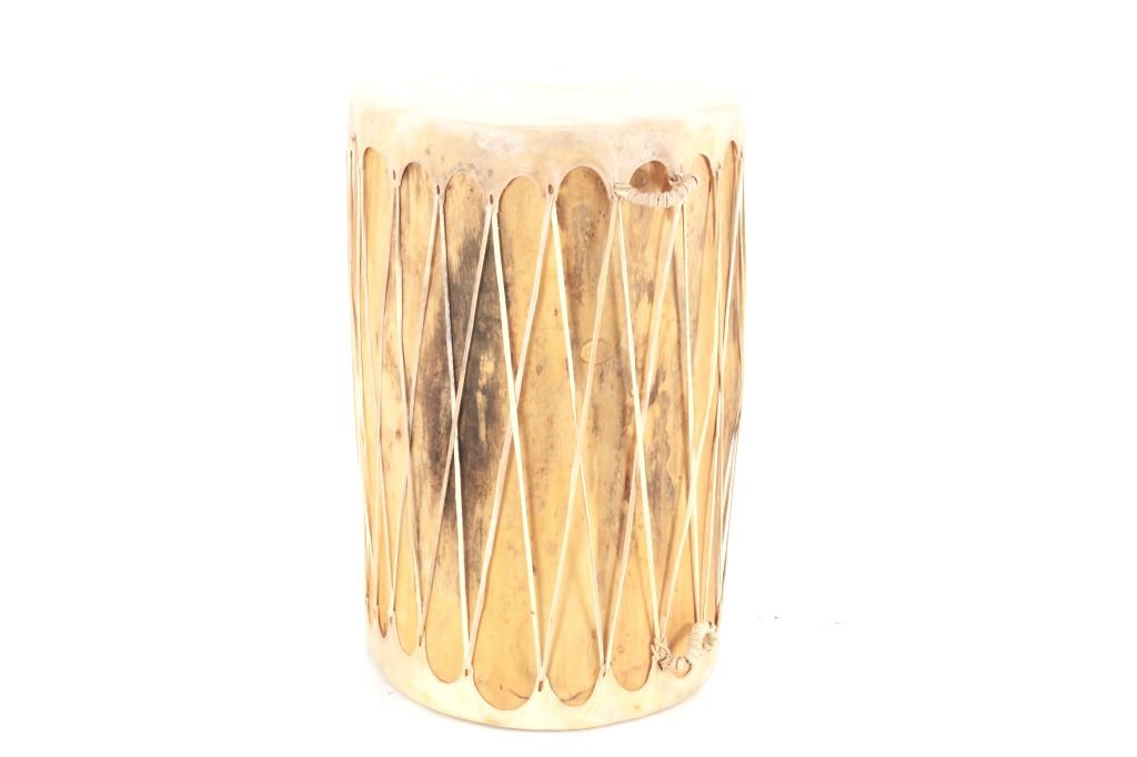 Featured in this lot is this Taos drum tall log carved wooden table. The table features a cut glass top that protects the wonderfully crafted Taos drum. The drum features a double sided stretched rawhide covering with a single log frame. The drum is all handmade from the Taos Drum workshop and is made by native craftsman artist from the Taos Pueblo ages-old tradition of drum making. The table is considered a one tree or one log drum as the drum is crafted from one large tree trunk which is burned and carved out at the center leaving the ridged wood outer core in one piece then covered in two rawhide Parfleche thick wraps, one on the top and bottom, which are wetted and stretched over the wood and tied with rawhide lacing which then all dries giving a taunt hard surface with amazing deep sounds. The condition of this Taos drum table is good with slight wear to the foot of the drum but otherwise is in good overall condition. The measurements of this drum table are 32" x 25" x 24".