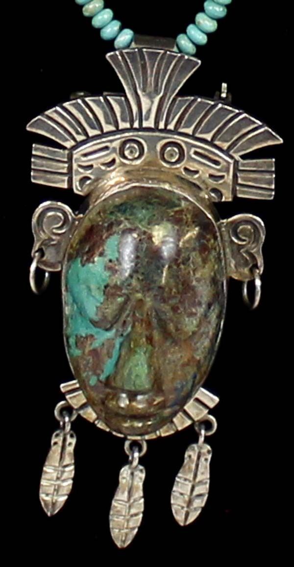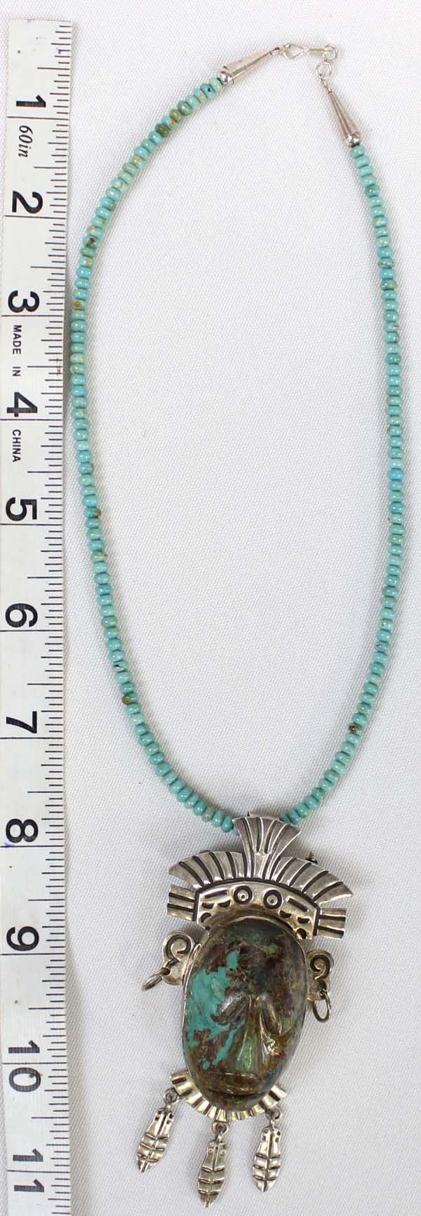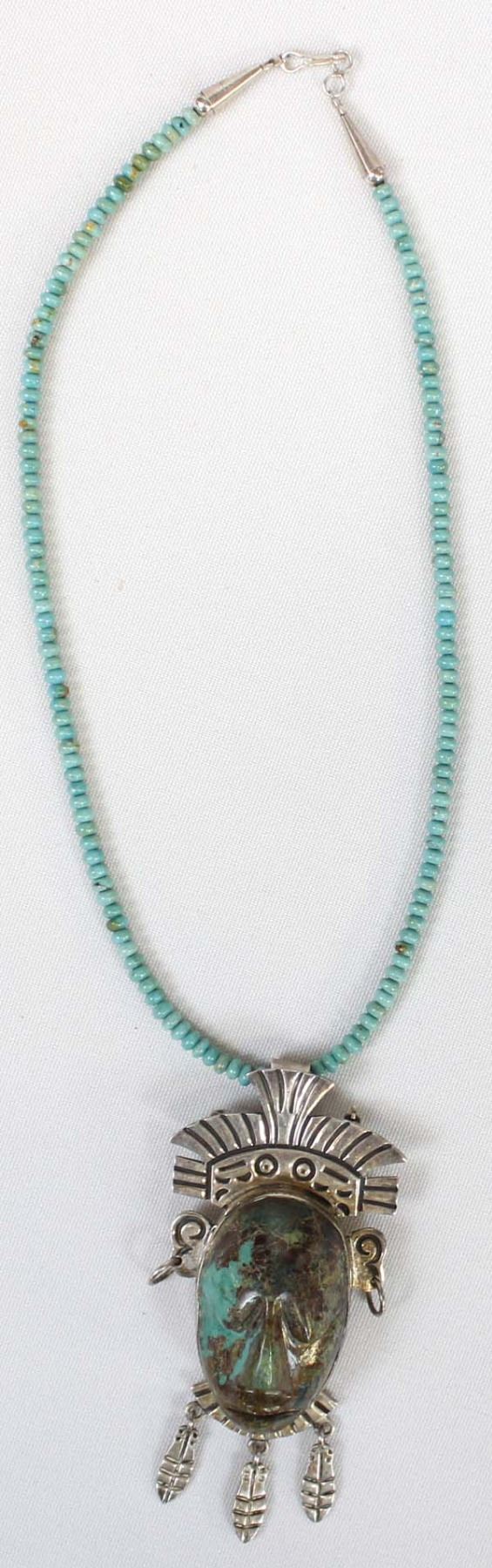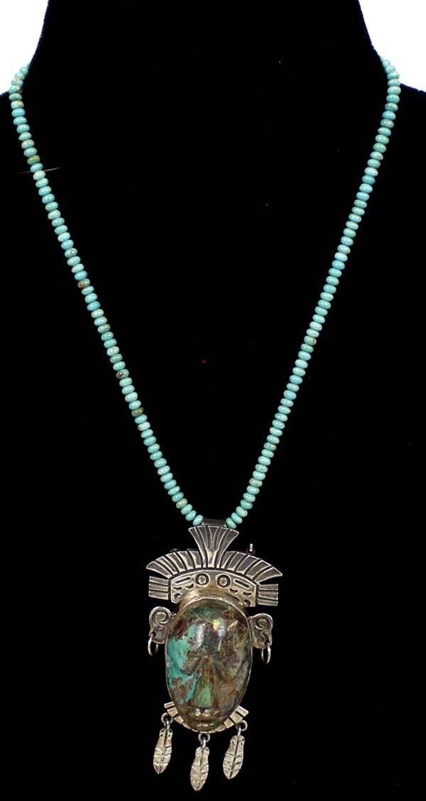 Large Taxco Sterling Turquoise Pin Pendant Necklace, pendant measures 3.75'' x 2'' and is stamped .925 and hallmarked, the Navajo Rondelle Turquoise Bead Necklace measures 17.5''L end to end and has sterling cones and clasp, total gram wt of 69.5, stunning turquoise